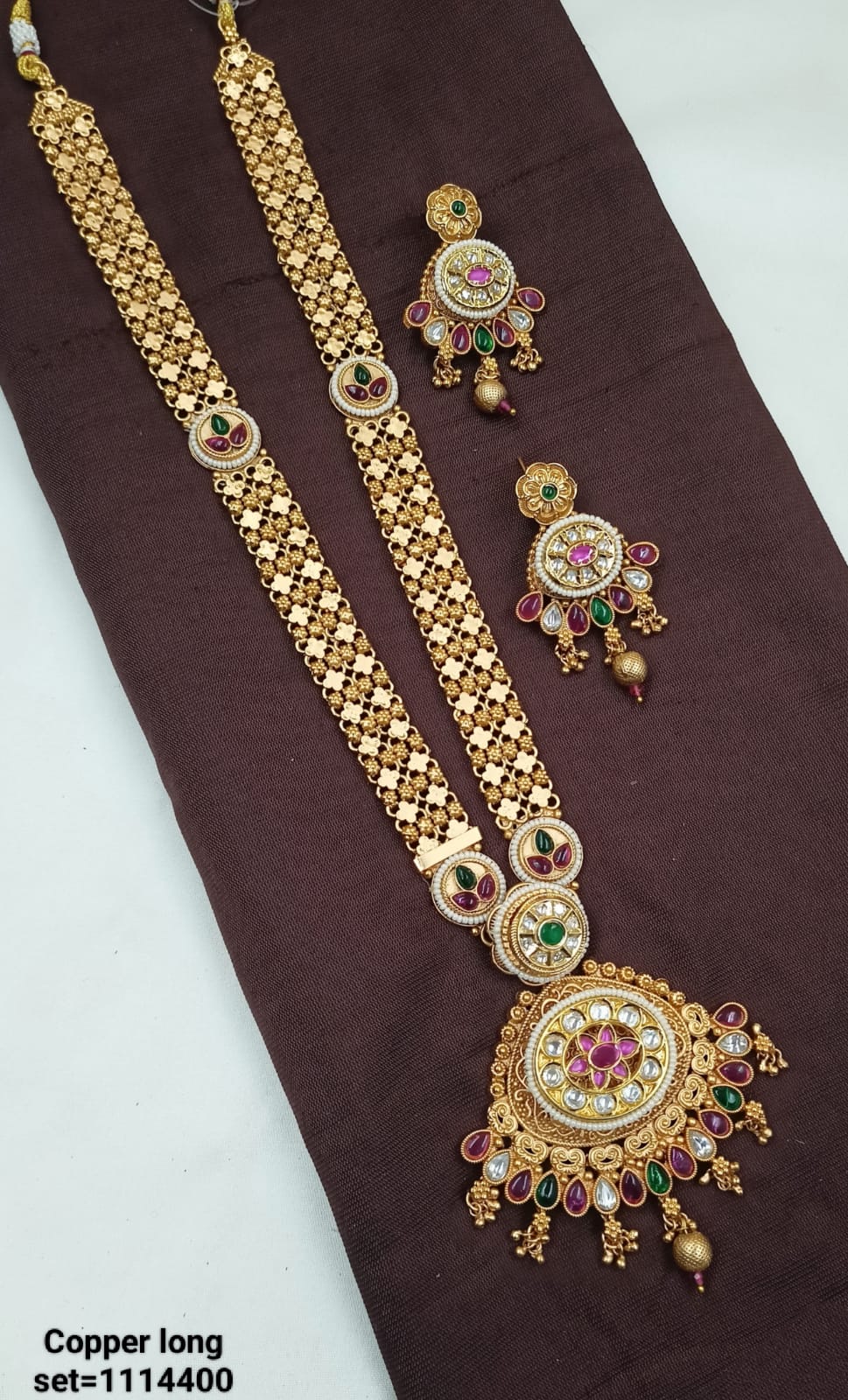 Elevate your ethnic style with this stunning Bridal Temple Long Necklace Set from LucentEmarket. Expertly crafted with traditional copper finish, this handcrafted set features intricate Kundan work, bead embellishments, and classic temple motifs. Designed to pair beautifully with sarees, lehengas, or bridal outfits, it adds timeless elegance to weddings, festivals, and grand celebrations.