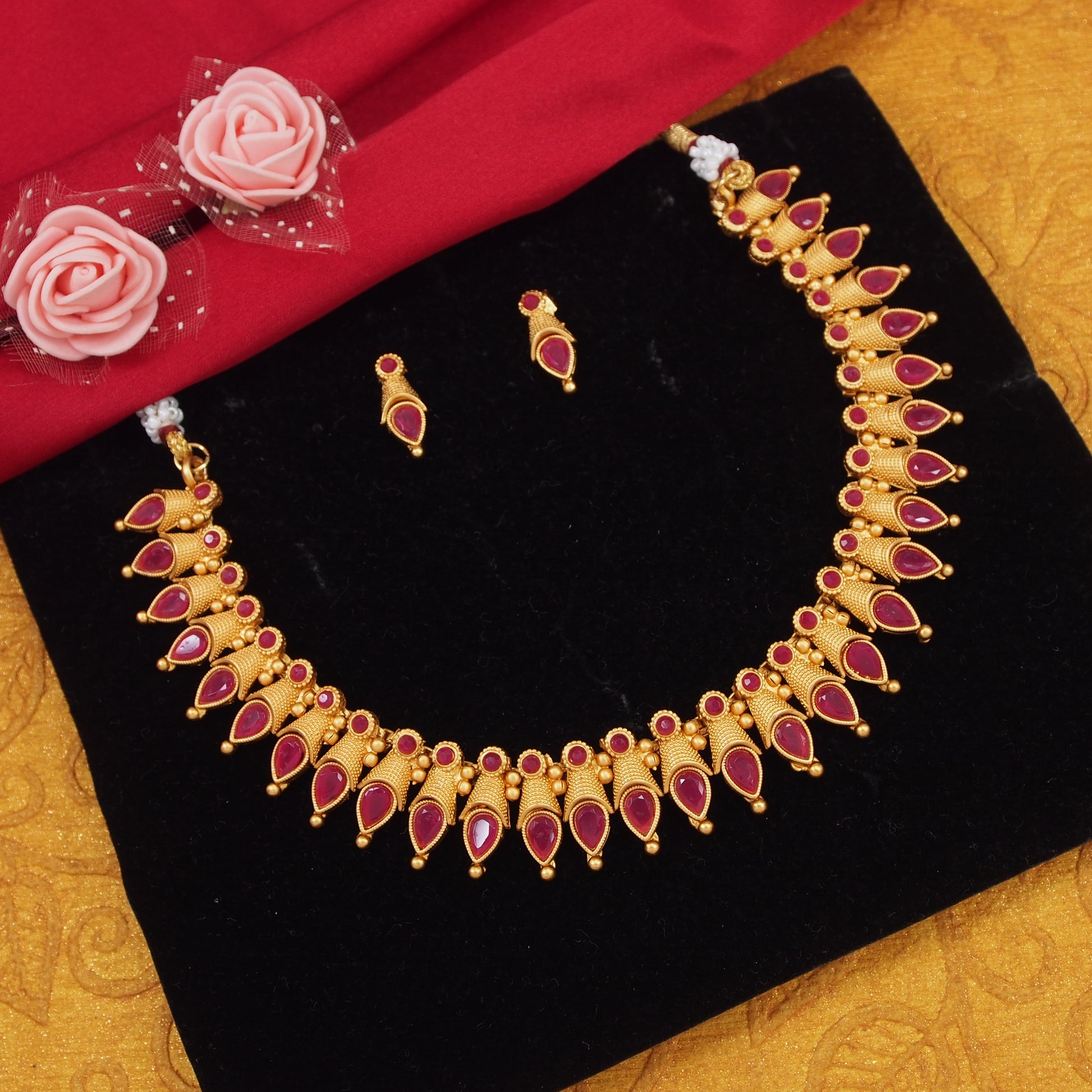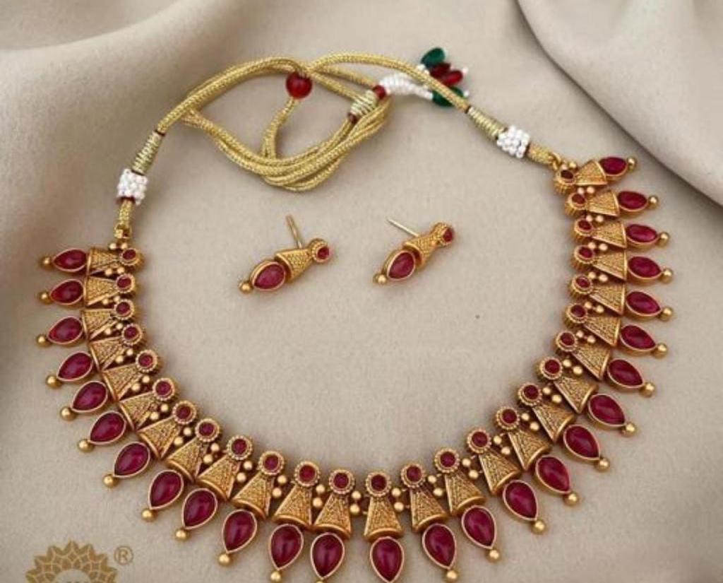 Classic And Fancy Gold Plated Tear Dropped Temple Choker Necklace With Earring Jewellery Set For Women And Girls