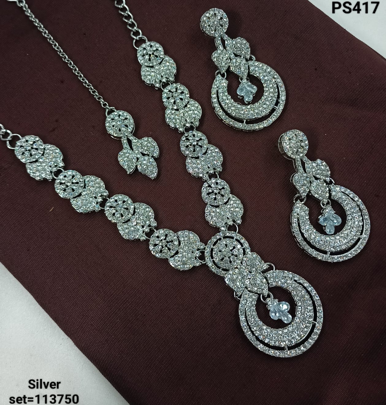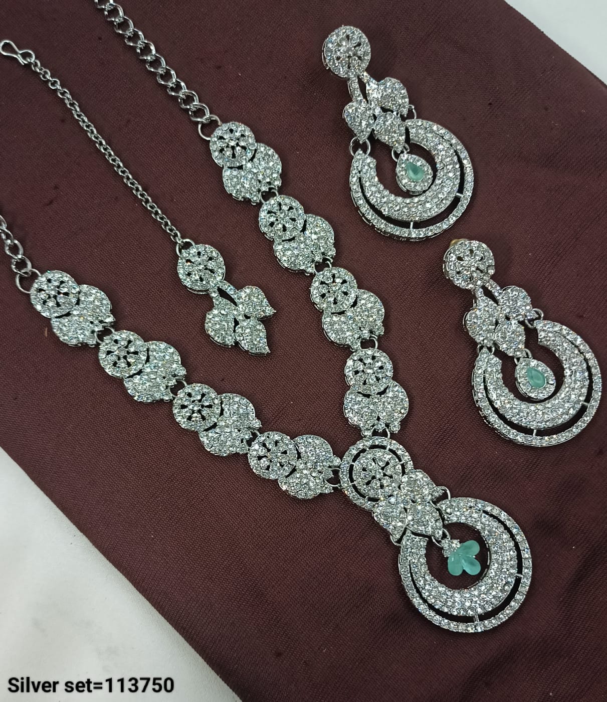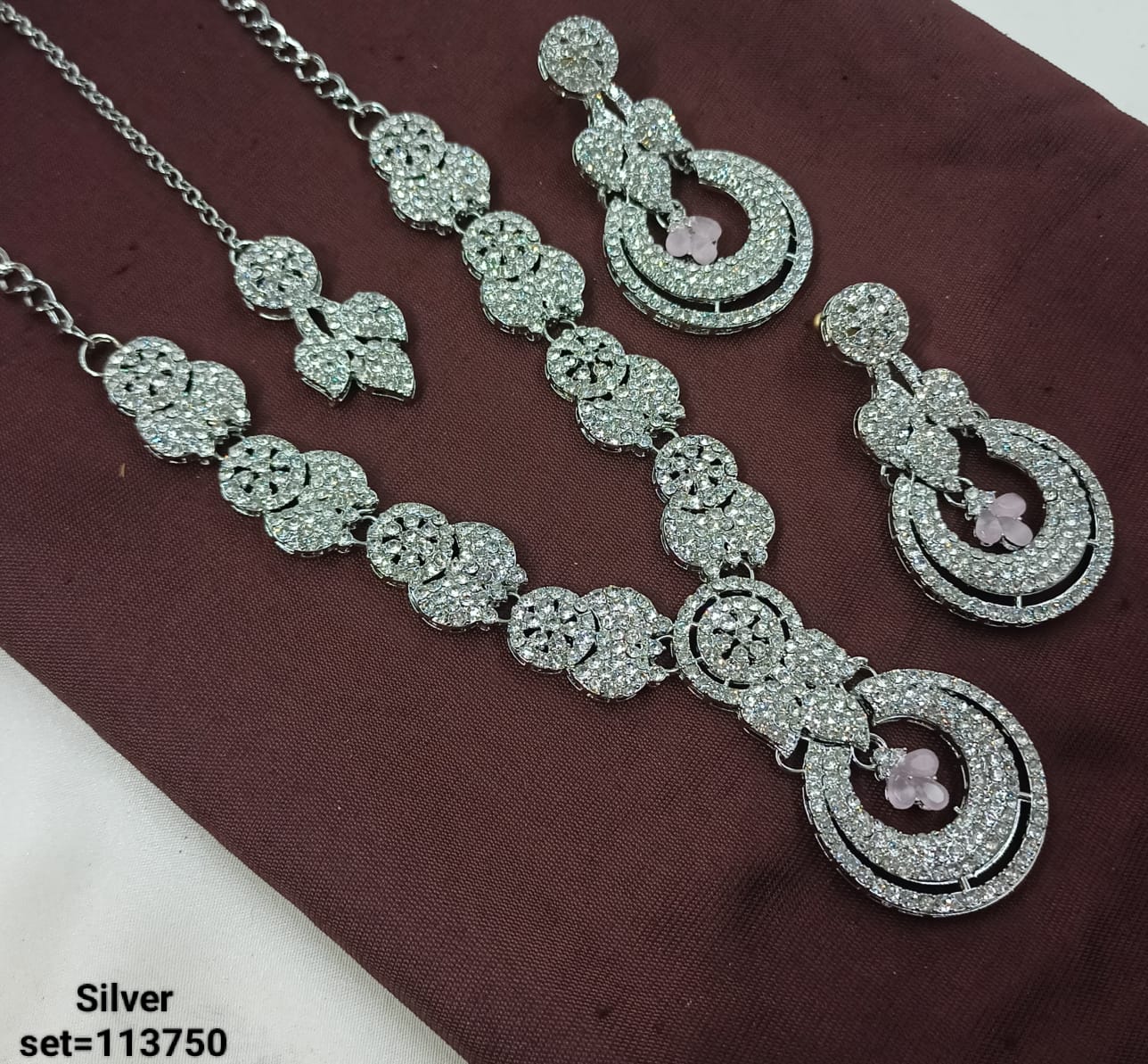 Refined and timeless, the Classic Silver Necklace & Earrings Set is the perfect accessory for those who appreciate understated elegance with luxurious detail. This beautifully balanced set features a symmetrical arrangement of round floral motifs leading into a graceful circular pendant design, all encrusted with brilliant stones. Lightweight yet eye-catching, it’s ideal for weddings, receptions and elegant events.