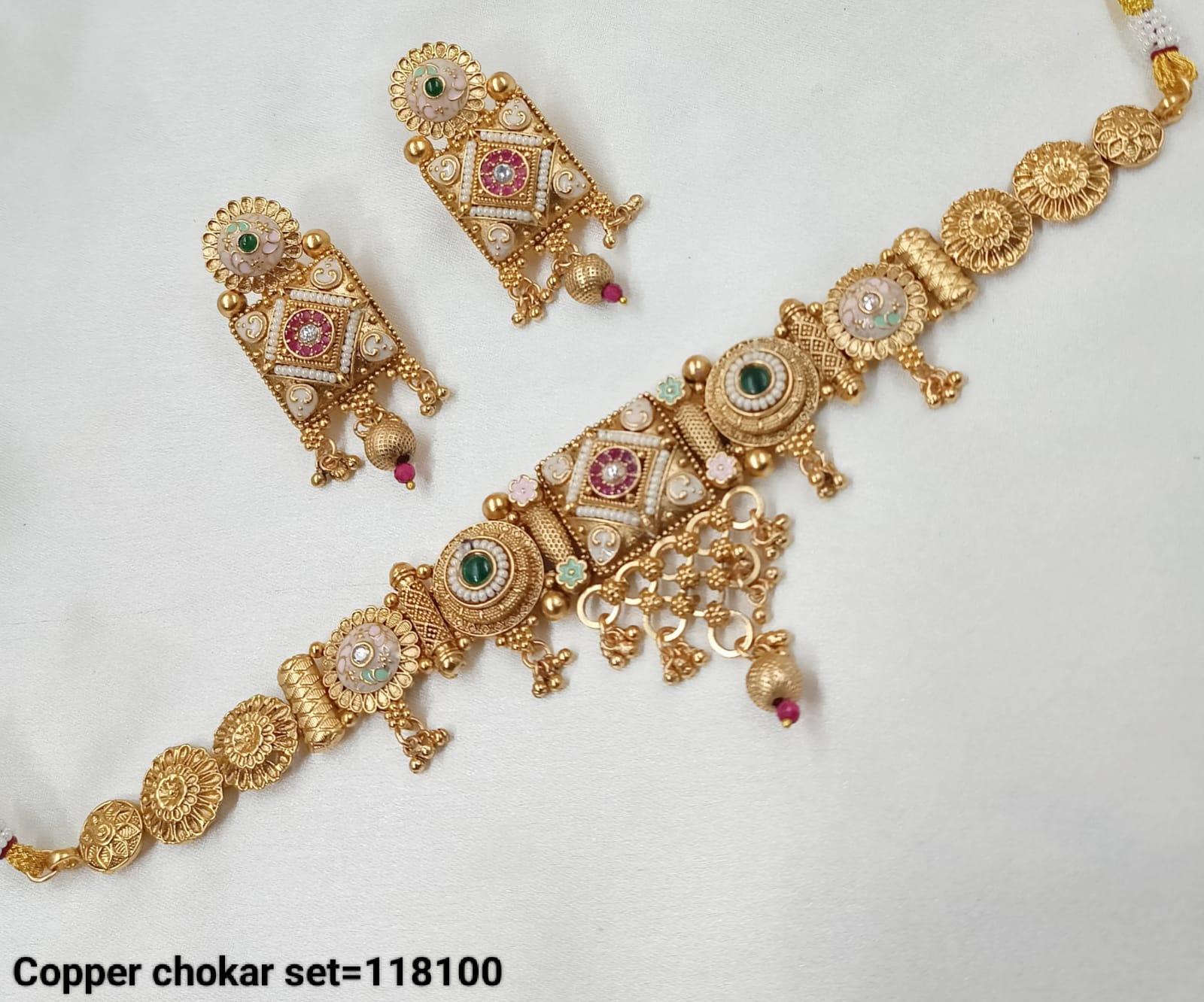 This choker necklace set features a refined design crafted from copper with a luxurious gold plating.
