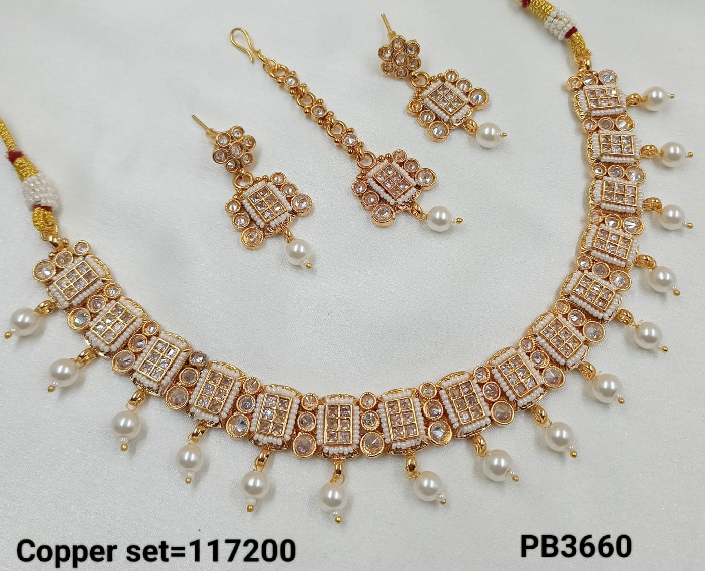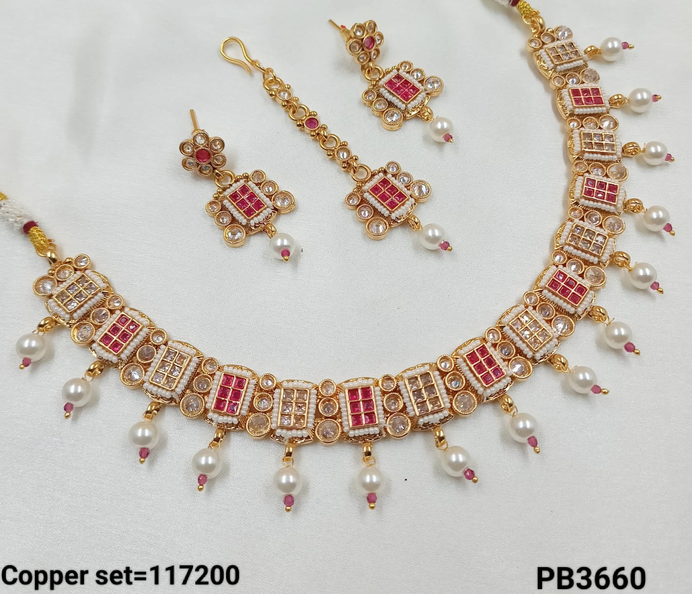 Elevate your elegance with this intricately designed necklace set featuring a refined copper base enhanced by a luxurious gold polish finish.