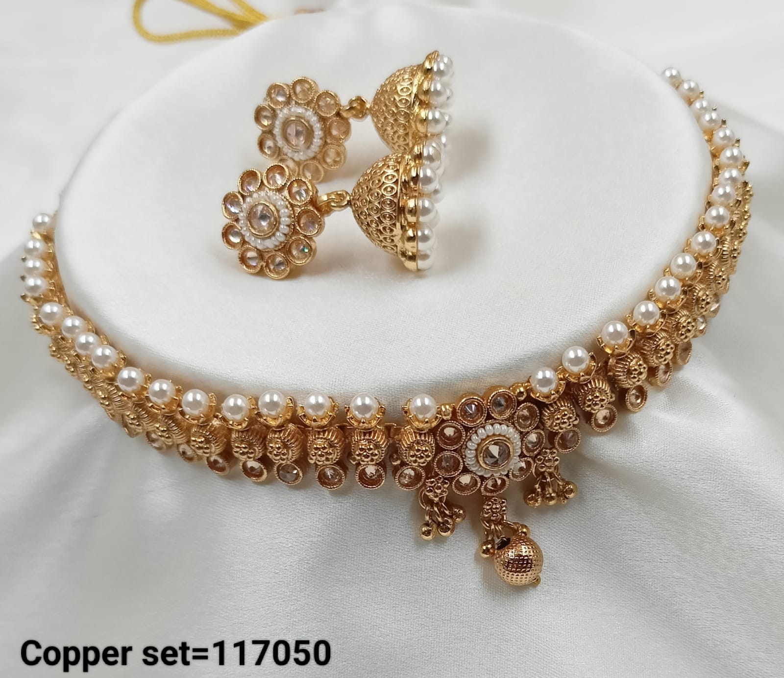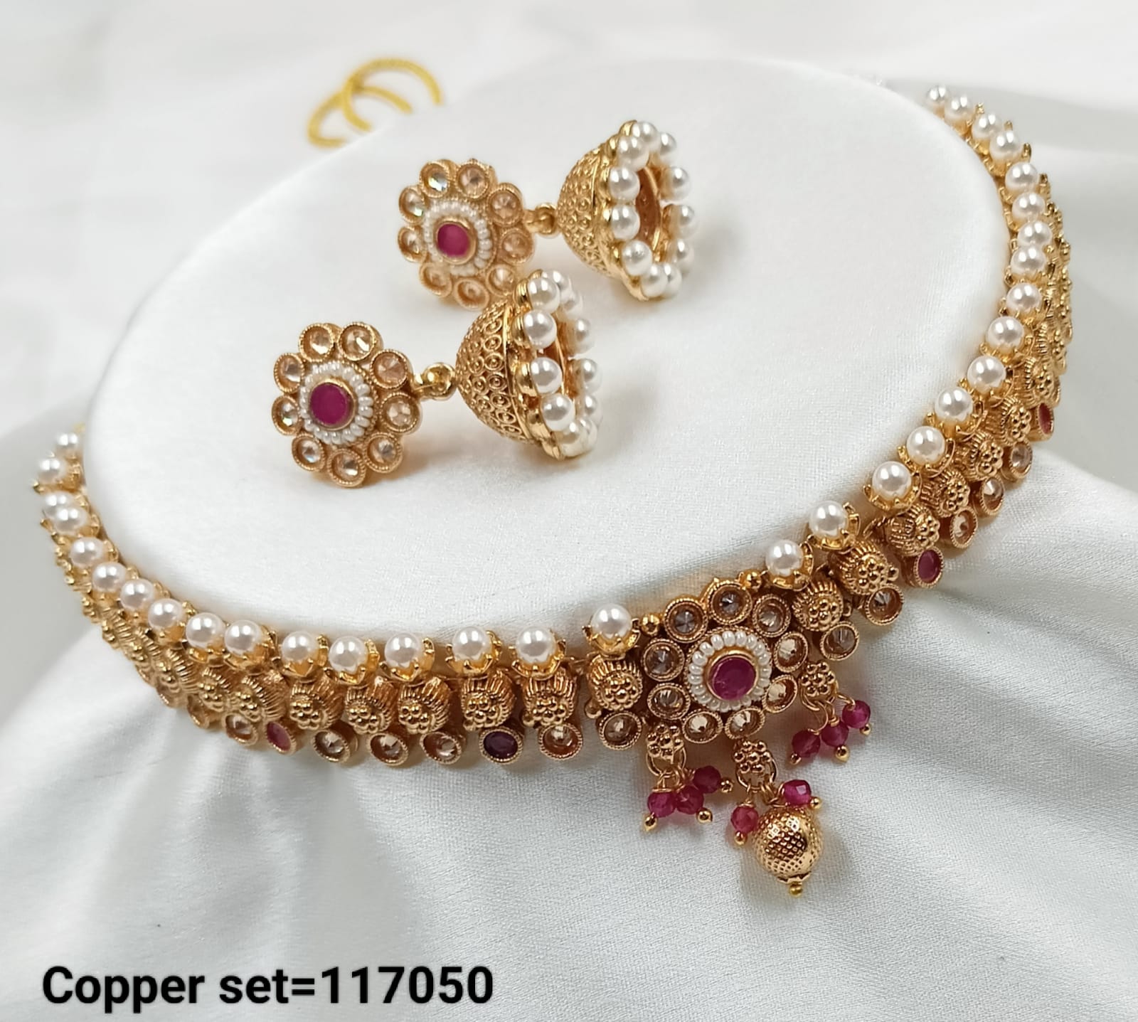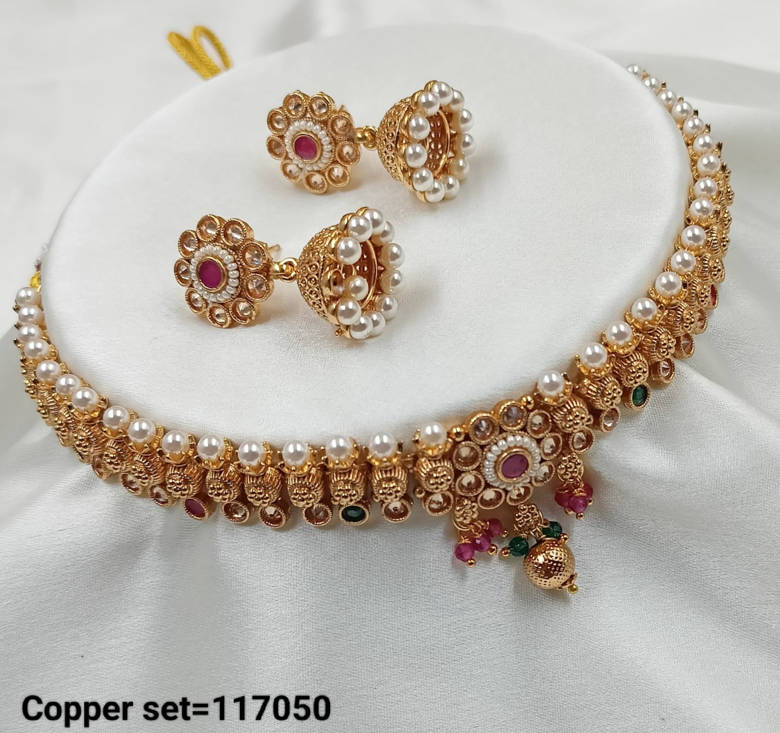 This traditional necklace set features a copper base with a gold polish finish, combining classic design with enduring elegance.
