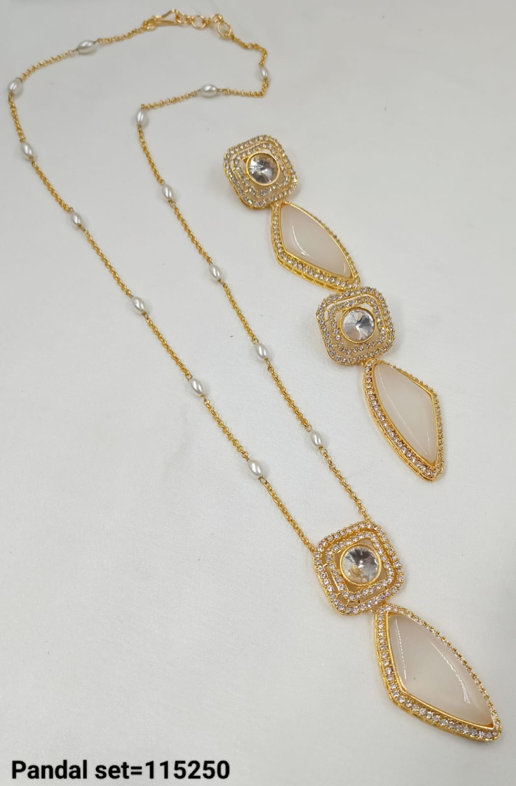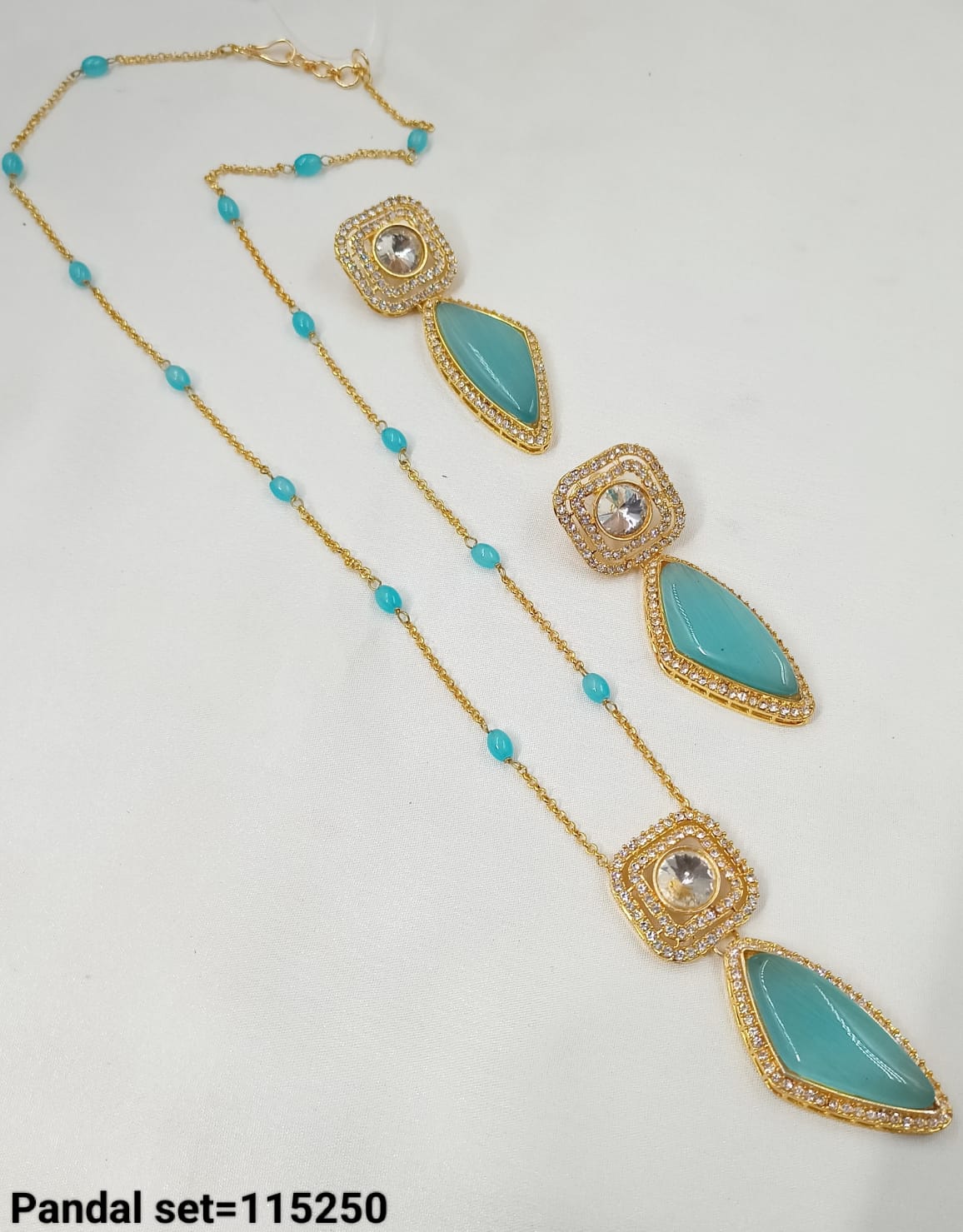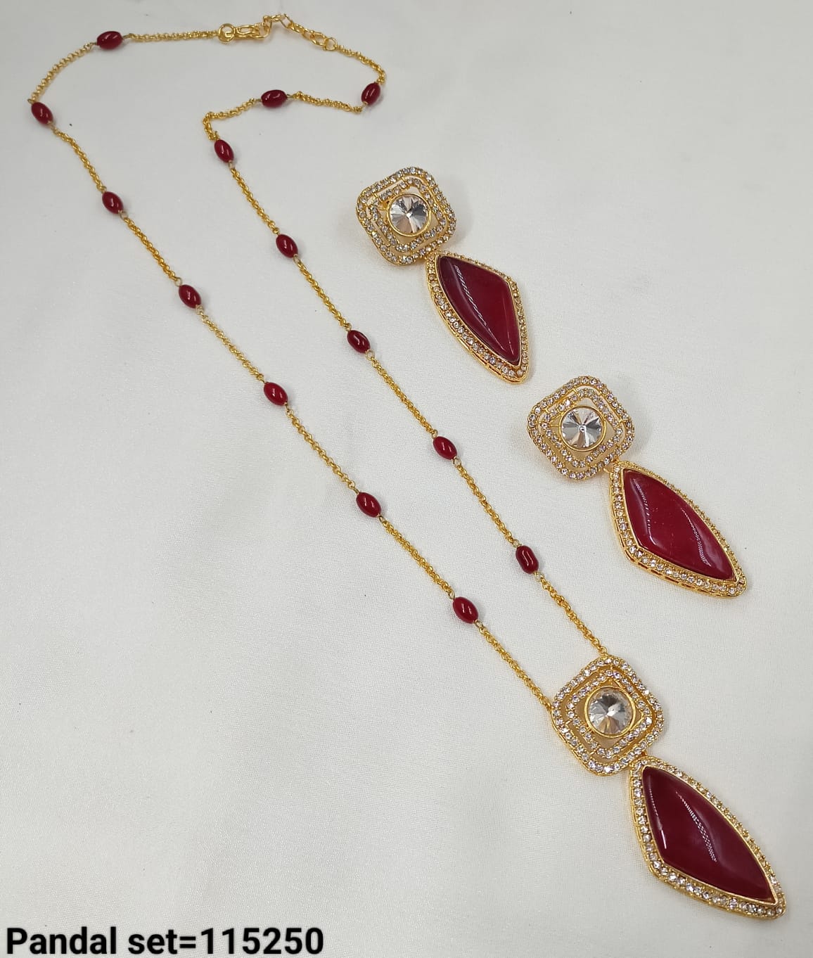 Elevate your elegance with this exquisite Kundan pendant set, featuring a crystal-adorned design finished in luxurious gold plating.