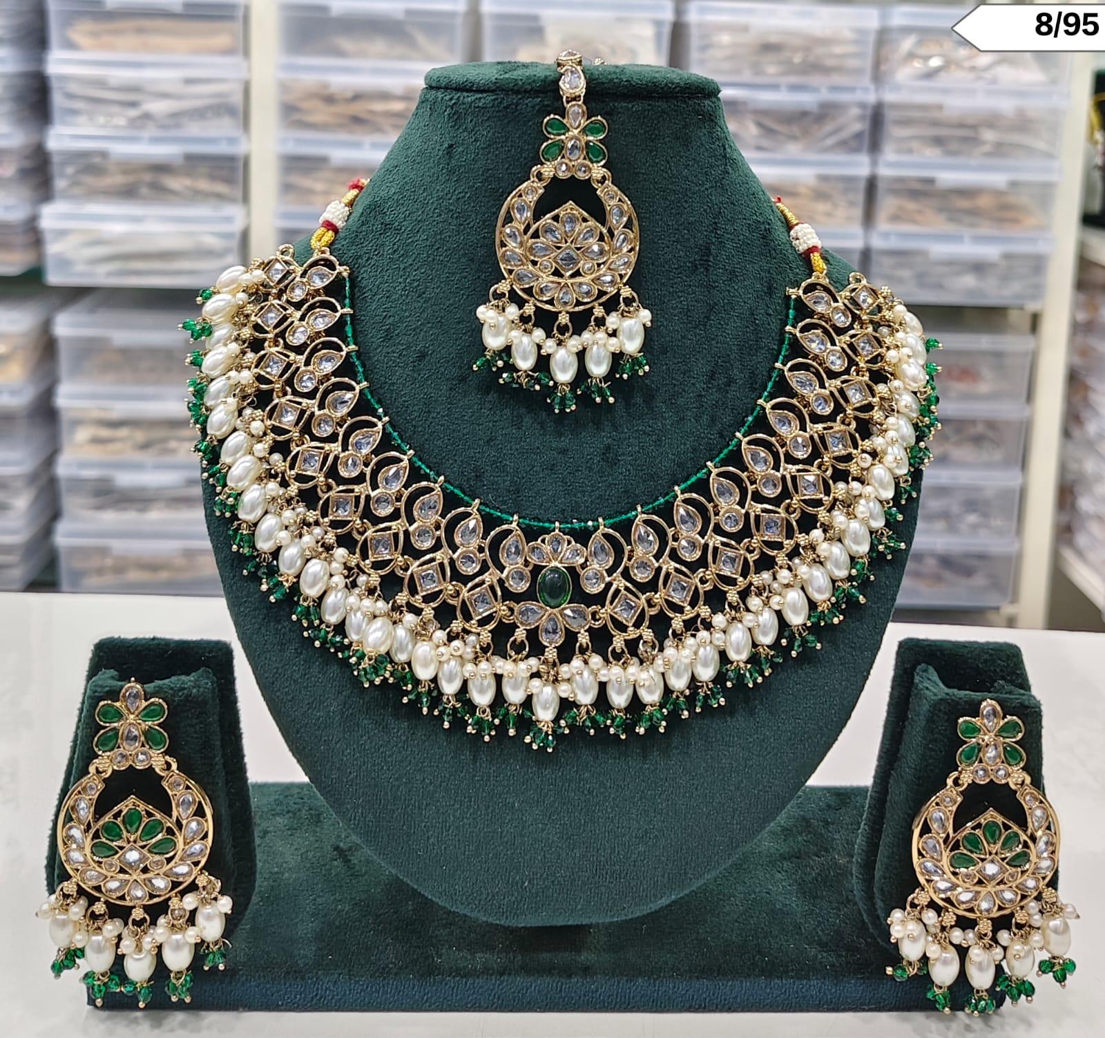 CZ Pearl Choker Necklace Set with Matching Earrings and Maang Tikka – Bridal & Ethnic Jewellery