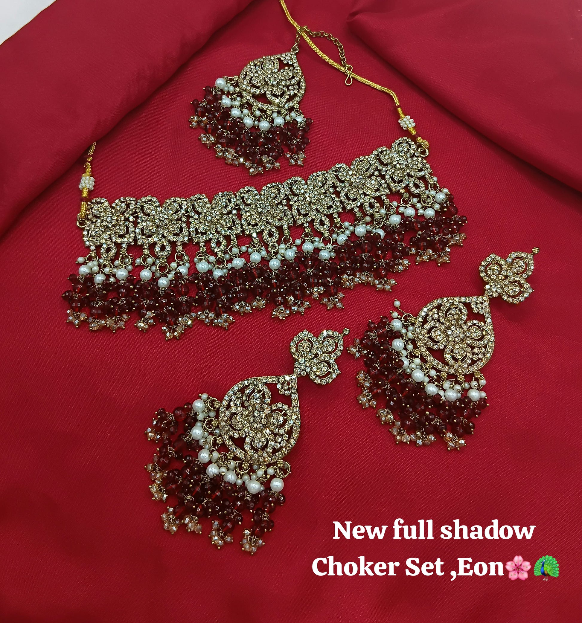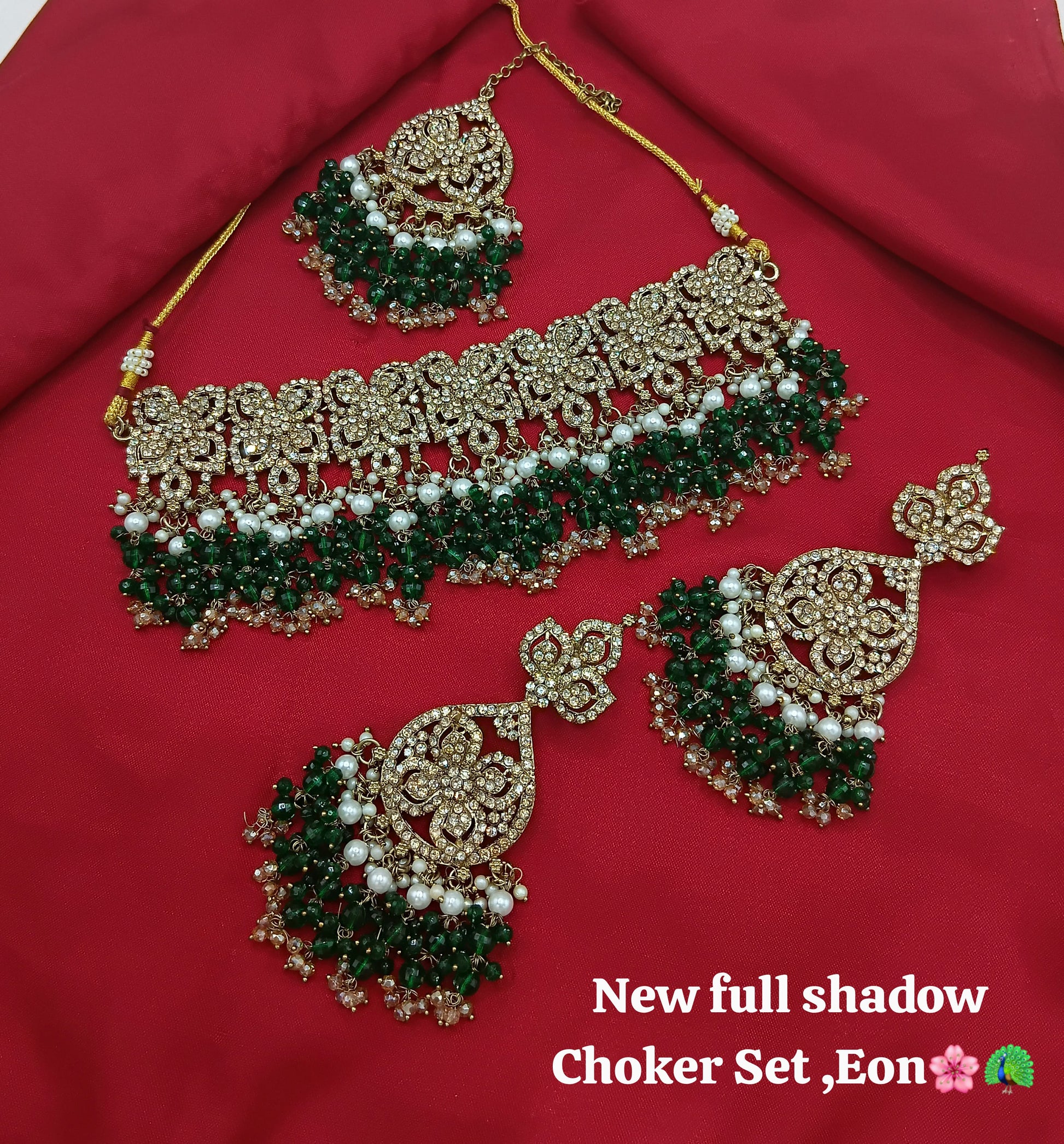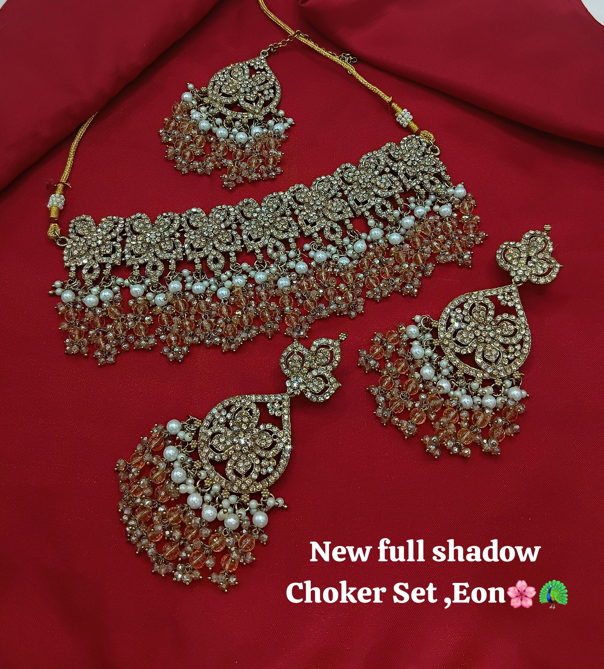 Elevate your traditional look with this designer floral choker set, intricately adorned with sparkling CZ stones, lustrous pearls, and vibrant beads. Crafted with precision, this full-coverage design offers a regal appeal, perfect for weddings, festive occasions, and cultural celebrations. The matching statement earrings complete the ensemble, ensuring you shine with elegance from every angle.