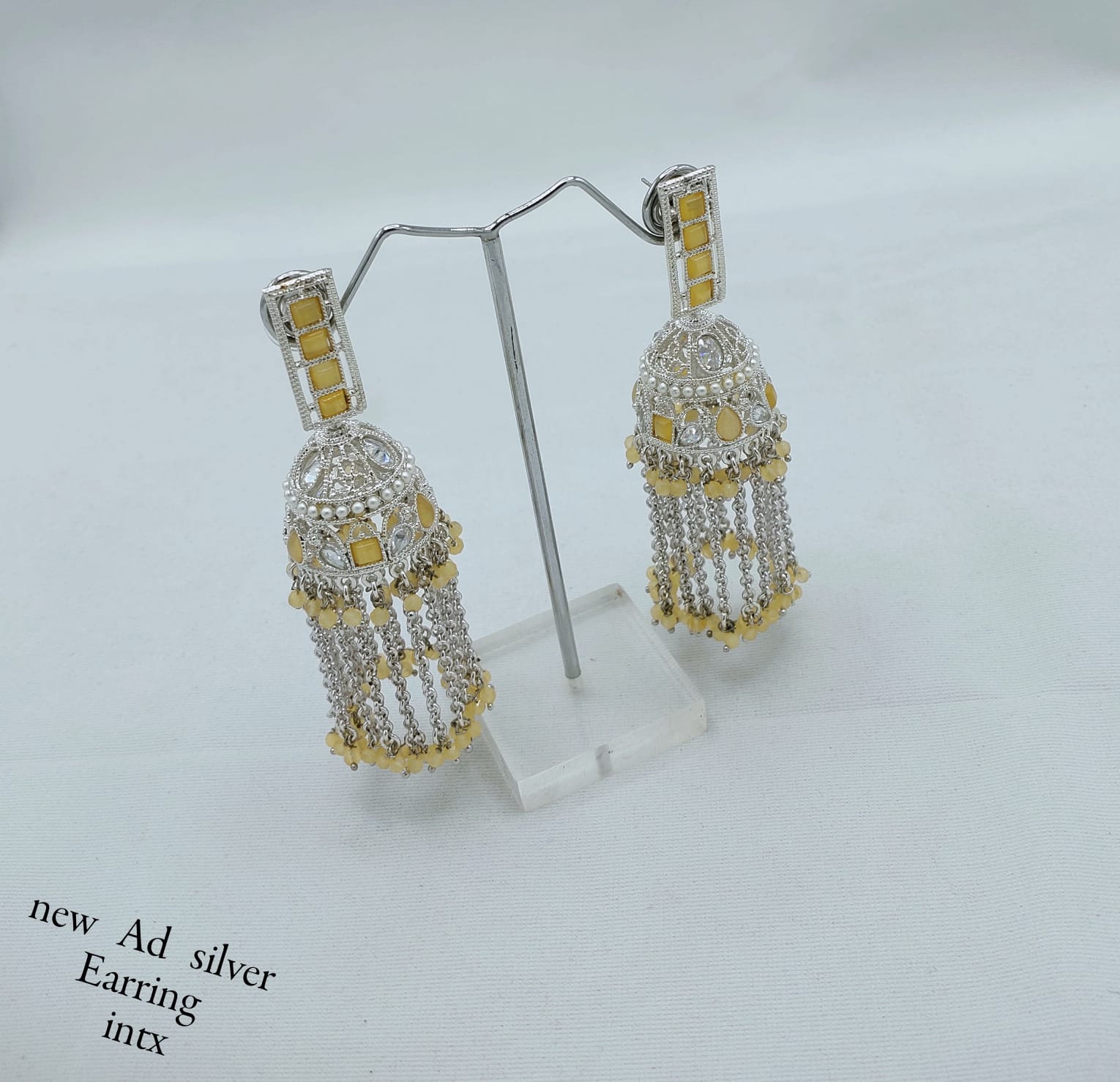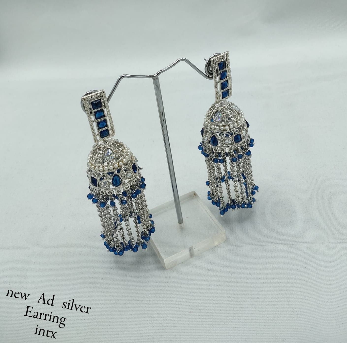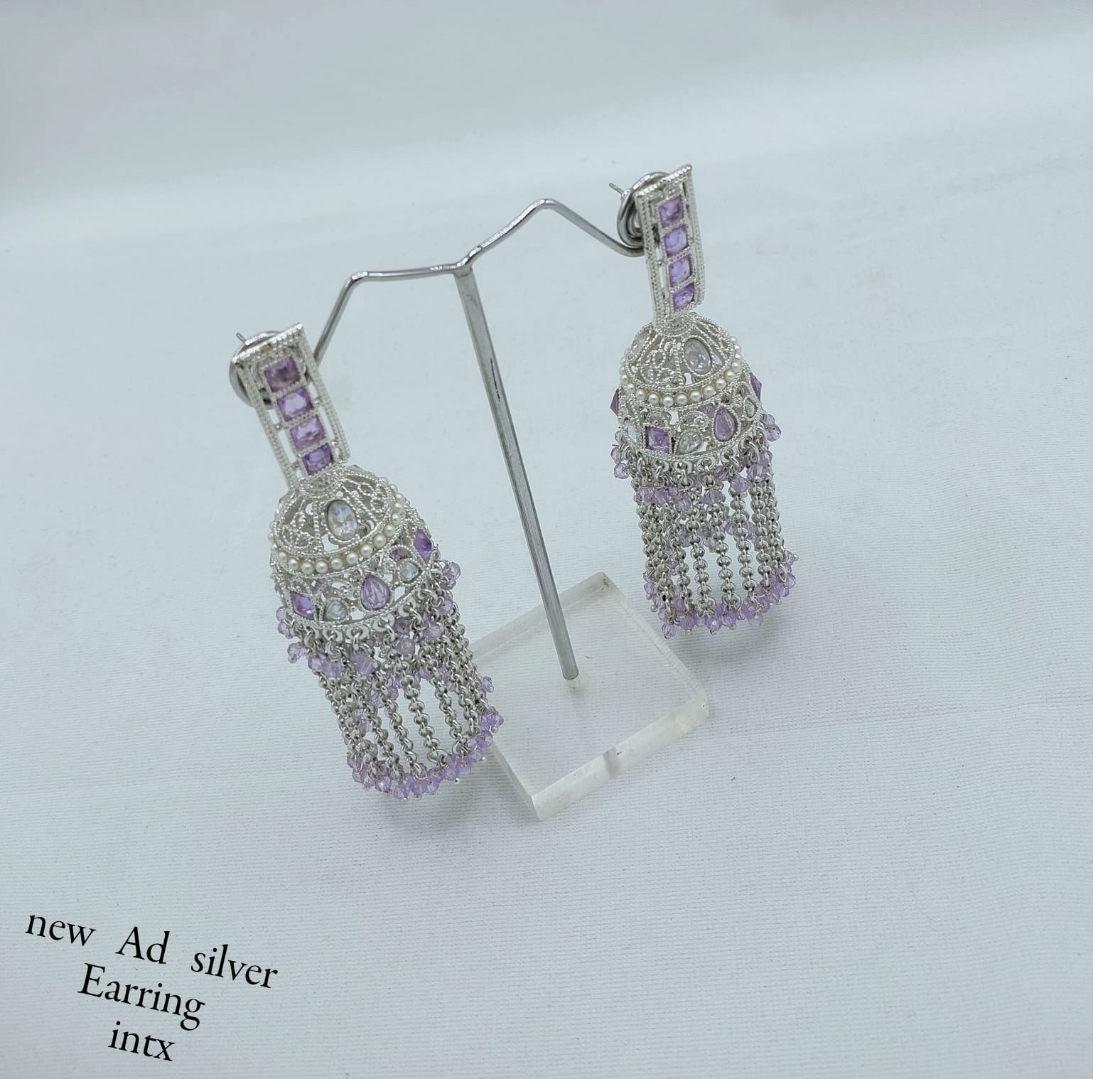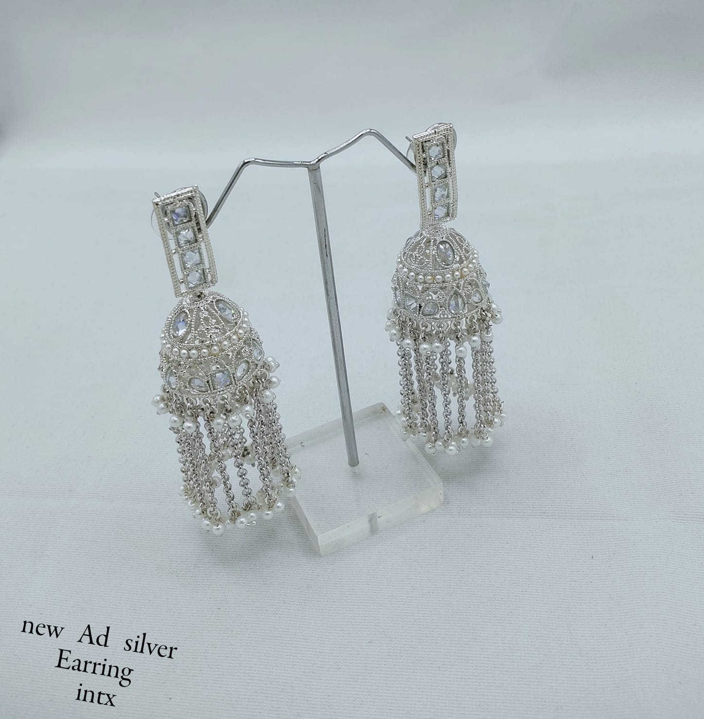 Add a sparkling touch of tradition to your ensemble with these stunning silver-finish AD jhumka earrings. Crafted with intricate American Diamond detailing and adorned with soft beaded tassels, these earrings blend traditional charm with modern elegance. The dome-shaped design paired with graceful hanging chains creates a fluid, eye-catching movement, making them perfect for festive events, parties, or ethnic wear. Lightweight and striking, these jhumkas are designed to turn heads.
