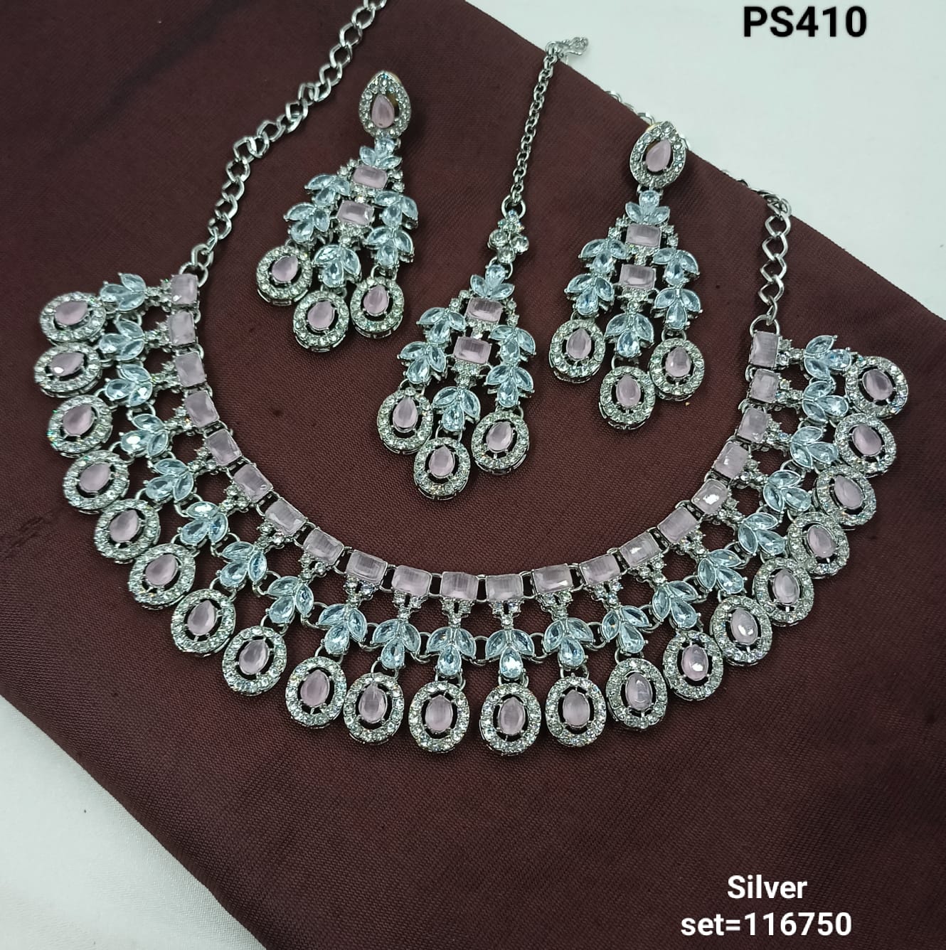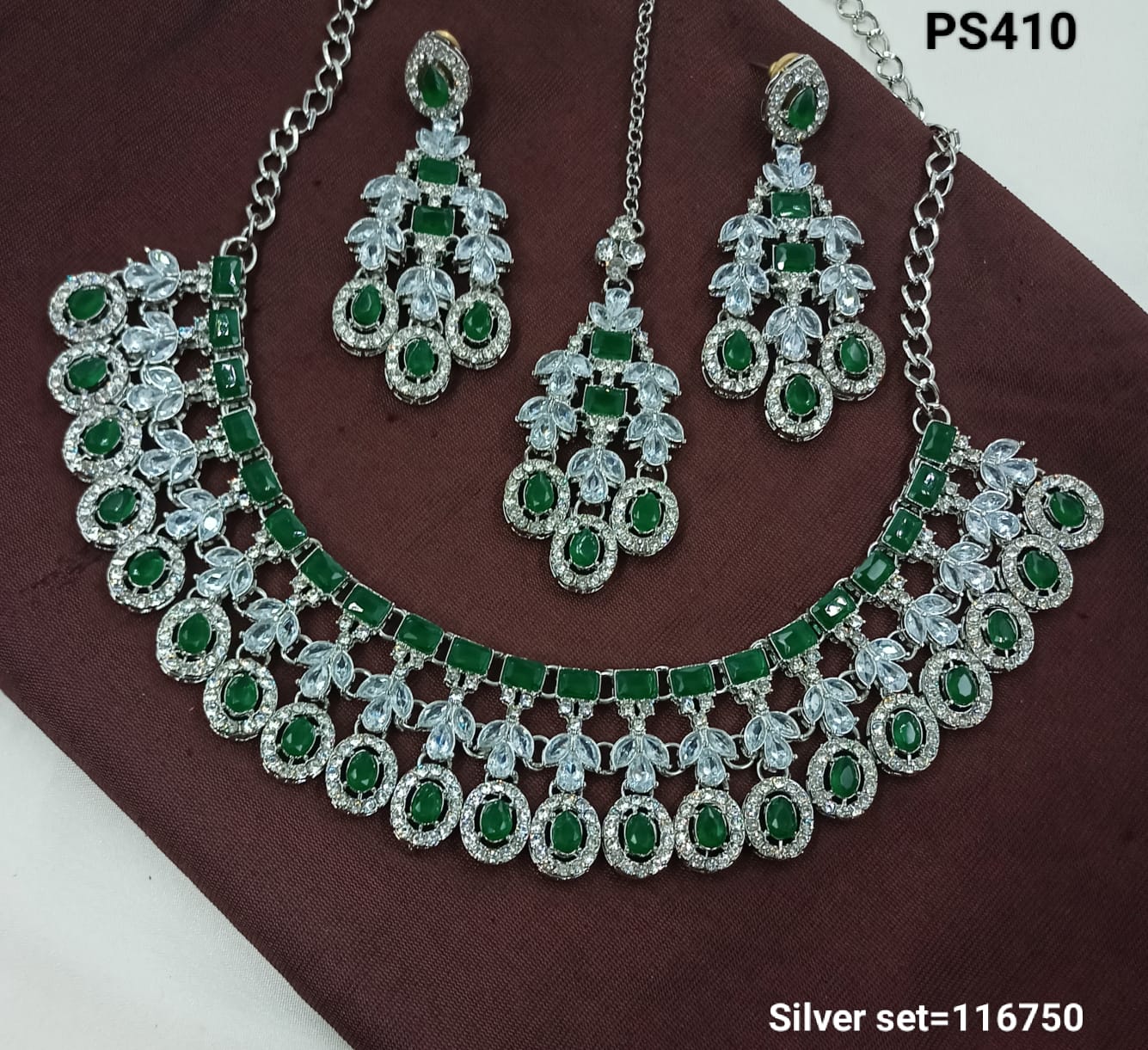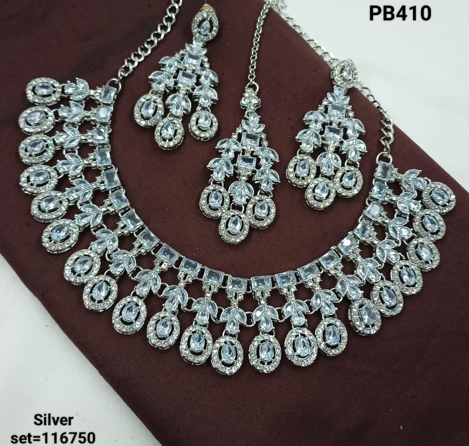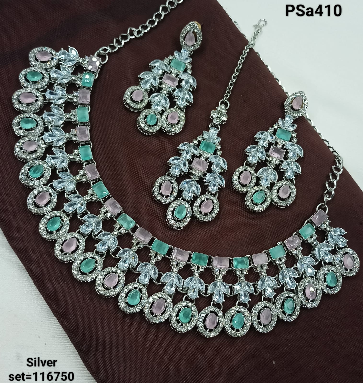 Turn heads at any celebration with our Designer Silver Necklace & Earrings Set, a luxurious fusion of modern elegance and traditional charm. This handcrafted set features a beautifully aligned combination of shapes and textures, highlighted with precision-cut stones and intricate metalwork. Ideal for bridal wear, festive occasions, or formal events, it offers a timeless aesthetic that adds sophistication and glamour to any outfit.
