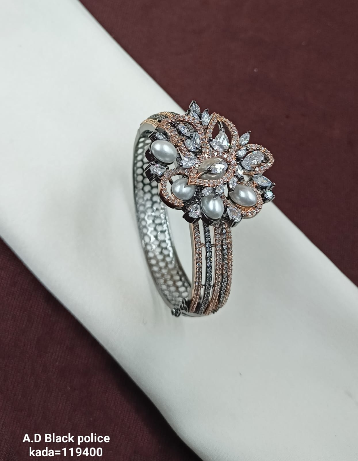 Add a touch of timeless elegance to your outfit with this Elegant A.D Pearl & Crystal Embellished Bracelet. Crafted with precision, this stunning black police kada features dazzling crystals and lustrous pearls, perfectly arranged in an intricate design. Whether you're dressing up for a special occasion or adding sparkle to your everyday look, this bracelet is sure to make a statement. Made with durable materials for long-lasting shine and comfort, it’s a must-have accessory for your jewelry collection.