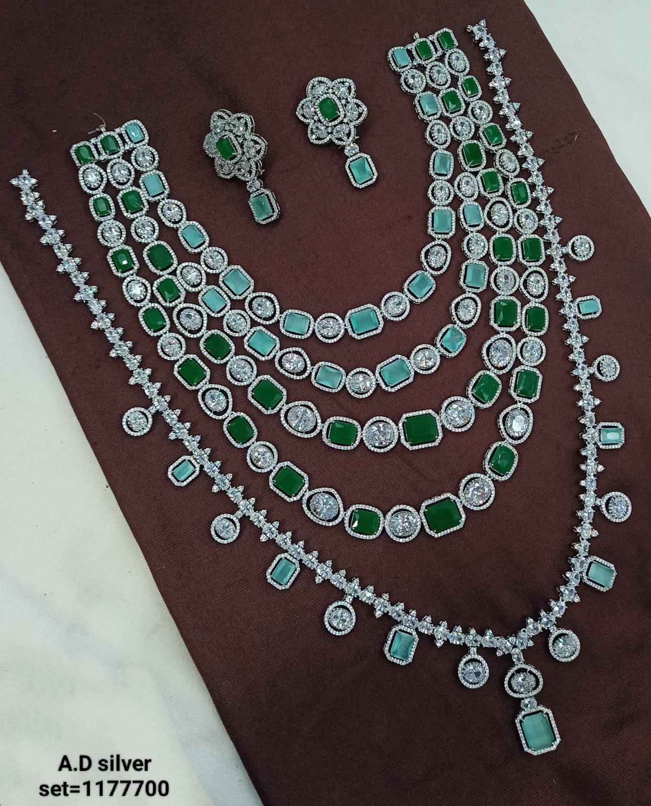 Elevate your elegance with this exquisite A.D silver multi-layer necklace set, featuring a stunning combination of vibrant green and soothing aqua gemstones. Expertly crafted to blend classic charm with modern sophistication, this set includes four intricately designed necklaces layered to perfection, paired with matching earrings for a complete look. Perfect for weddings, parties, or any special occasion, this jewelry set will add a touch of timeless beauty and sparkle to your ensemble.