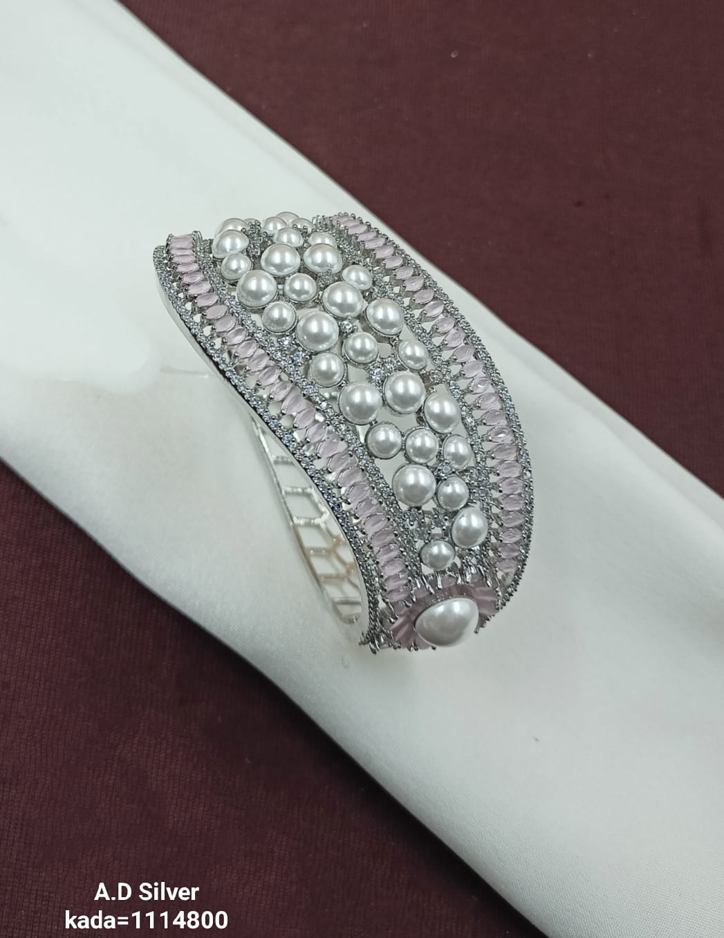 Elevate your elegance with this exquisite AD Silver Bracelet, intricately designed to make a statement. Crafted in premium silver-tone alloy, the Bracelet is adorned with lustrous white pearls and delicate pink stones, offering a timeless blend of traditional charm and modern sophistication. Whether you're attending a wedding, festive celebration, or a formal evening, this kada adds a luxurious touch to your ensemble.