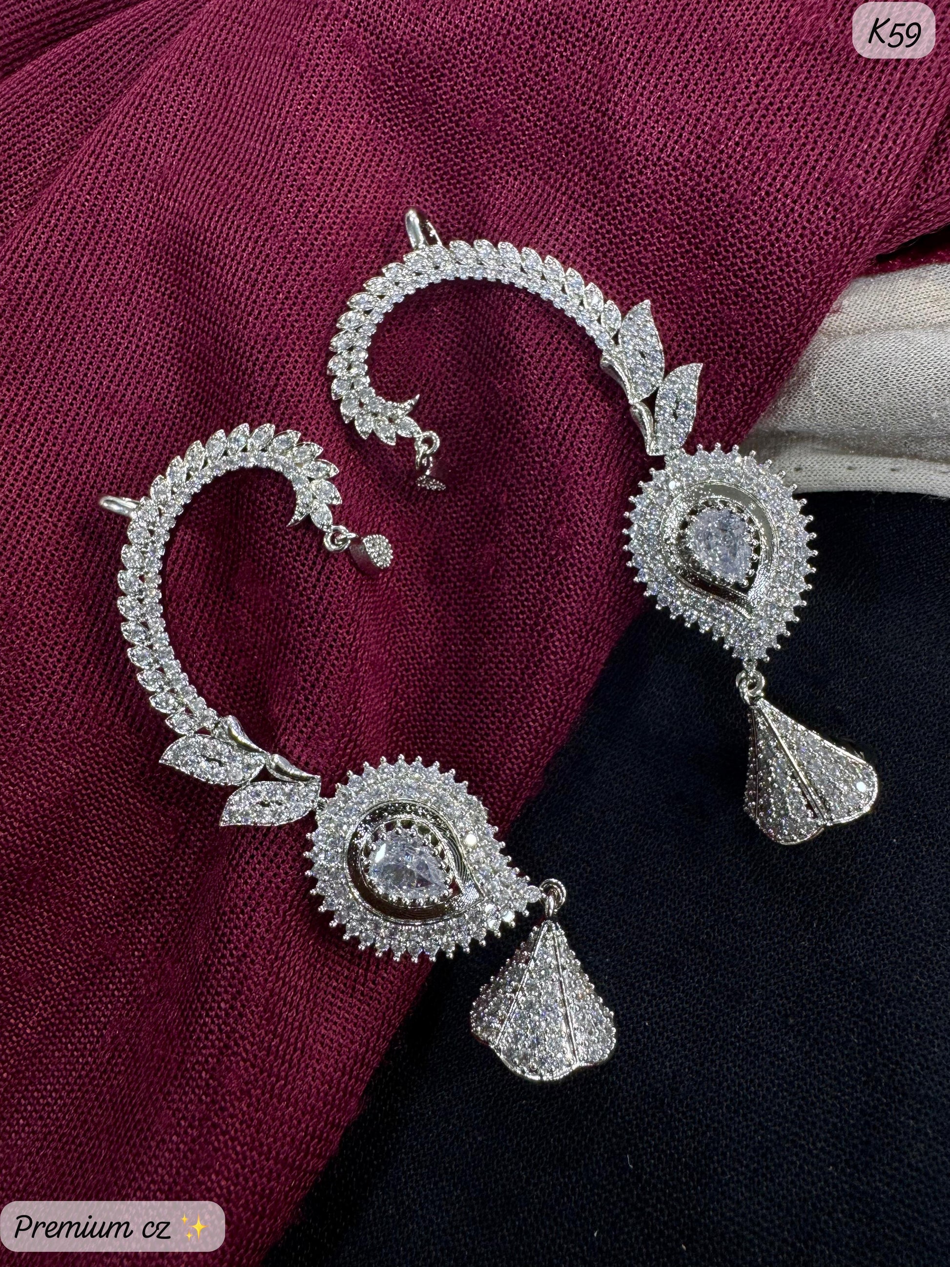 This elegant AD stone earcuff earring set features a delicate leaf motif design, crafted with premium American Diamond stones for maximum sparkle. The unique earcuff style gracefully hugs the ear, offering both comfort and a modern twist on traditional jewelry. Finished in a high-quality silver plating, these earrings exude sophistication and are perfect for weddings, festive occasions, and special events.