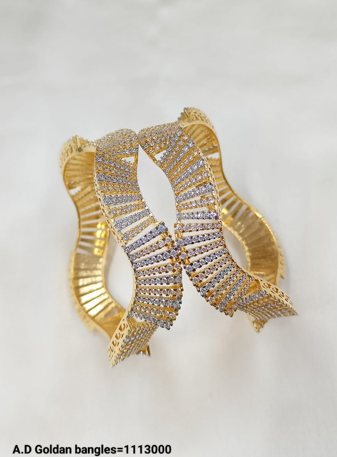 Elevate your traditional look with these stunning American Diamond gold-finish bangles. Intricately designed with a modern twist, this set of 2 bangles features a unique wave pattern fully encrusted with shimmering American Diamonds. Perfect for weddings, festive events, or a glamorous evening out, these bangles add instant sparkle and elegance to your ensemble.