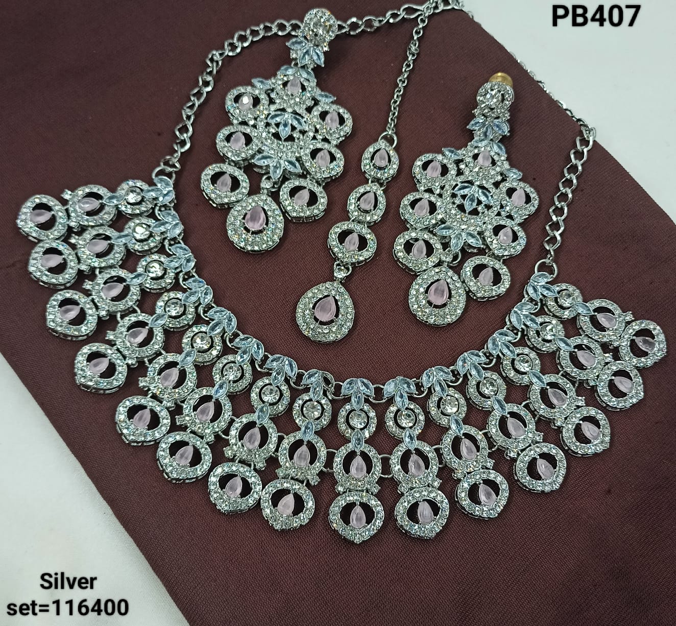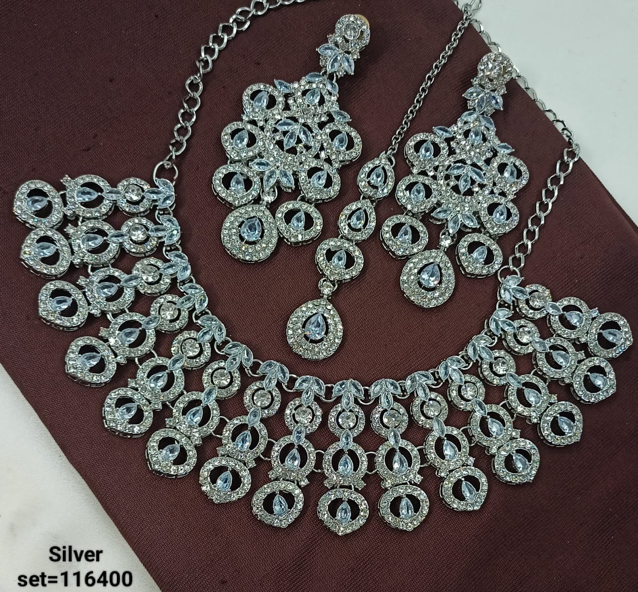 Make a lasting impression with our Elegant Silver Bridal Necklace & Earrings Set, a stunning statement piece designed for grand occasions. This luxurious set features intricate craftsmanship with layered detailing and brilliant cubic zirconia stones. Its elegant drop-shaped design and artistic structure exude timeless glamour and sophistication, making it ideal for weddings, formal events, or high-end celebrations. Whether you're the bride or a guest of honor, this set guarantees a head-turning appearance.