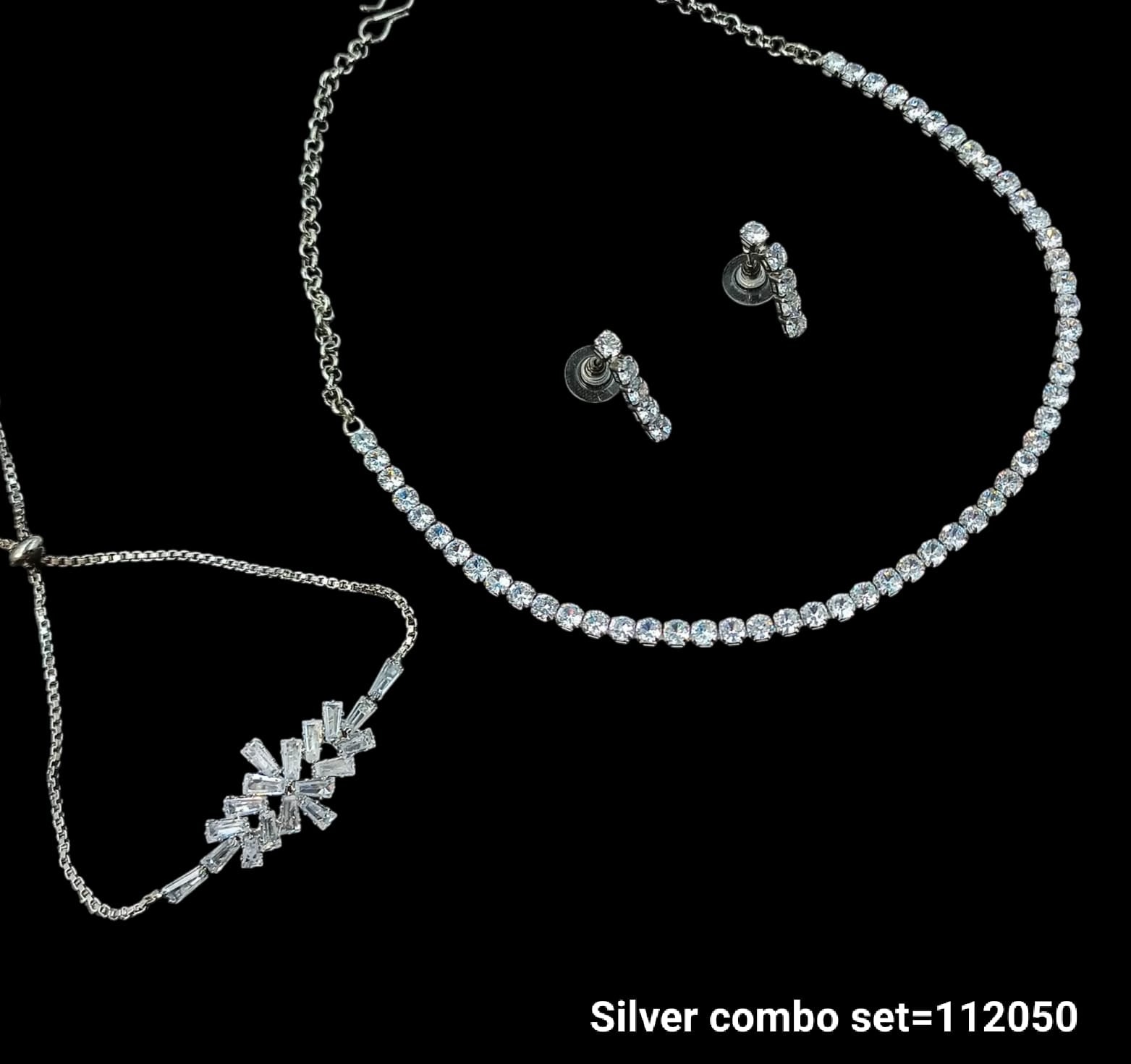 Add timeless elegance to your jewelry collection with this stunning Silver Combo Set. Perfectly coordinated and beautifully crafted, this set includes a sparkling tennis necklace, a chic adjustable bracelet, and matching stud earrings. Whether you're attending a wedding, party, or formal event, this trio brings sophistication and shine to any outfit. Designed with high-quality cubic zirconia stones and a sleek silver finish, it offers a luxurious look without the premium price.