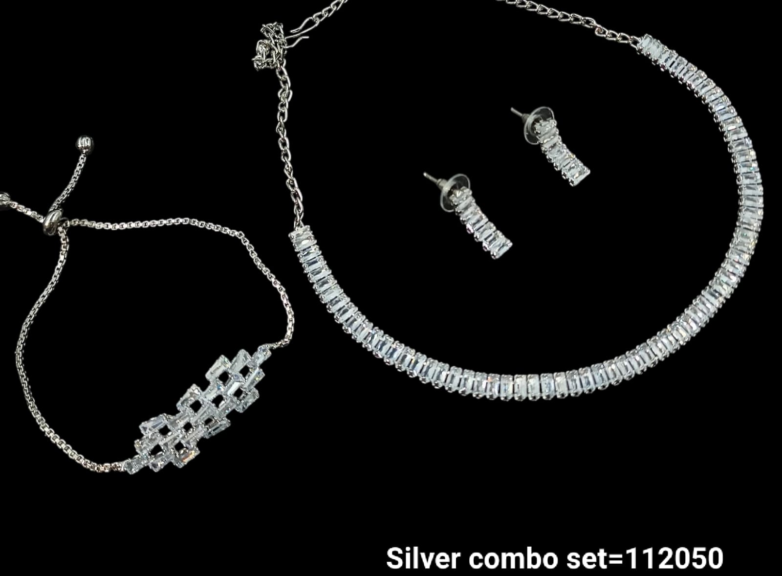 Elevate your elegance with the Elegant Silver Combo Jewelry Set from Lucentemarket. This stunning 3-piece set includes a meticulously crafted necklace, a chic bracelet, and a pair of sparkling earrings—each designed with precision-cut stones that catch the light from every angle. Whether you're attending a formal event, a wedding, or simply want to make an impression, this silver-toned set adds timeless beauty and refined charm to any outfit.
