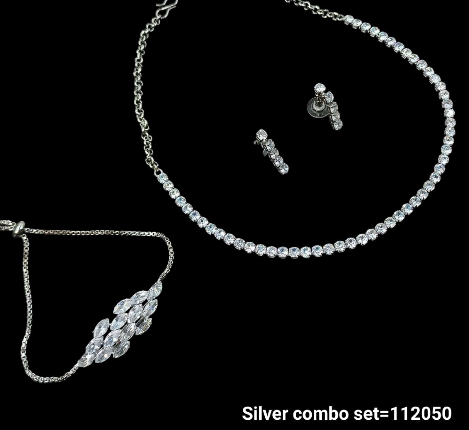 Elegant Silver Jewelry Combo Set – Necklace, Bracelet & Earrings with Sparkling Crystals