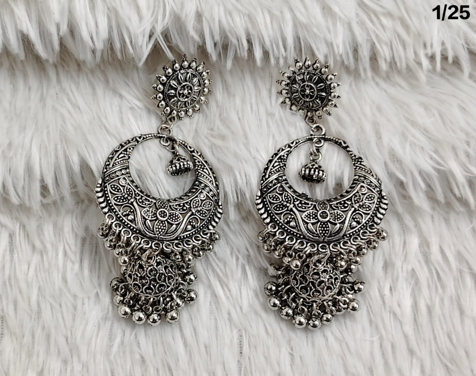 Add a touch of timeless elegance to your outfit with these stunning Silver Oxidized Floral Jhumka Earrings. Intricately designed with traditional Indian motifs and delicate craftsmanship, these earrings are perfect for festive occasions, weddings, or everyday wear. The detailed floral patterns and dangling elements create a graceful and eye-catching look, making them a versatile accessory to complement both ethnic and contemporary styles.
