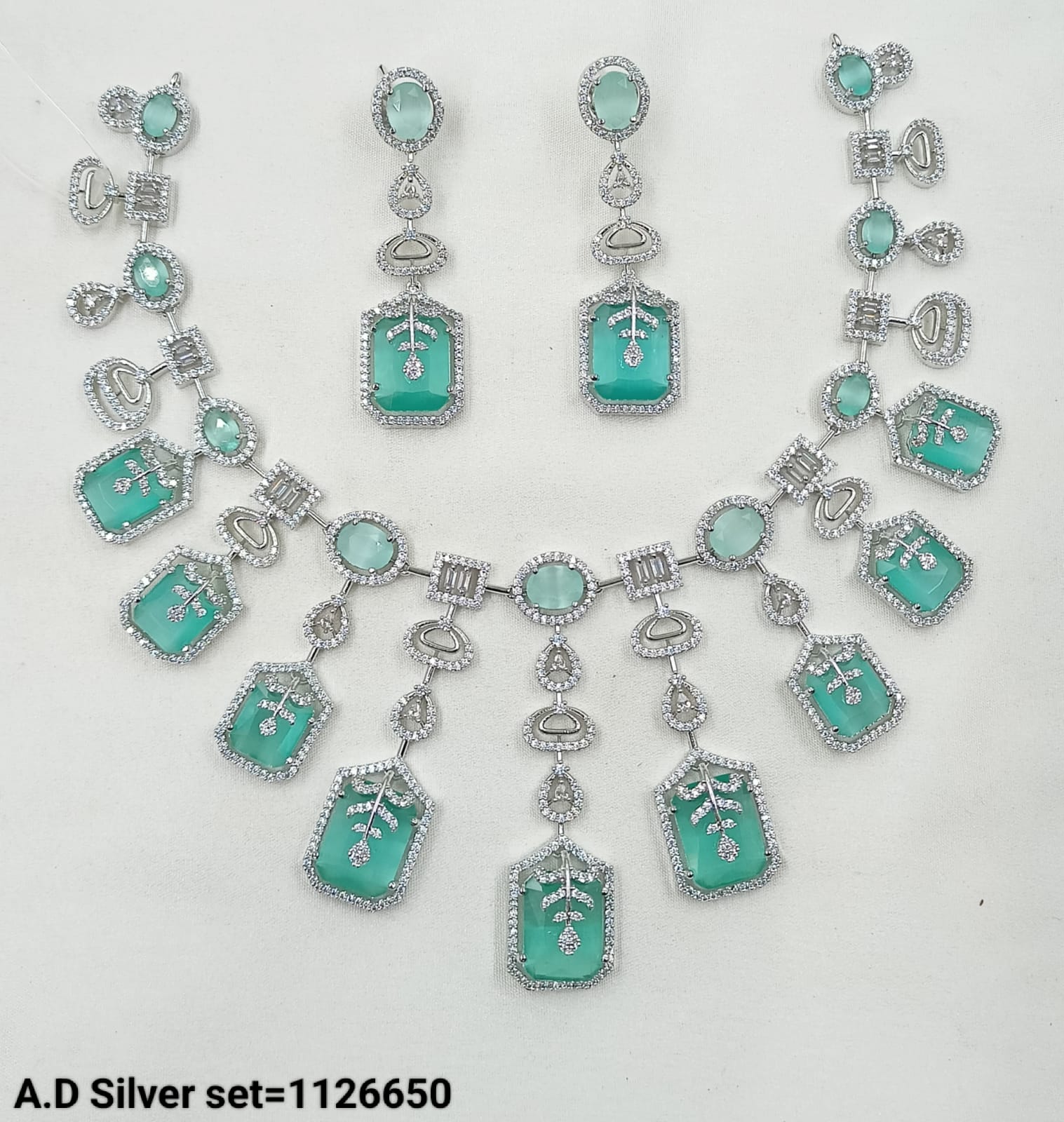 Make a bold and graceful statement with this Elegant Silver-Plated AD Necklace Set. Beautifully designed with intricate American Diamond (AD) detailing and vibrant green stones, this set includes a matching necklace and earrings, perfect for weddings, parties, and festive occasions. The silver finish adds a luxurious shine, while the unique floral-inspired design elements bring a touch of tradition blended with modern charm.