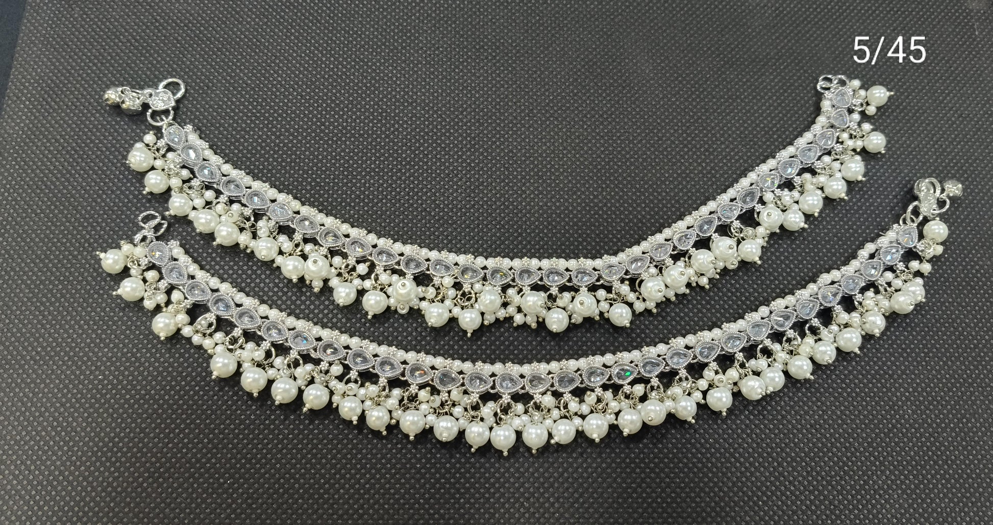 Add a touch of timeless charm to your ethnic look with this elegant pair of silver-plated anklets. Beautifully adorned with shimmering stones and layers of pearl drops, this anklet set is crafted to elevate festive and traditional ensembles. Its intricate design and rich texture make it a perfect accessory for weddings, festivals, and special occasions.