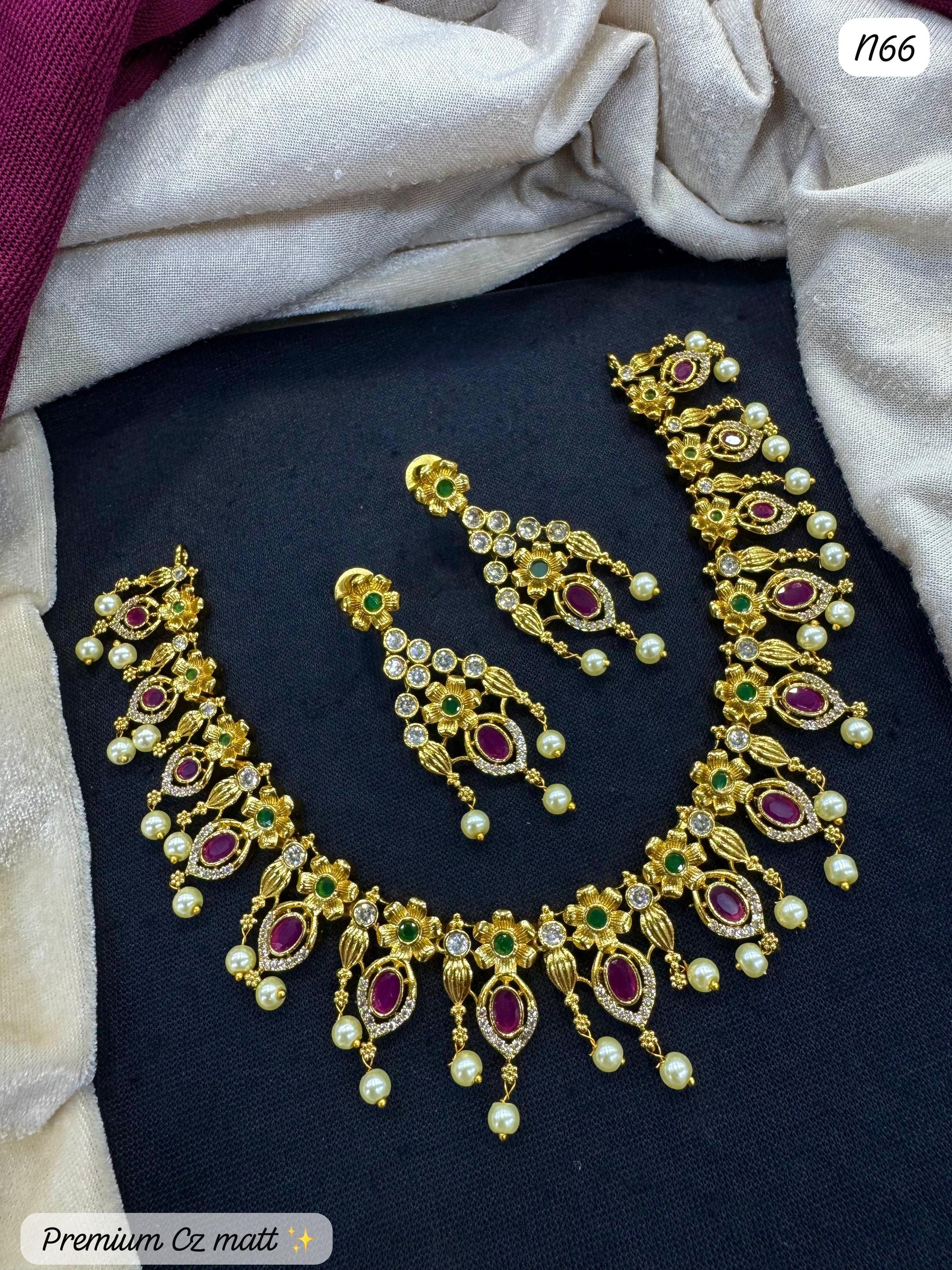 Add a touch of timeless elegance to your look with this Premium AD Matte Gold Necklace & Earrings Set. Featuring exquisite ruby and emerald stones complemented by delicate pearl accents, this jewelry set is crafted with a stunning matte gold finish that exudes sophistication. Perfect for weddings, festivals, and special occasions, the set combines traditional design with modern craftsmanship to elevate any outfit.