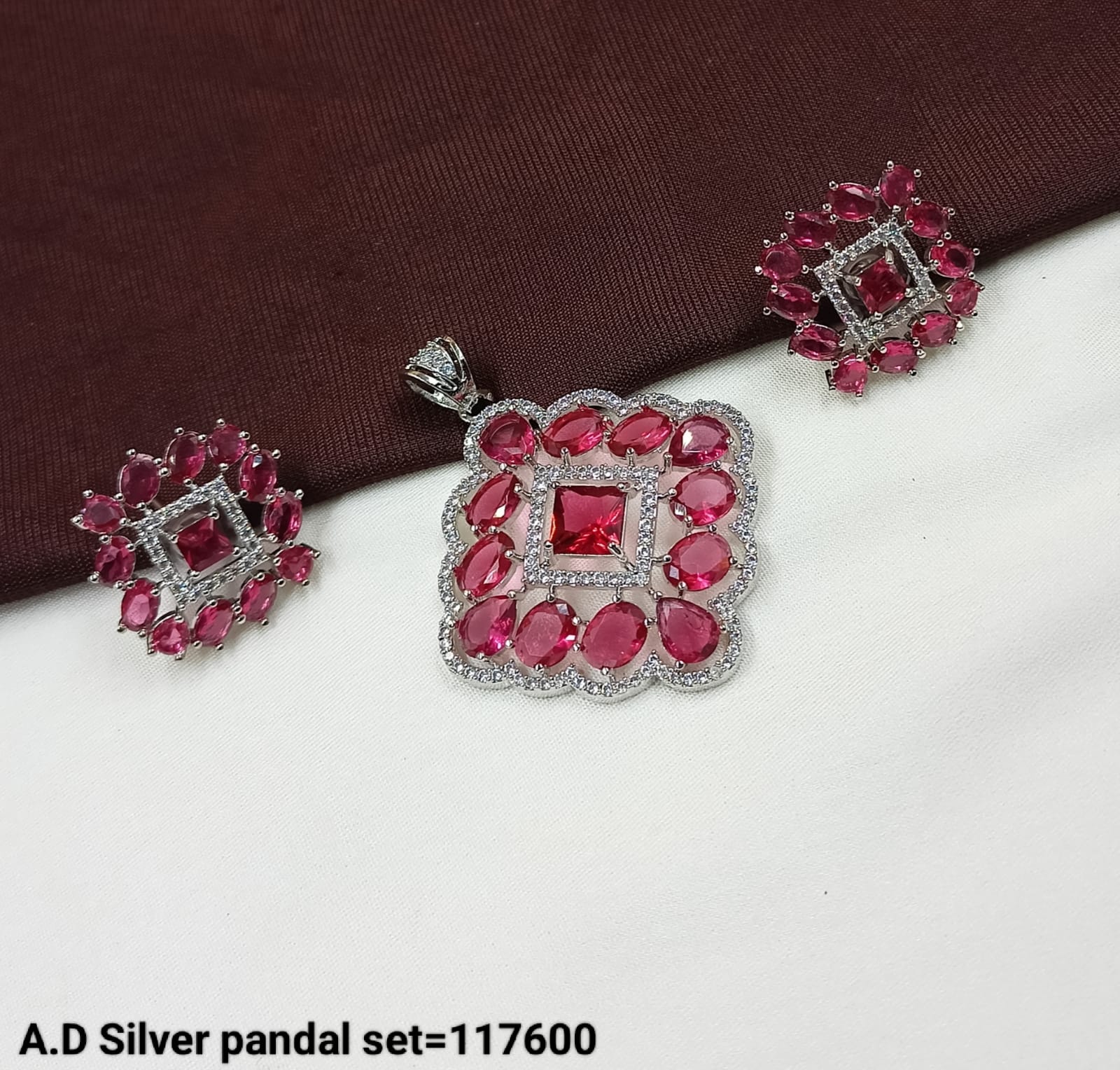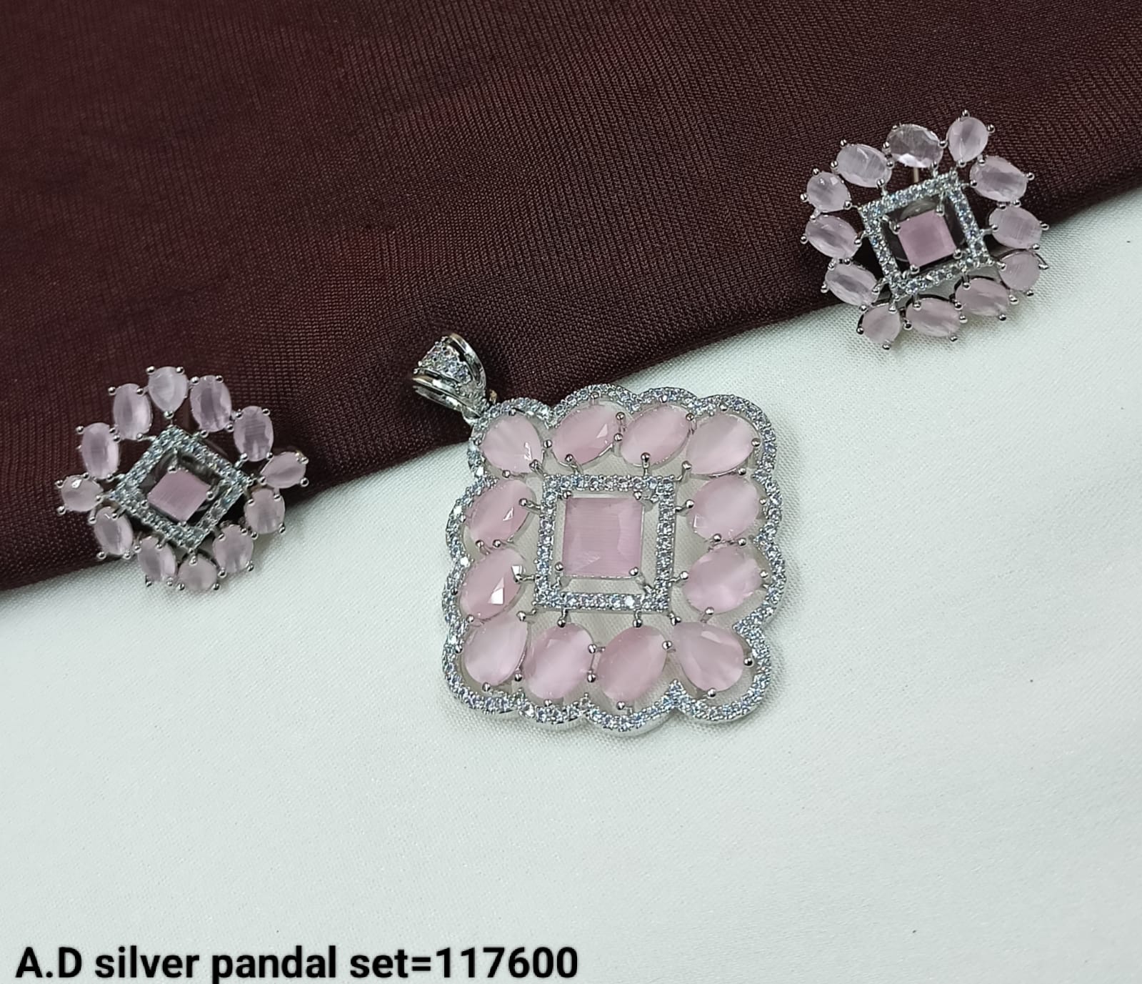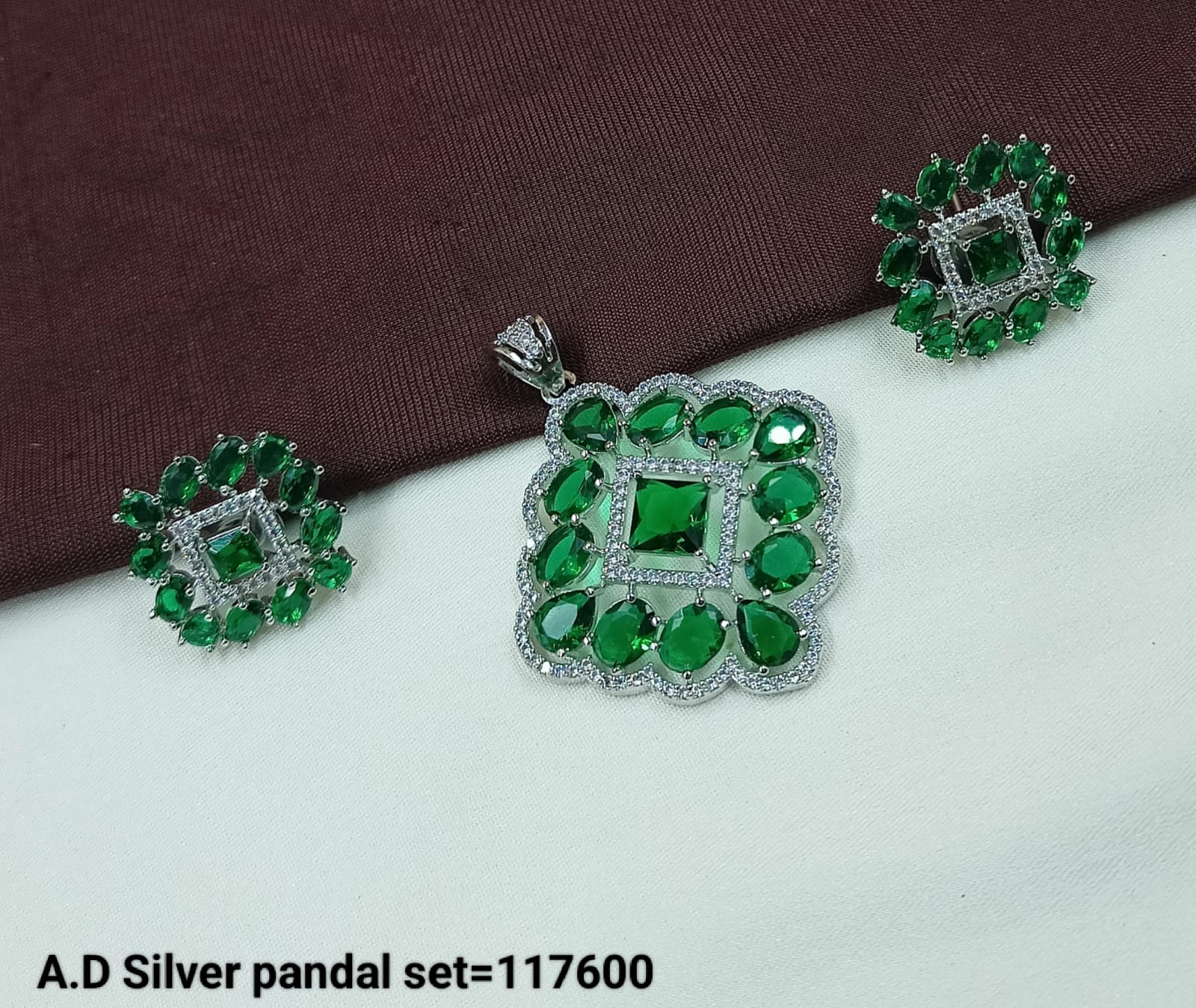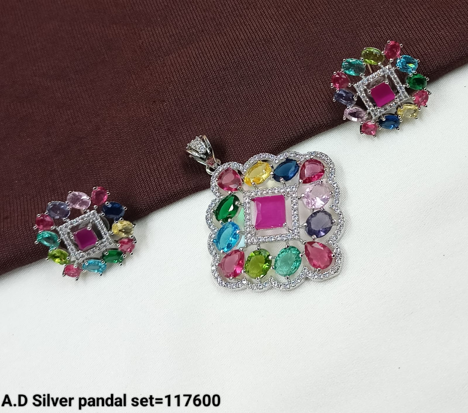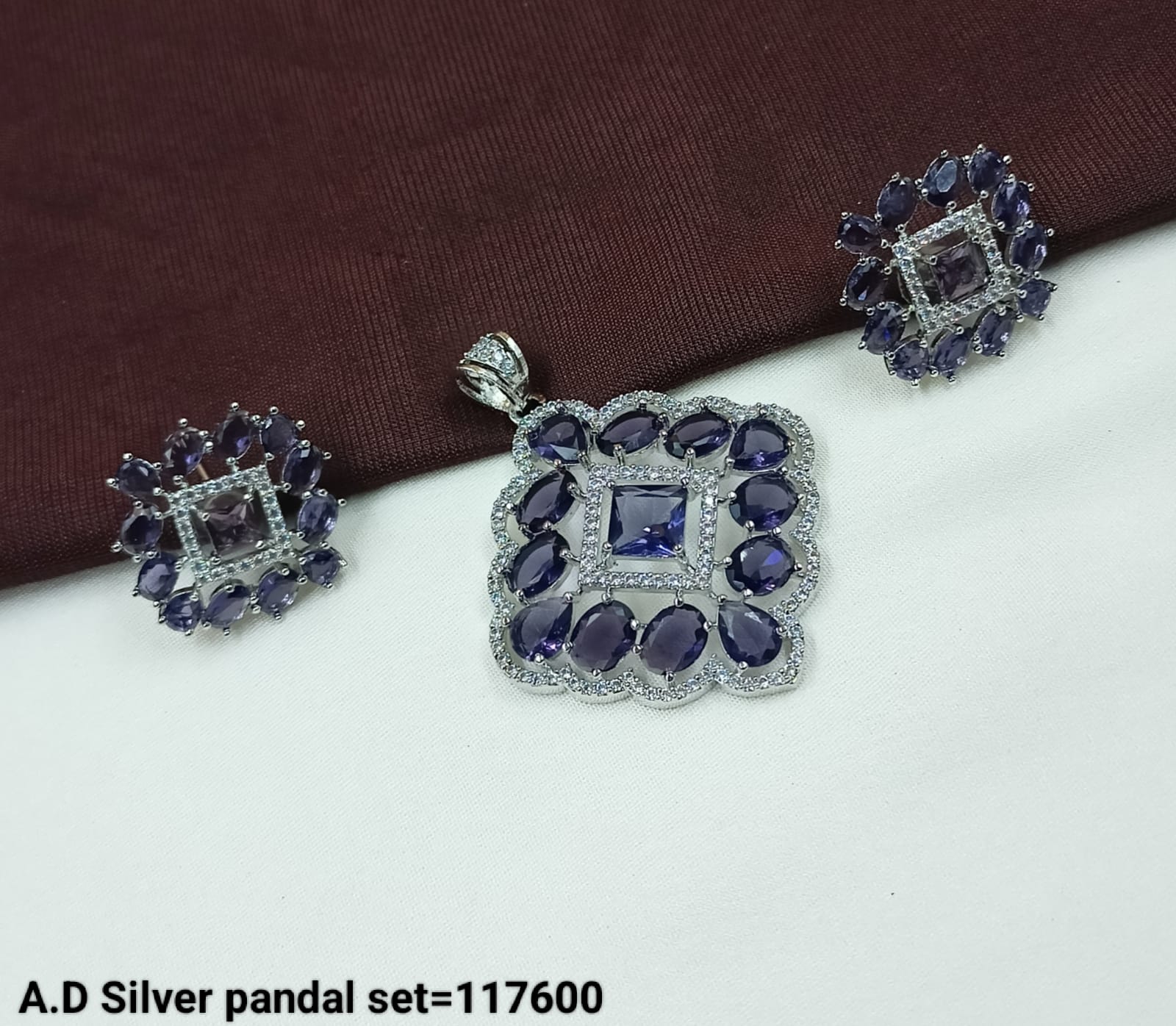 Make a sophisticated style statement with this A.D Silver Square Pendant and Earring Set. Designed with precision, this elegant set features a symmetrical square motif surrounded by shimmering American Diamonds and gemstone-like accents. The refined silver finish and intricate craftsmanship make it a perfect addition for both festive occasions and formal gatherings. A graceful blend of contemporary elegance and timeless charm.