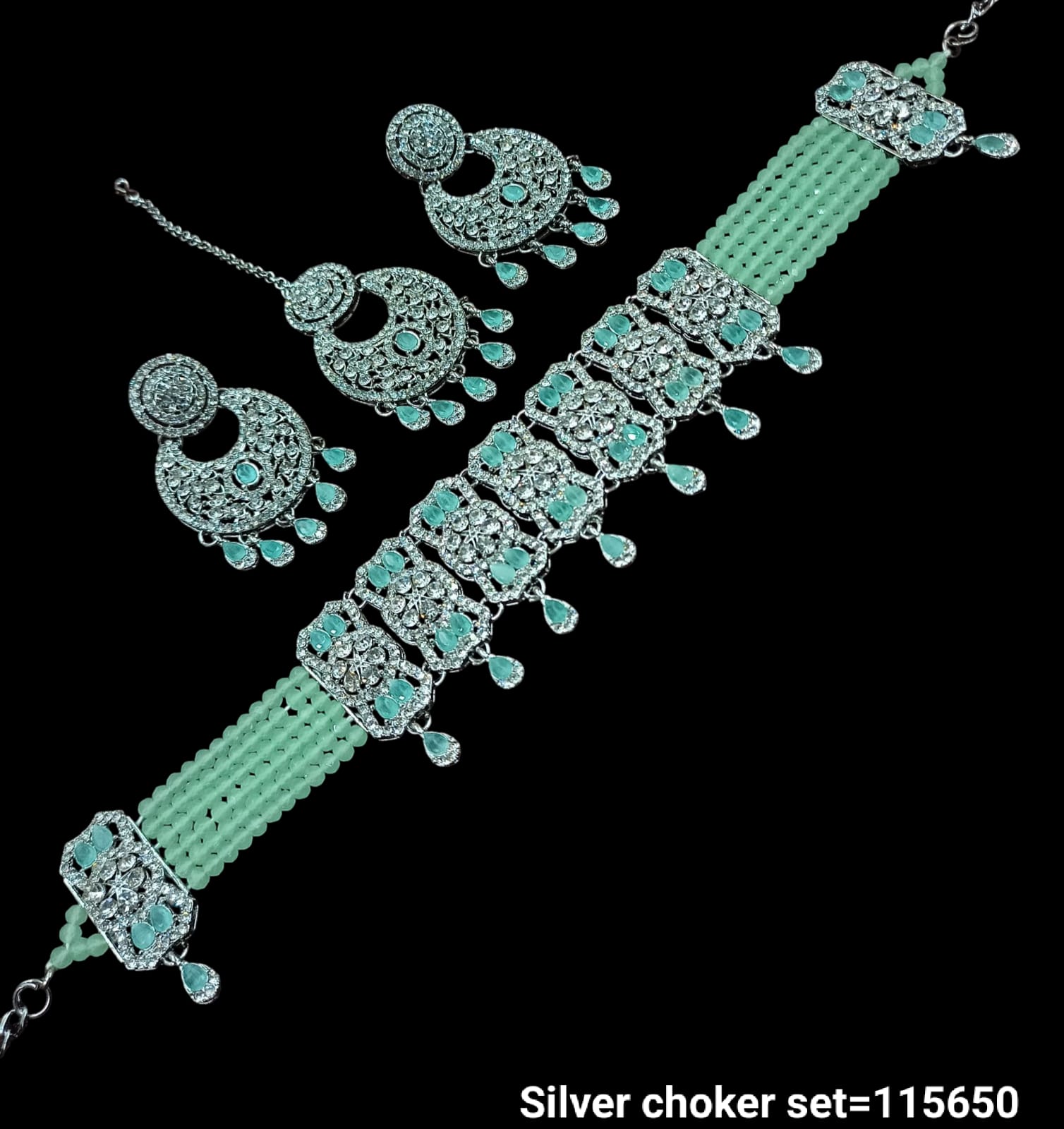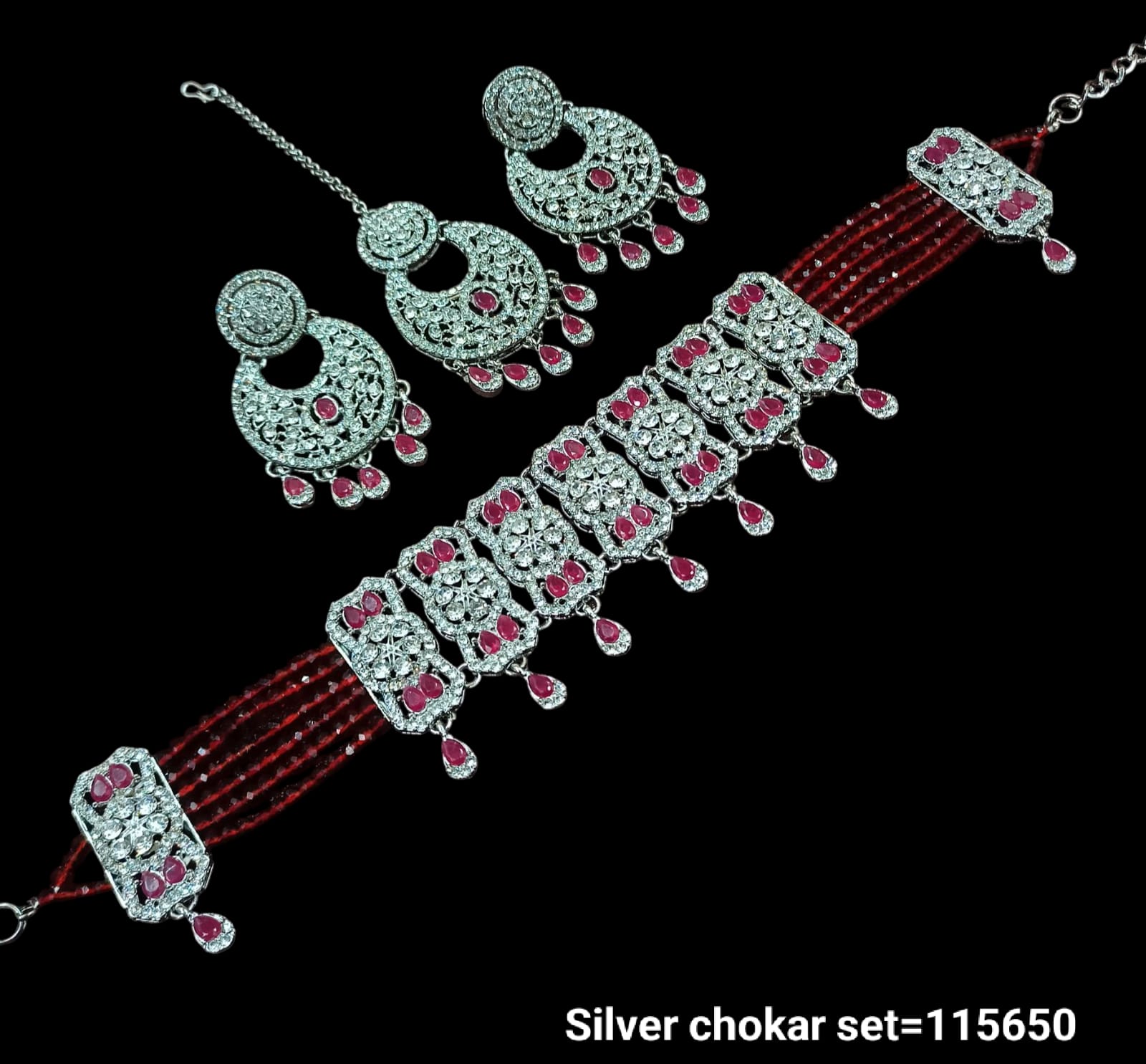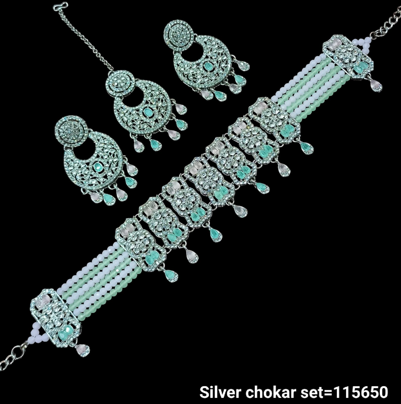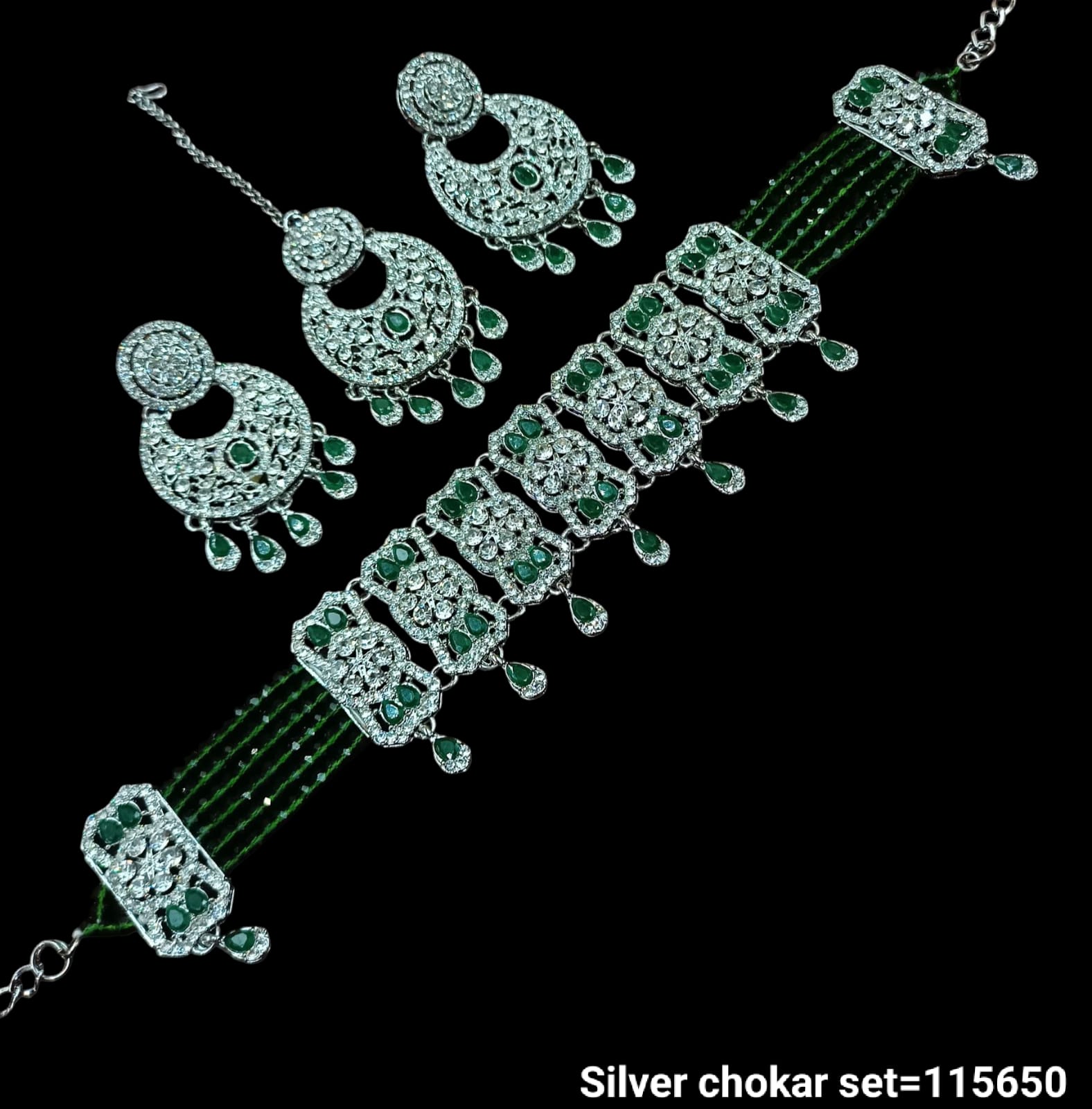 Elevate your style with this exquisite silver choker set, featuring intricate craftsmanship and detailed embellishments. The matching earrings complement the choker perfectly, making it an ideal accessory for special occasions or festive celebrations. Designed for a comfortable fit, this set adds a touch of timeless elegance to any outfit.