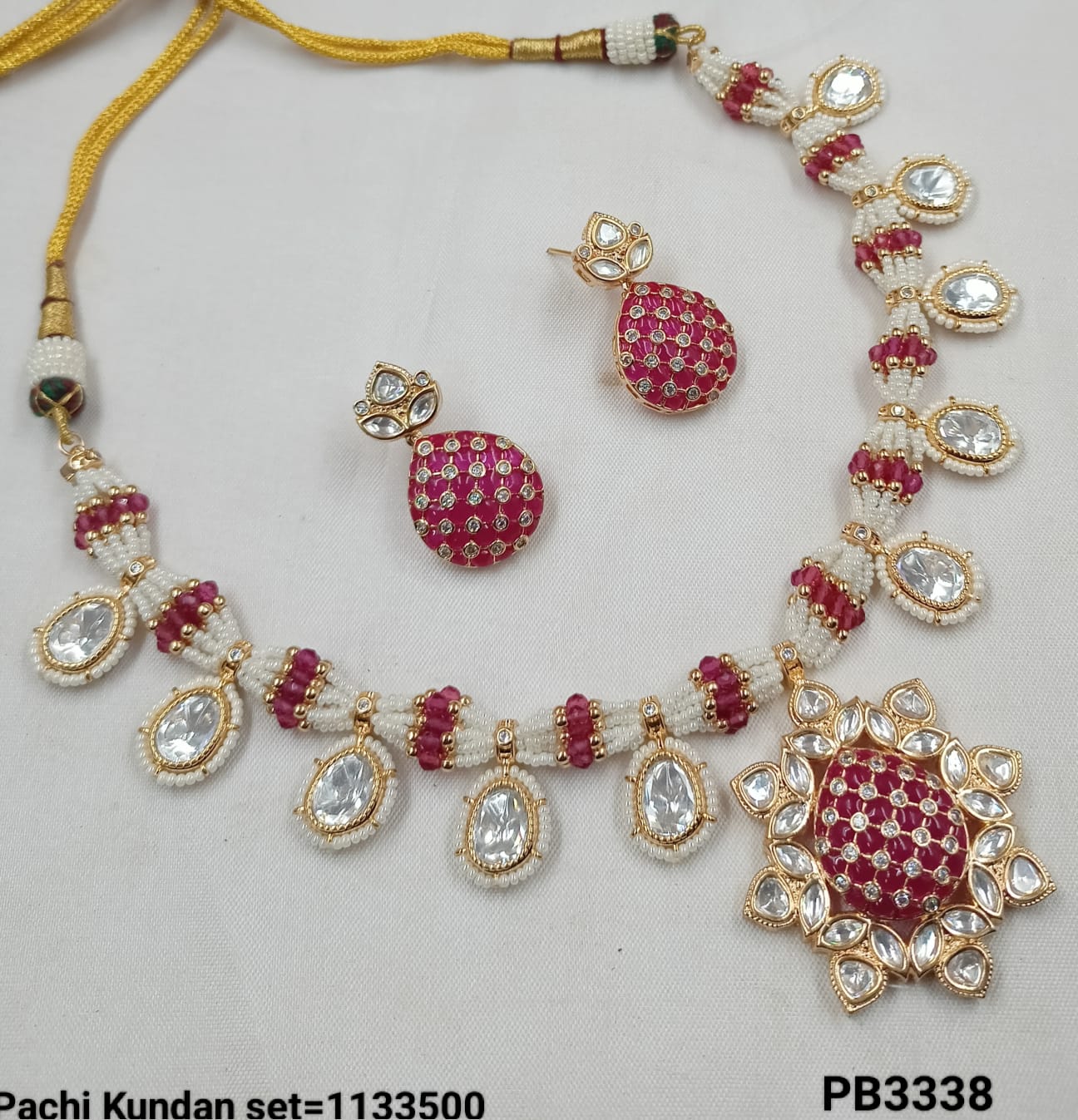 Add a touch of royal elegance to your festive or bridal look with this beautifully handcrafted Pachi Kundan jewelry set. Featuring a statement pendant necklace and matching earrings, this set is intricately designed with high-quality stones and fine detailing. The combination of traditional craftsmanship and refined design makes it an ideal choice for weddings, cultural events, and special celebrations.