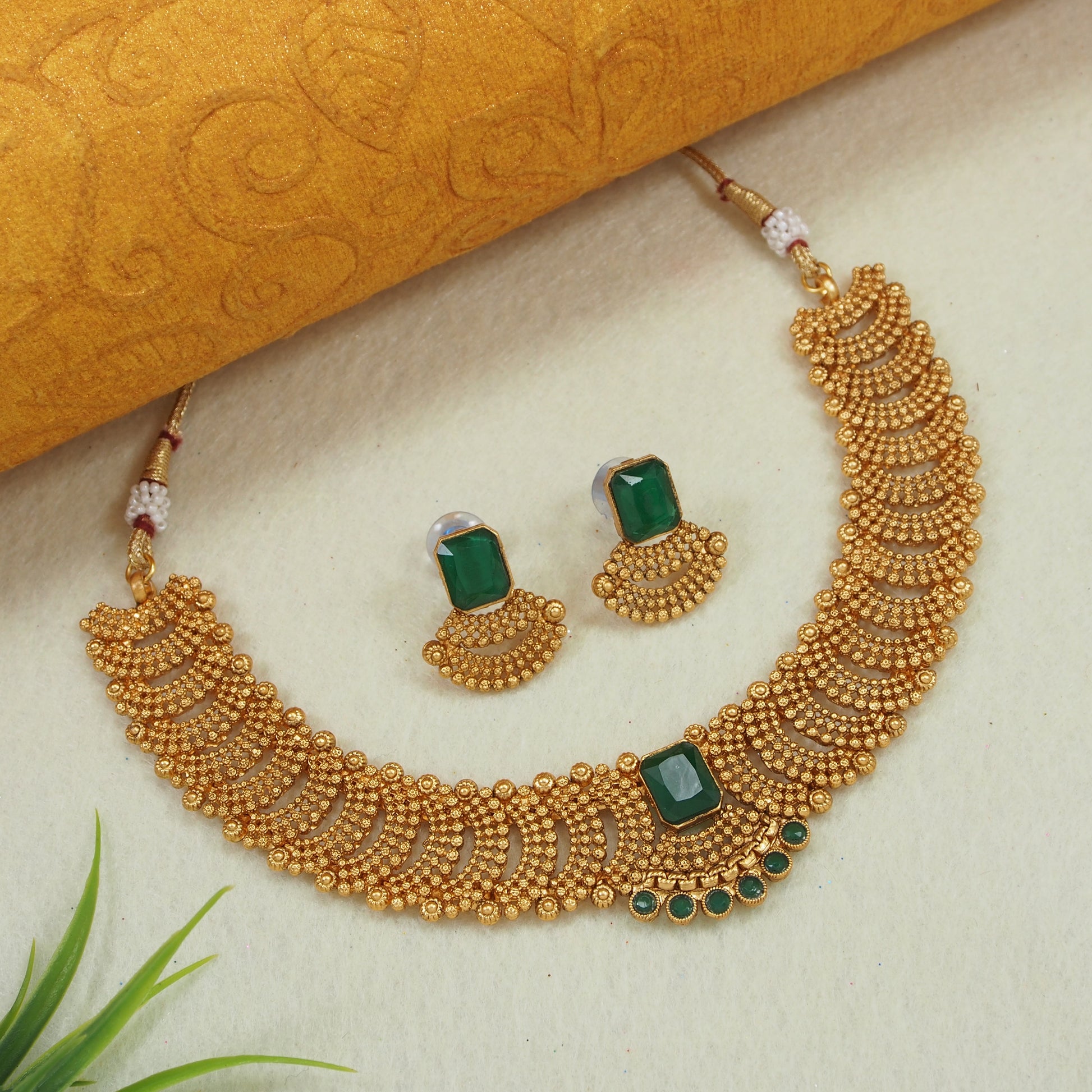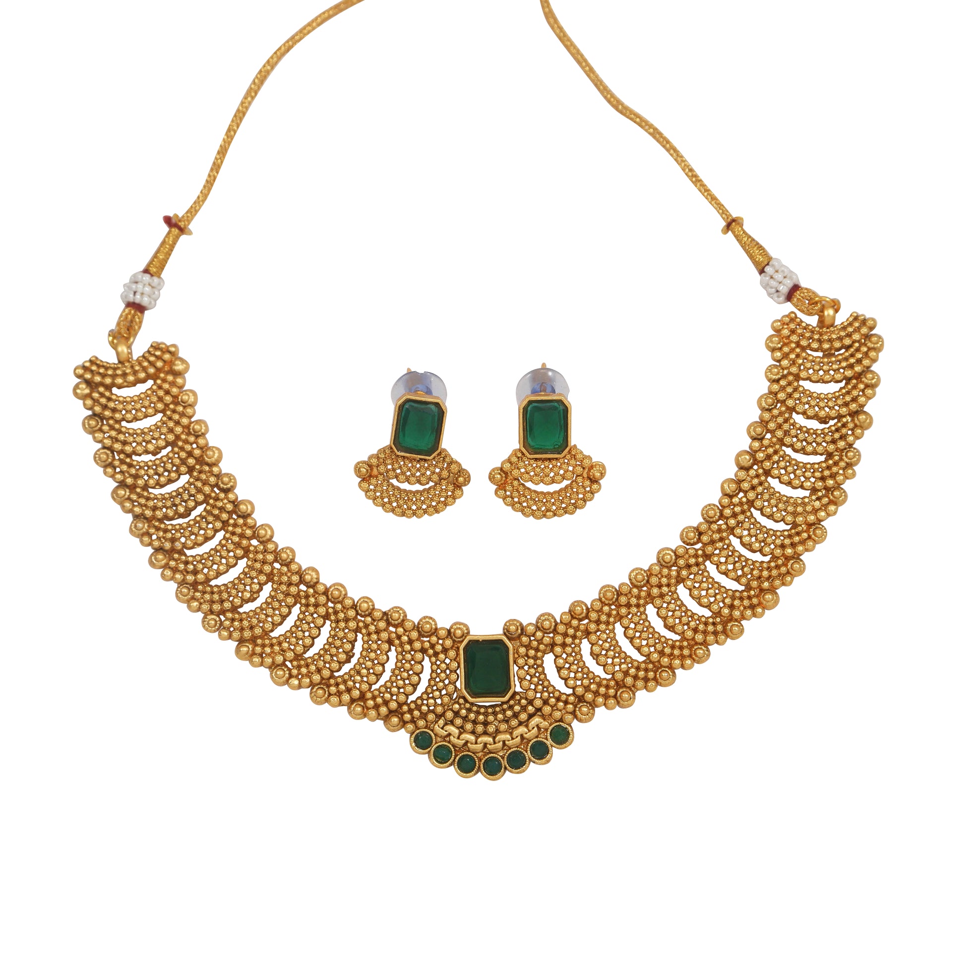 Fashionable Gold Toned Square Shape Green Stone Studded Choker Temple Necklace With Matching Earring For Women And Girls