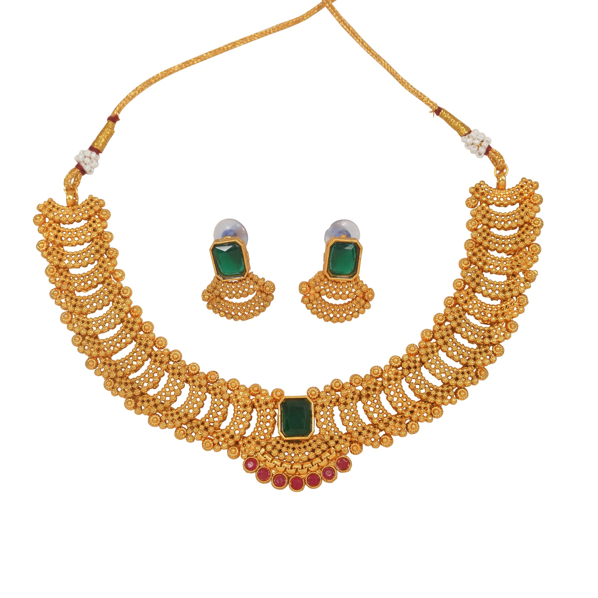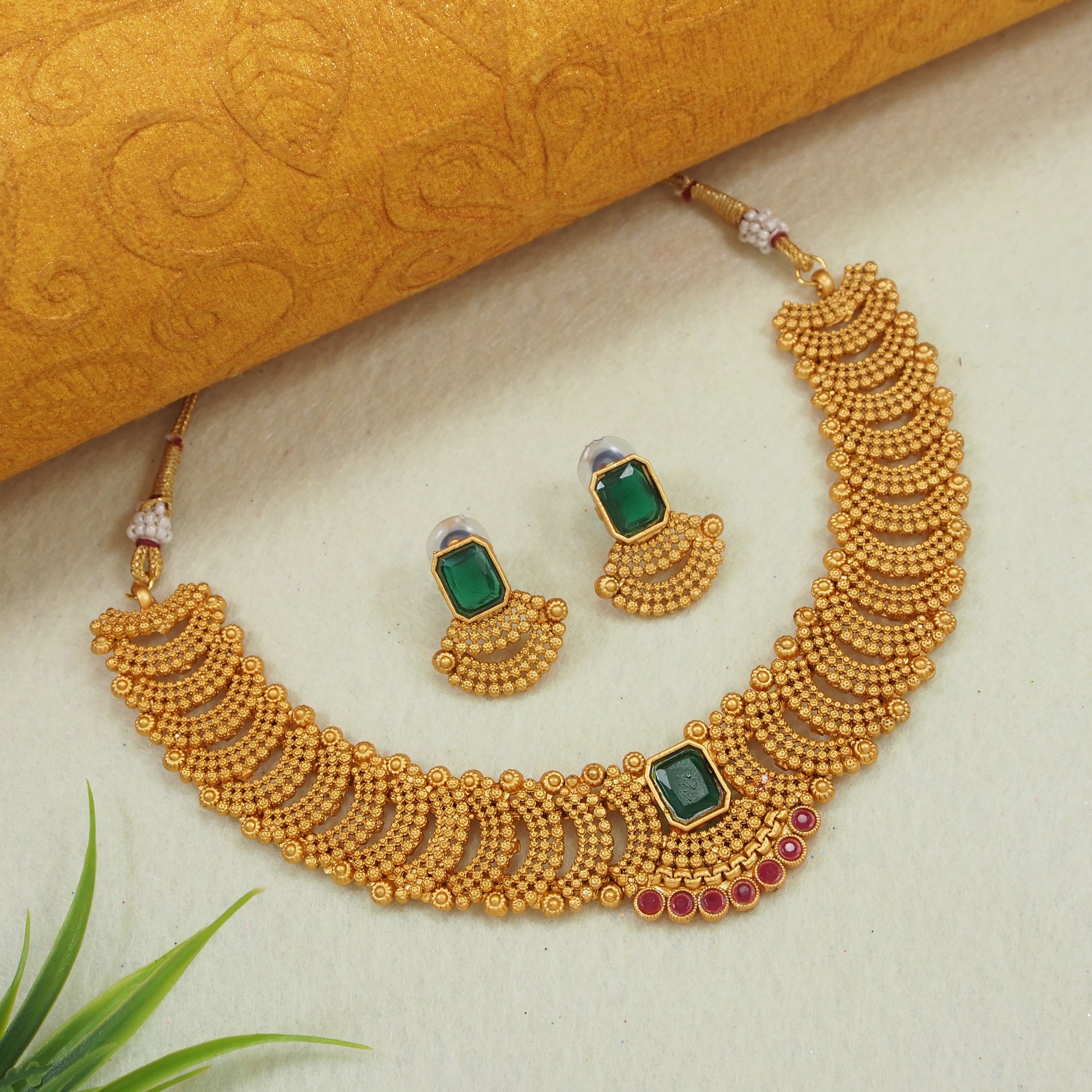 Fashionable Gold Toned Square Shape MG Colour Stone Studded Choker Temple Necklace With Matching Earring For Women And Girls