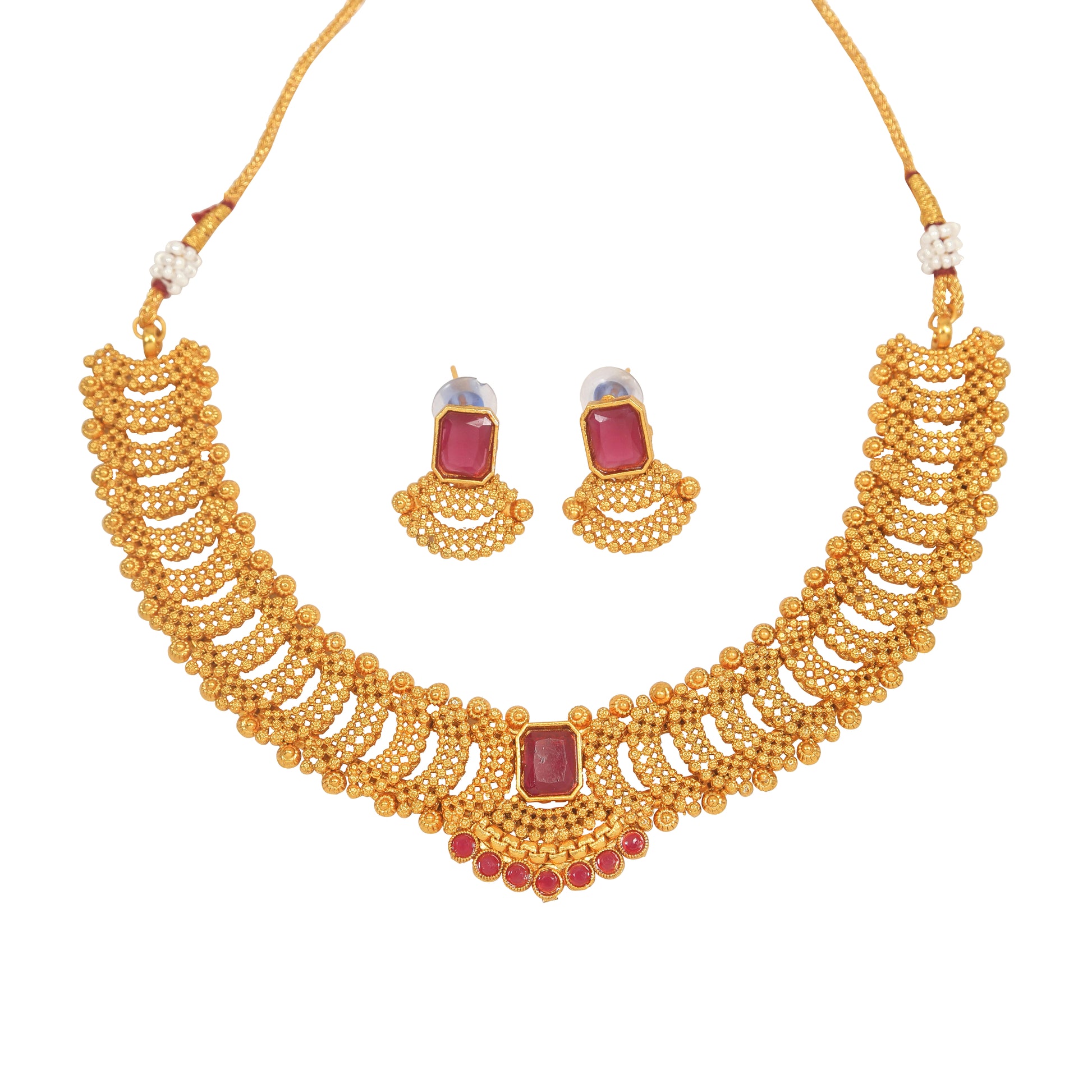 Fashionable Gold Toned Square Shape Ruby Colour Stone Studded Choker Temple Necklace With Matching Earring For Women And Girls