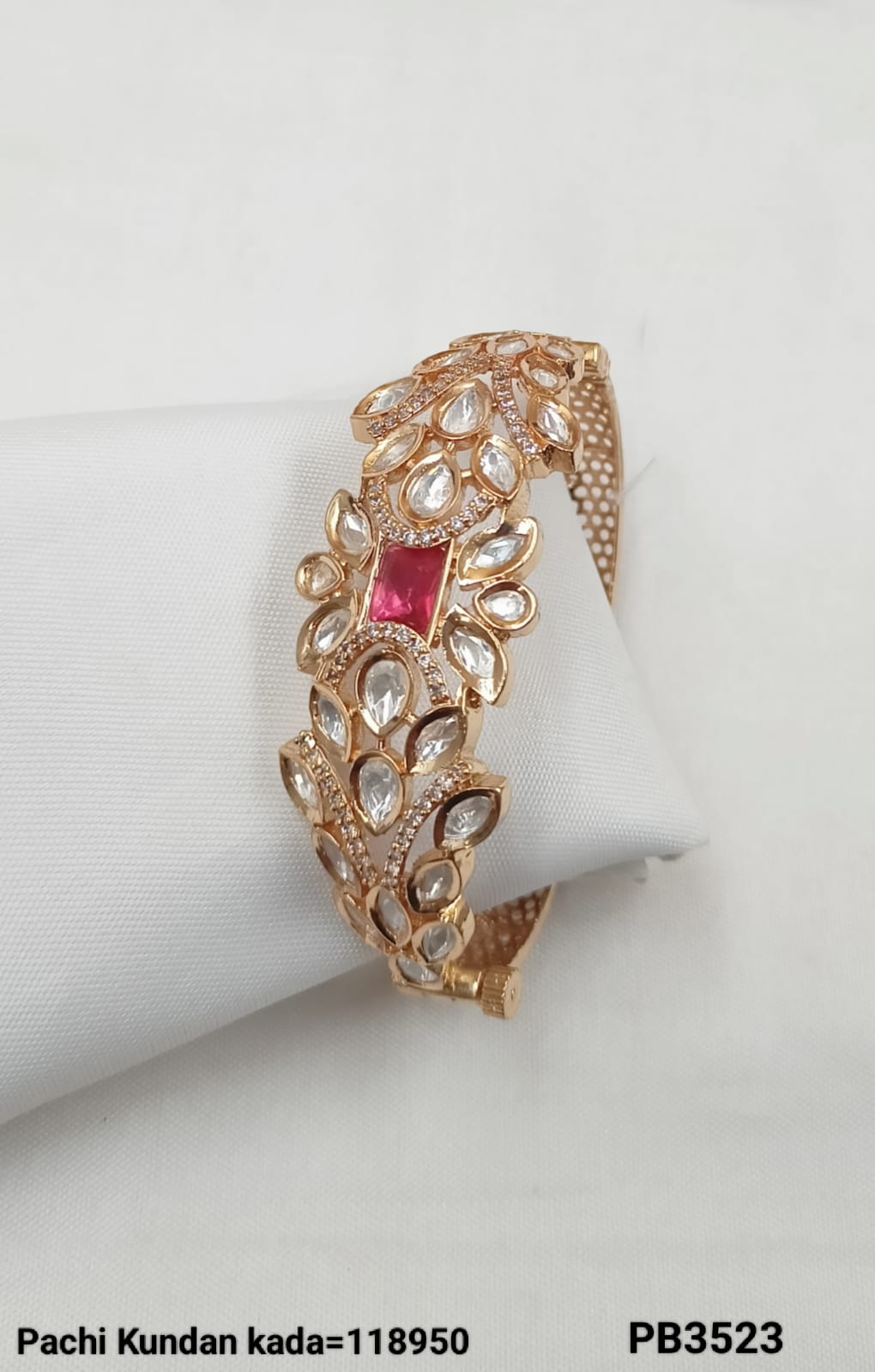 This elegant Pachi Kundan bracelet features a sophisticated gold-plated finish, combining traditional craftsmanship with contemporary style.