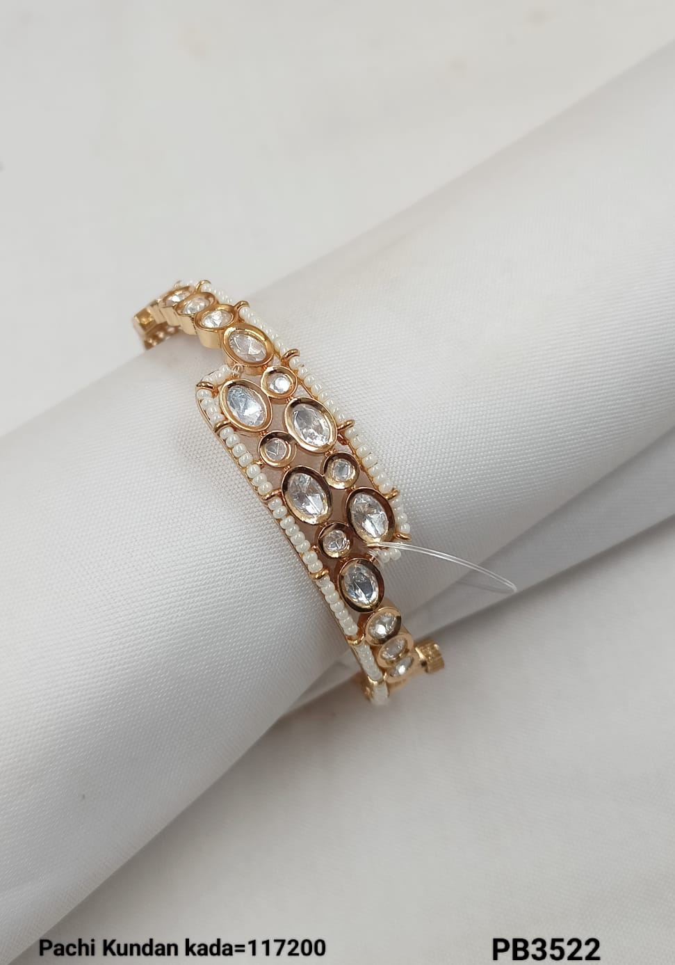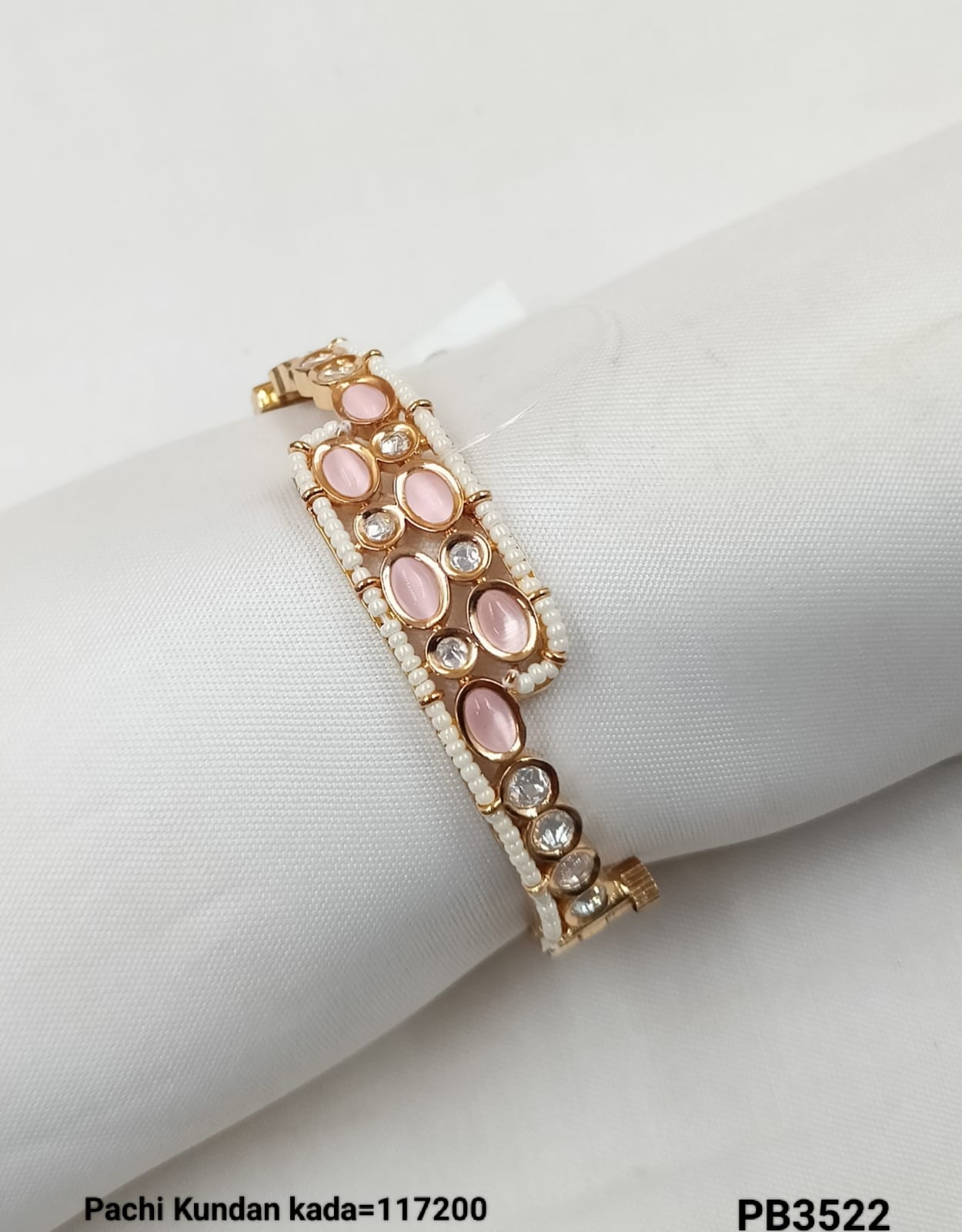 This elegant Pachi Kundan bracelet features a sophisticated gold-plated finish, combining traditional craftsmanship with contemporary style.