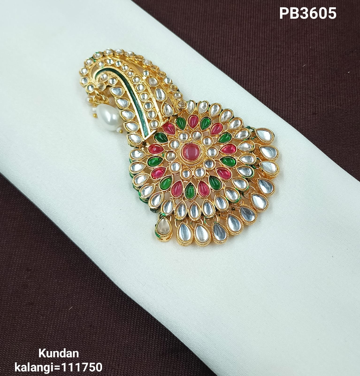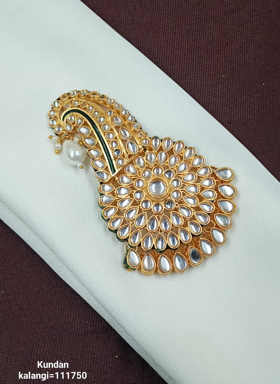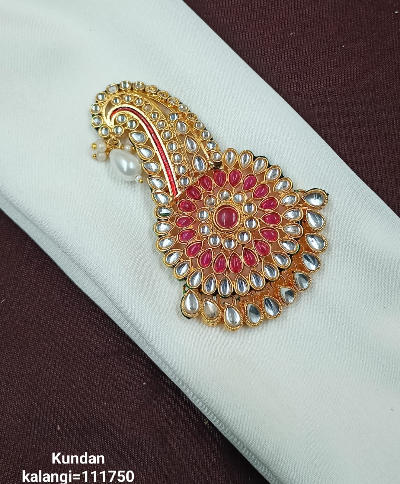 Elevate your traditional ensemble with this stunning floral-inspired CZ Kalangi. Crafted with precision, this kalangi features a radiant circular motif surrounded by high-quality cubic zirconia stones, accented with rich red and green detailing. The intricate arrangement creates a striking design that exudes royalty and cultural grace. Finished with a delicate pearl drop, this kalangi is perfect for grooms and traditional occasions where elegance is a must.