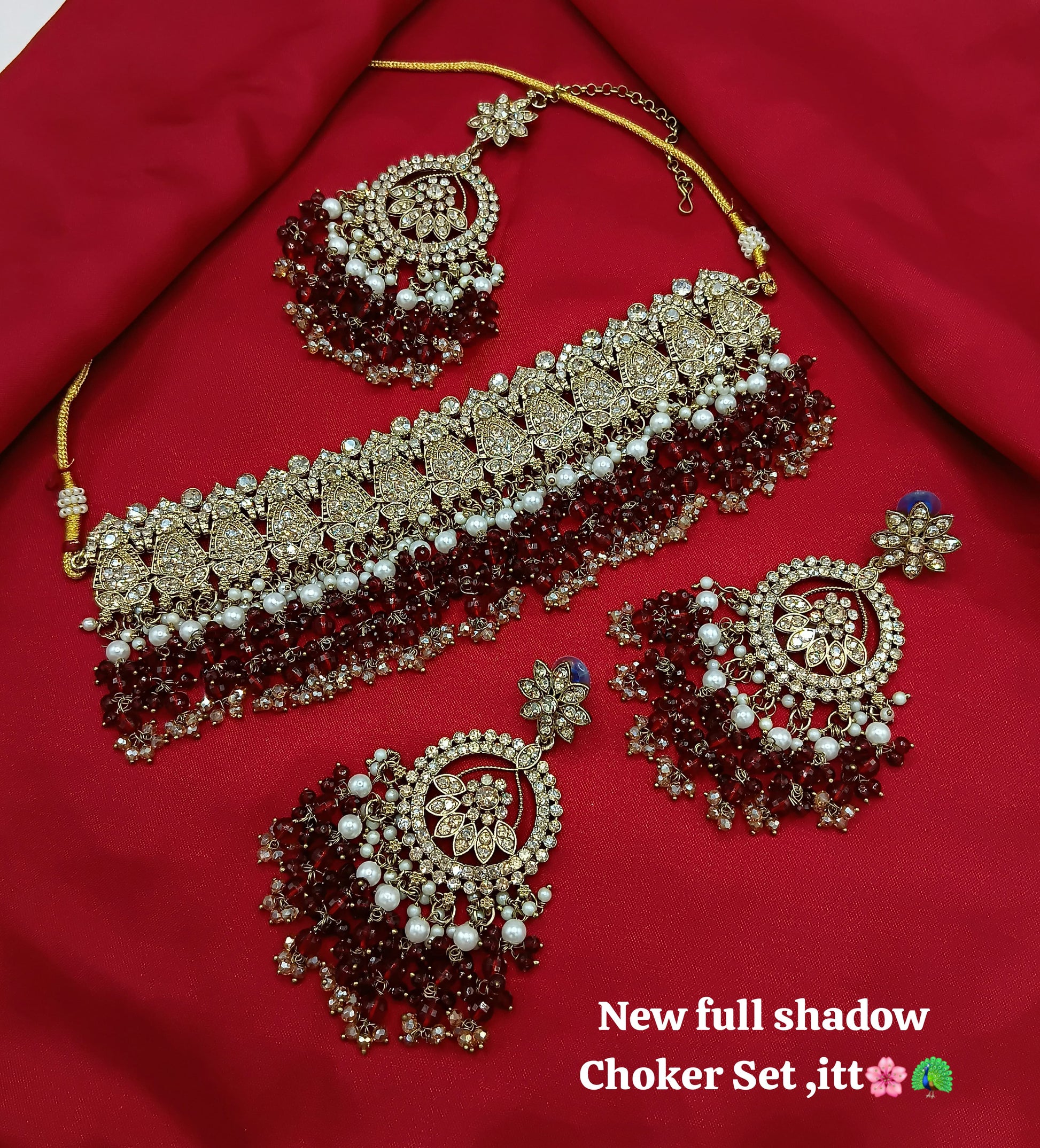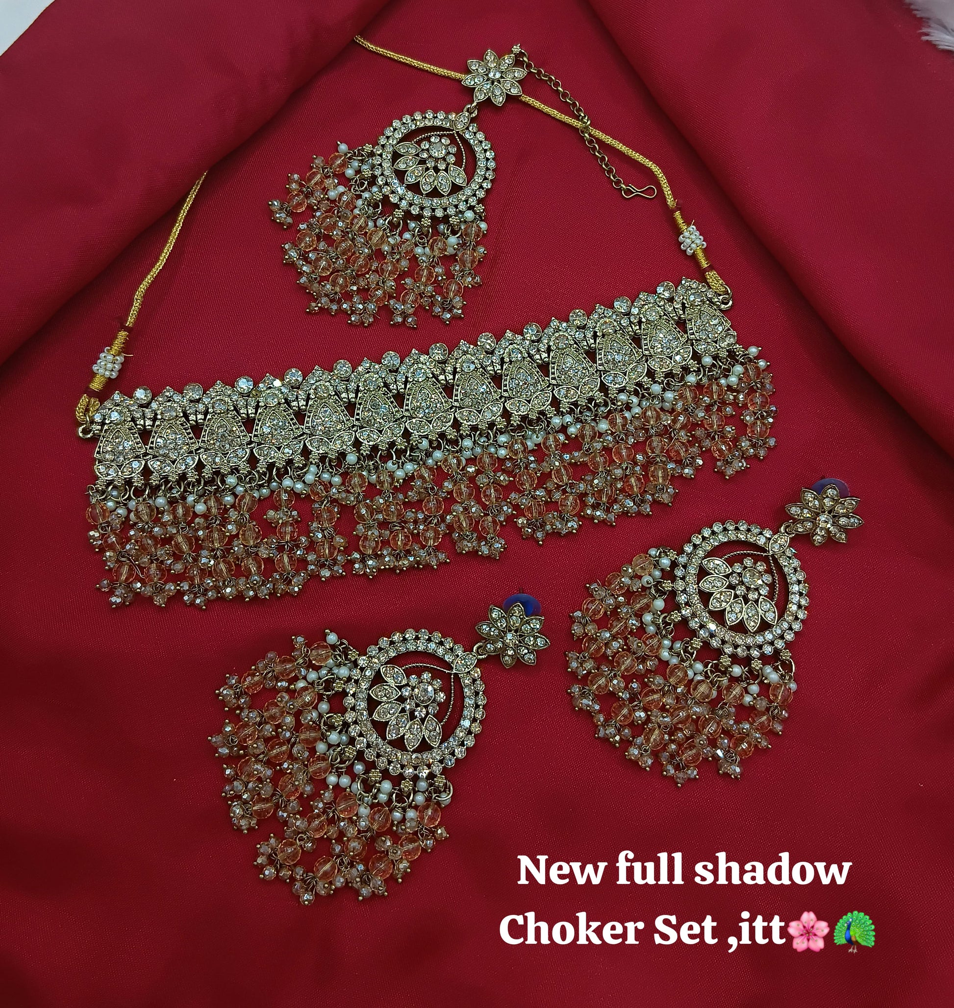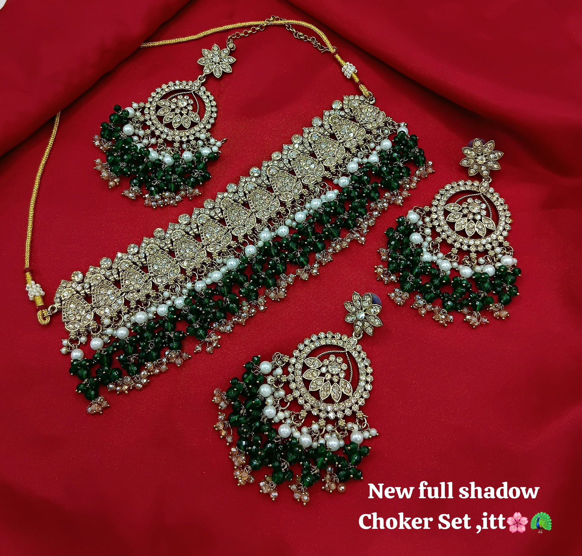 This Full Shadow Choker Necklace Set is an exquisite blend of elegance and traditional charm, featuring intricate floral motifs adorned with sparkling stones. The choker is complemented by layers of green bead detailing and pearl accents, adding a luxurious touch. Matching statement earrings complete the look, making it perfect for weddings, festive occasions, or grand celebrations.
