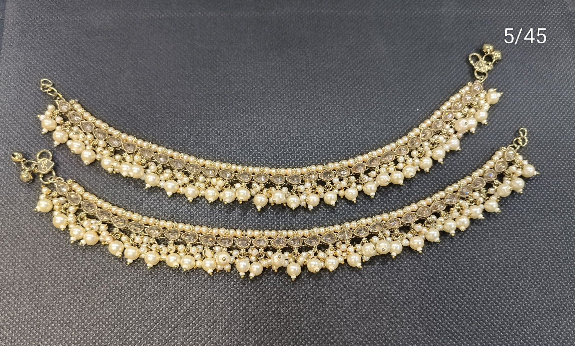 Elevate your ethnic look with this elegant gold-toned pearl payal (anklet) set. Featuring intricate floral designs with embedded stones and classic off-white pearl drops, this anklet adds a graceful charm to bridal and festive wear. Perfectly suited for weddings, traditional ceremonies, or cultural festivities, it offers a blend of timeless beauty and modern craftsmanship.
