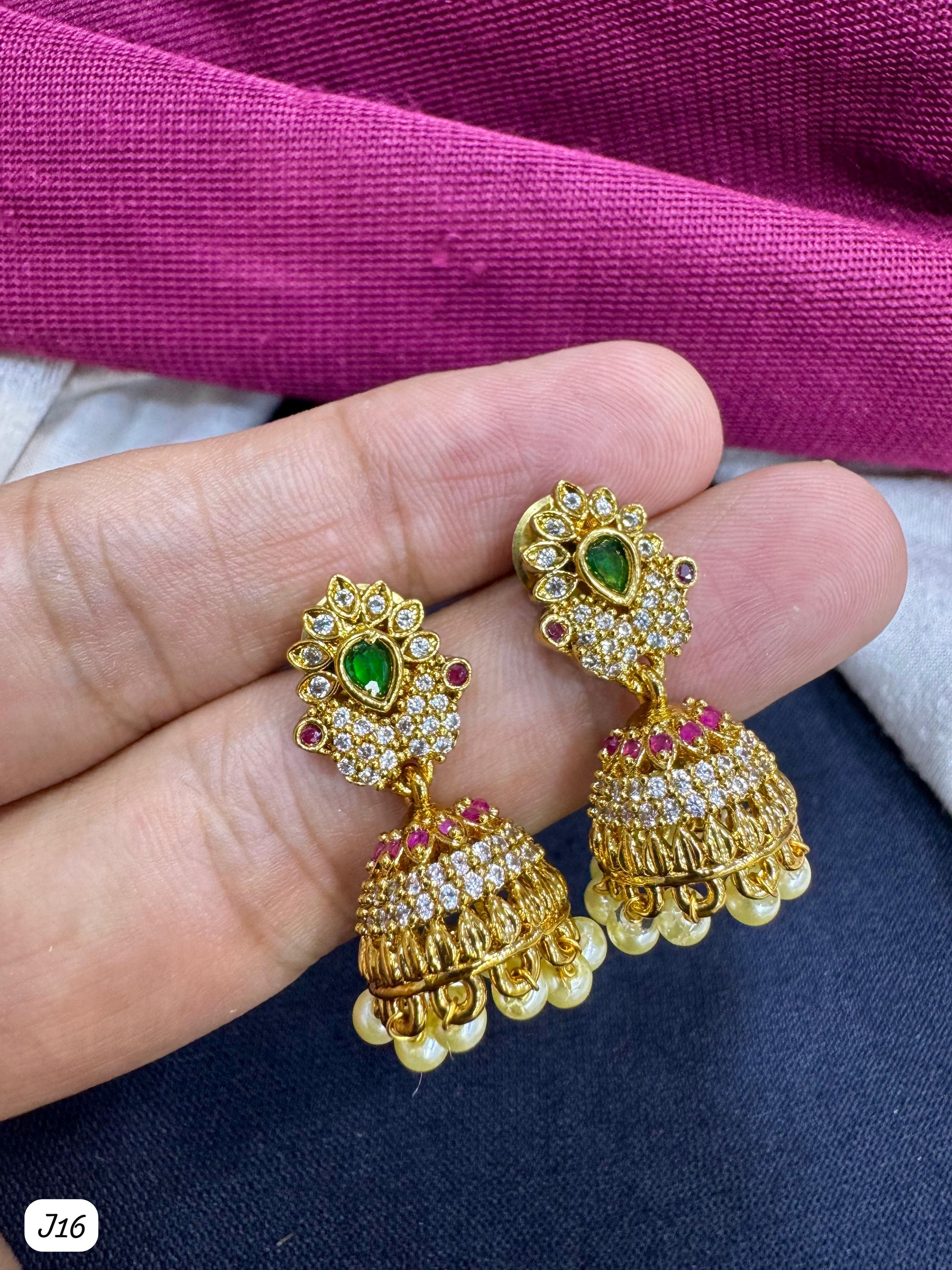 Elevate your ethnic look with these exquisite Traditional Gold-Plated A.D Jhumka Earrings. Featuring a classic teardrop green stone centerpiece, shimmering white CZ stones, and vibrant ruby accents, these earrings blend elegance and tradition flawlessly. The dome-shaped jhumka is embellished with pearl bead hangings, making them perfect for weddings, festivals, and special occasions. Crafted with intricate detailing, they’re a must-have addition to any jewelry collection.