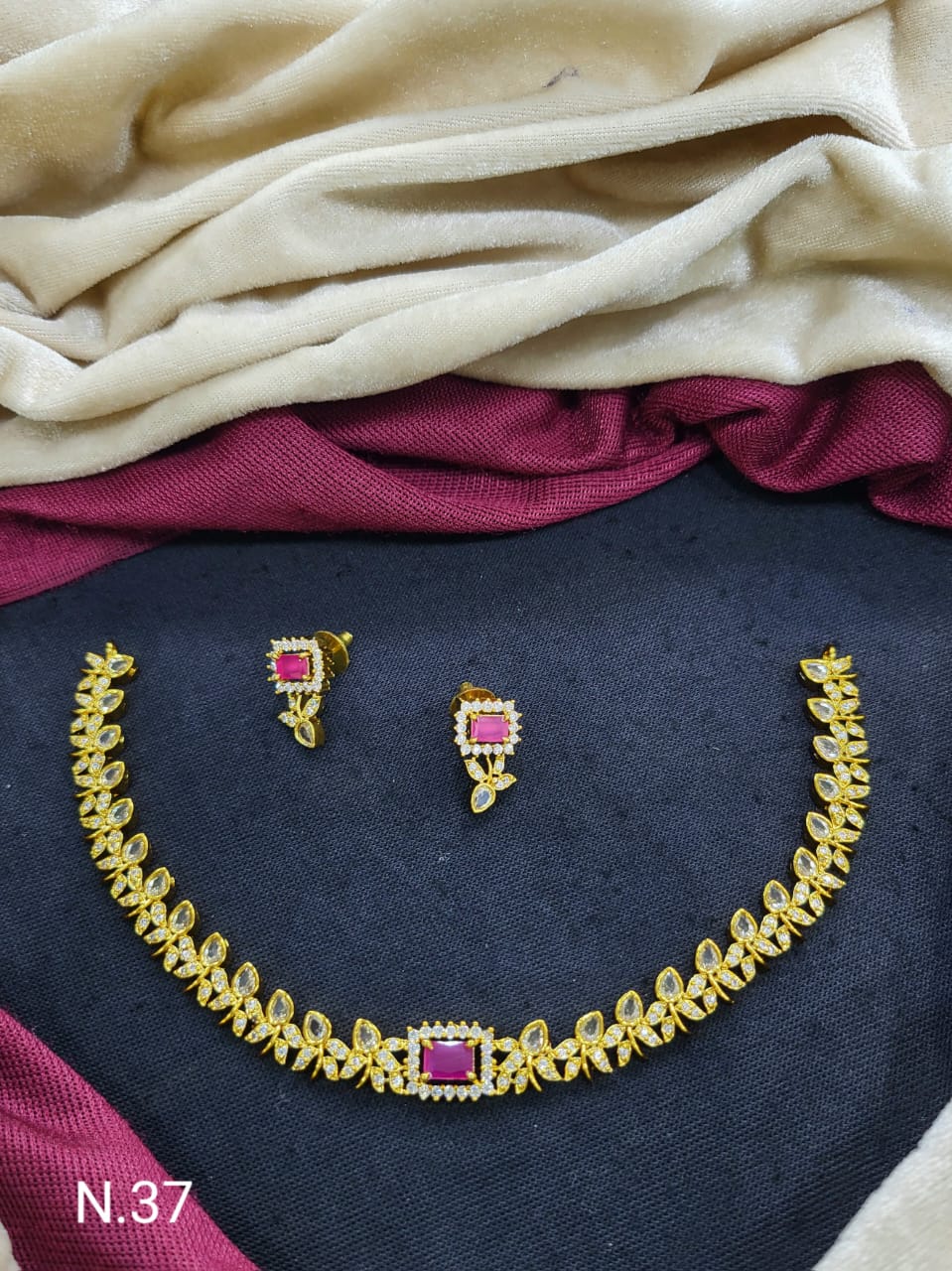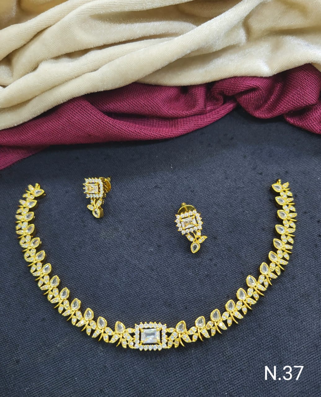 Elevate your style with this elegant AD stone choker necklace set, beautifully crafted with intricate floral detailing and a rectangular centerpiece. The matching earrings complement the necklace perfectly, making it a graceful choice for weddings, festive occasions, or traditional celebrations. This set blends timeless charm with modern elegance, ideal for those who love standout yet classy jewelry.