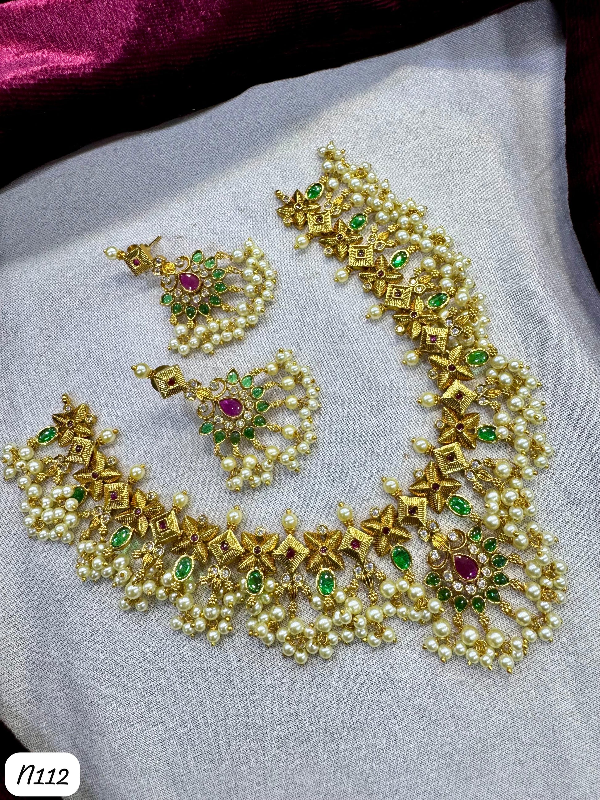 Elevate your traditional look with this exquisite pearl cluster necklace set, beautifully crafted with intricate gold-toned floral designs. Adorned with sparkling green and pink stones, this set includes a stunning necklace and matching earrings that add a touch of elegance and charm. Perfect for weddings, festivals, and special occasions, this jewelry set complements ethnic outfits and brings timeless grace to your ensemble.
