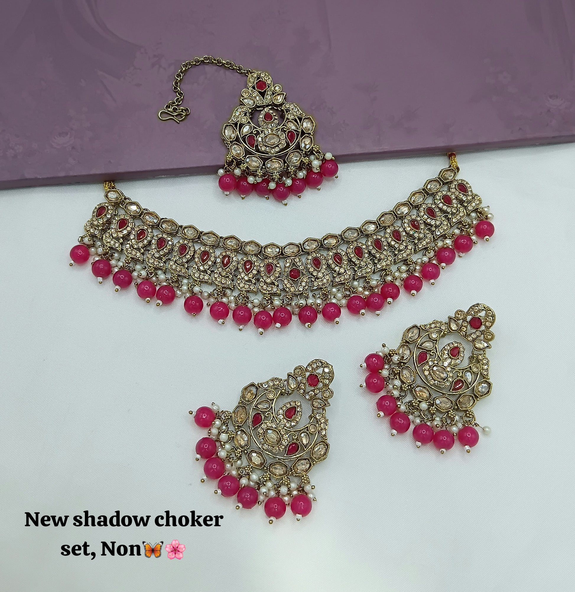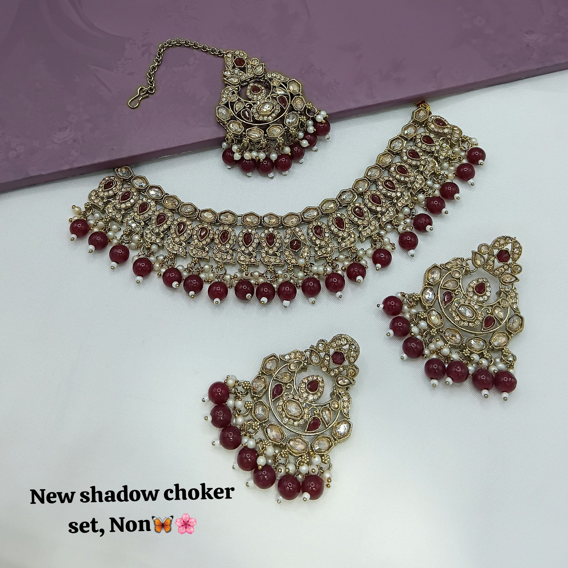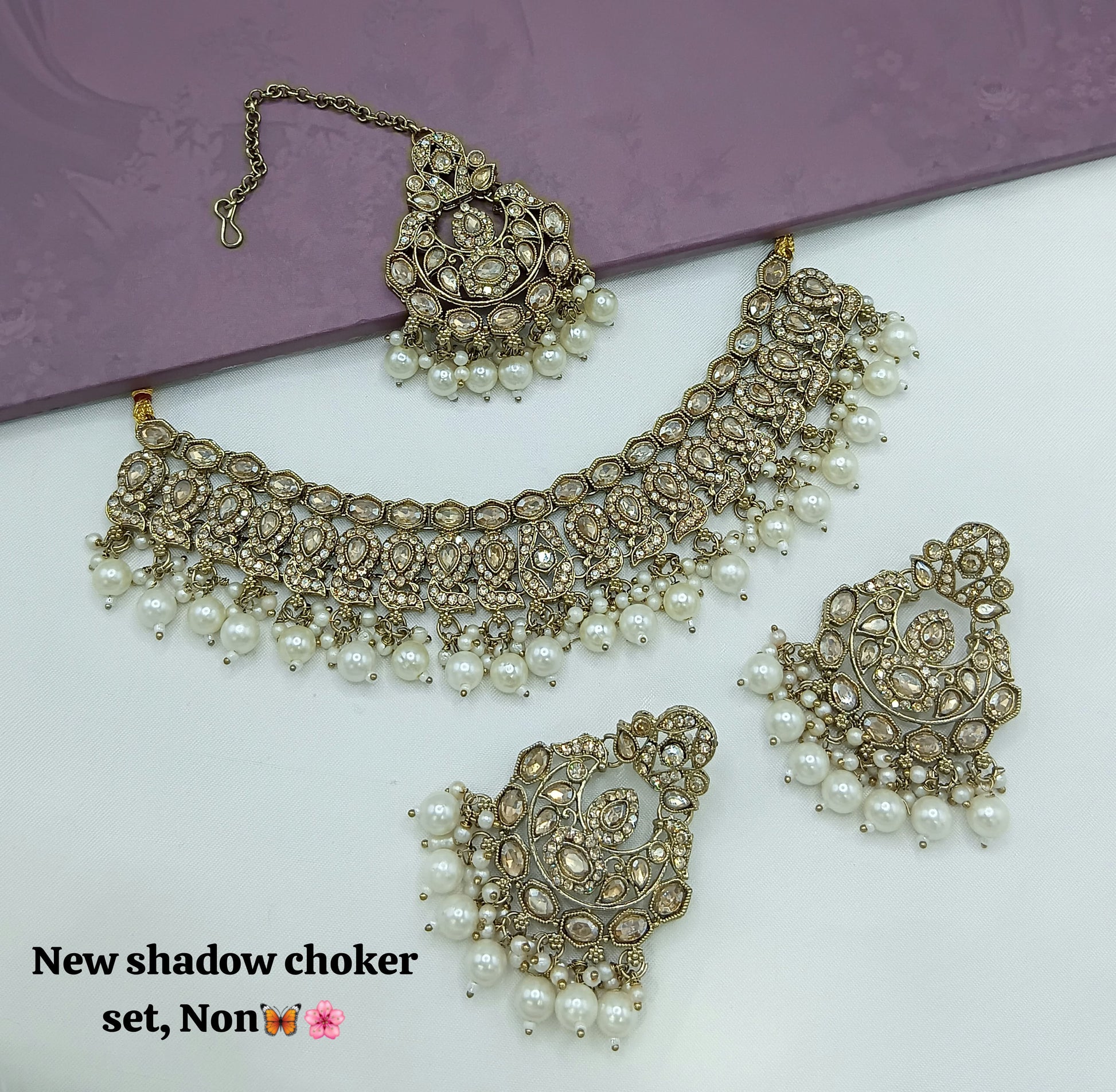Designer Shadow Choker Necklace Set with Earrings & Maang Tikka – Premium Finish