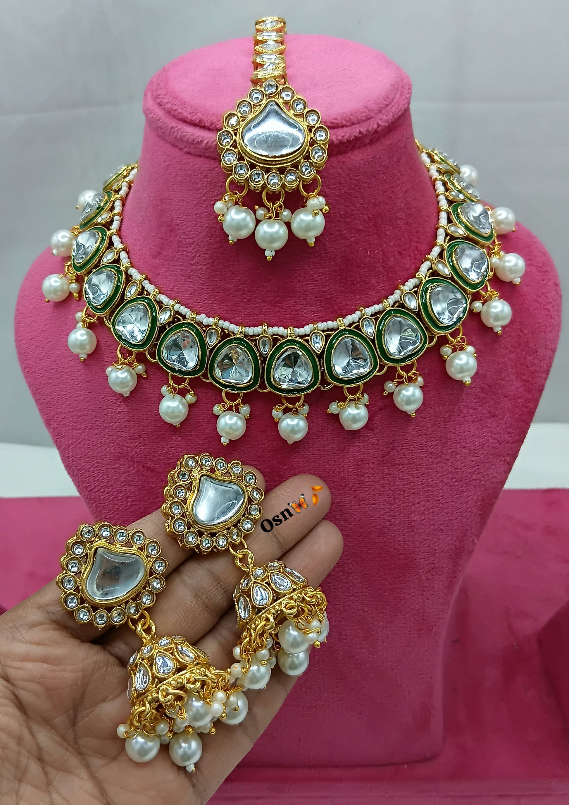 Add a touch of timeless elegance to your collection with this stunning gold-plated pearl necklace set, perfectly paired with matching statement earrings. Intricately designed with clear reflective stones surrounded by delicate pearls, this set beautifully blends traditional craftsmanship with modern charm. Ideal for weddings, festivals, or special occasions, it will elevate any outfit with its sophisticated appeal and intricate detailing.
