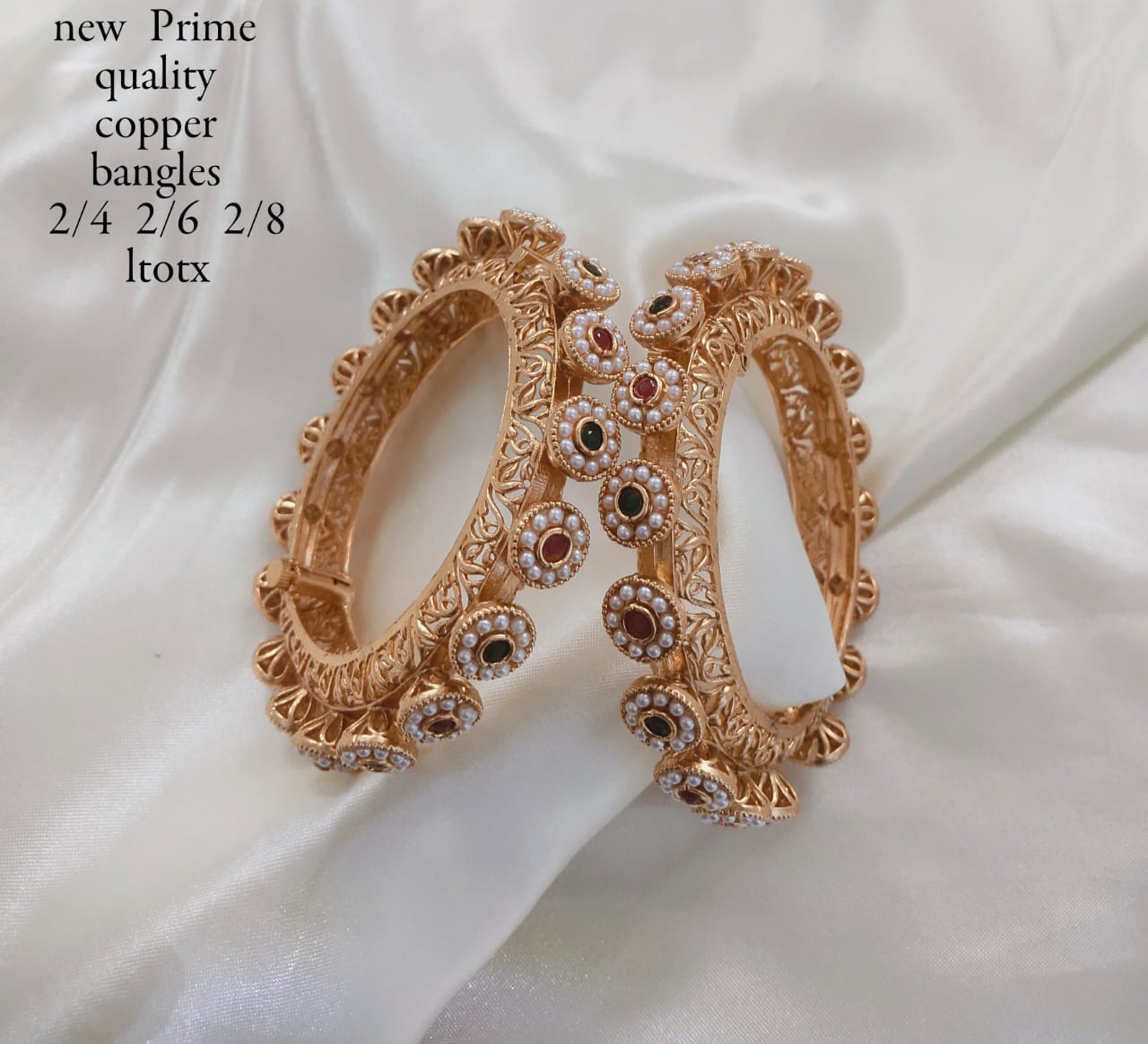 These elegant Gold Plated Copper Bangles are a must-have accessory for any fashionable individual. Crafted with high-quality materials, these bangles offer a touch of luxury to any outfit. With their stunning gold plating, these bangles are sure to make a statement and elevate your style to the next level.