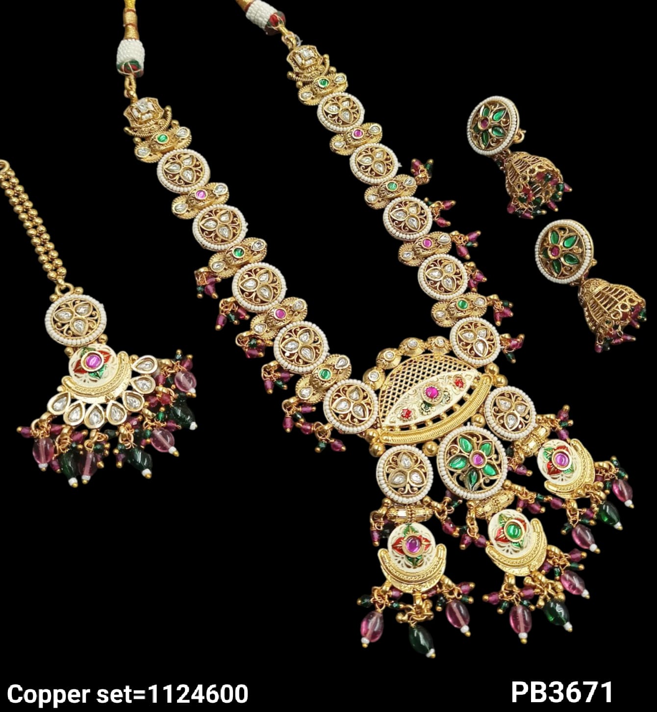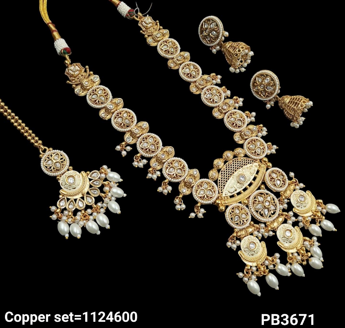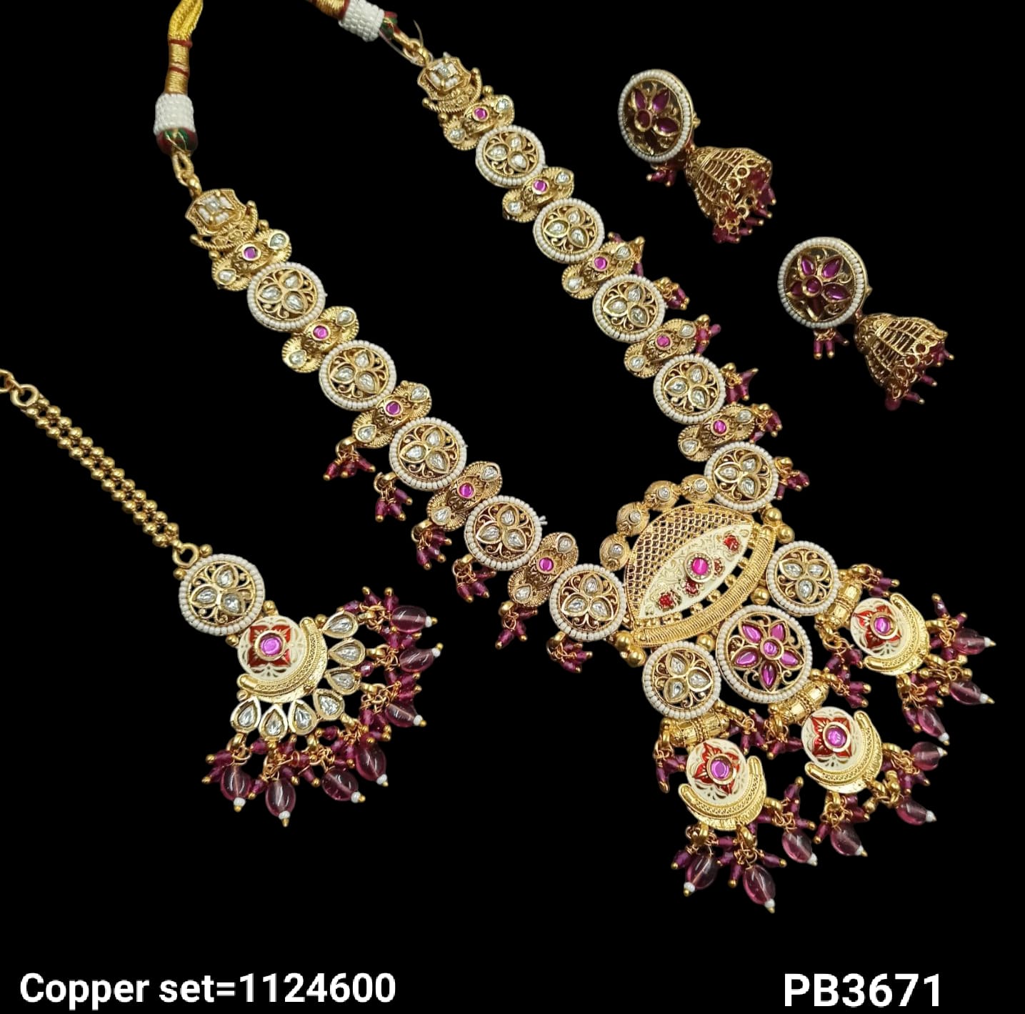 This necklace set is crafted from copper and finished with a layer of gold plating, combining durability with elegant design.