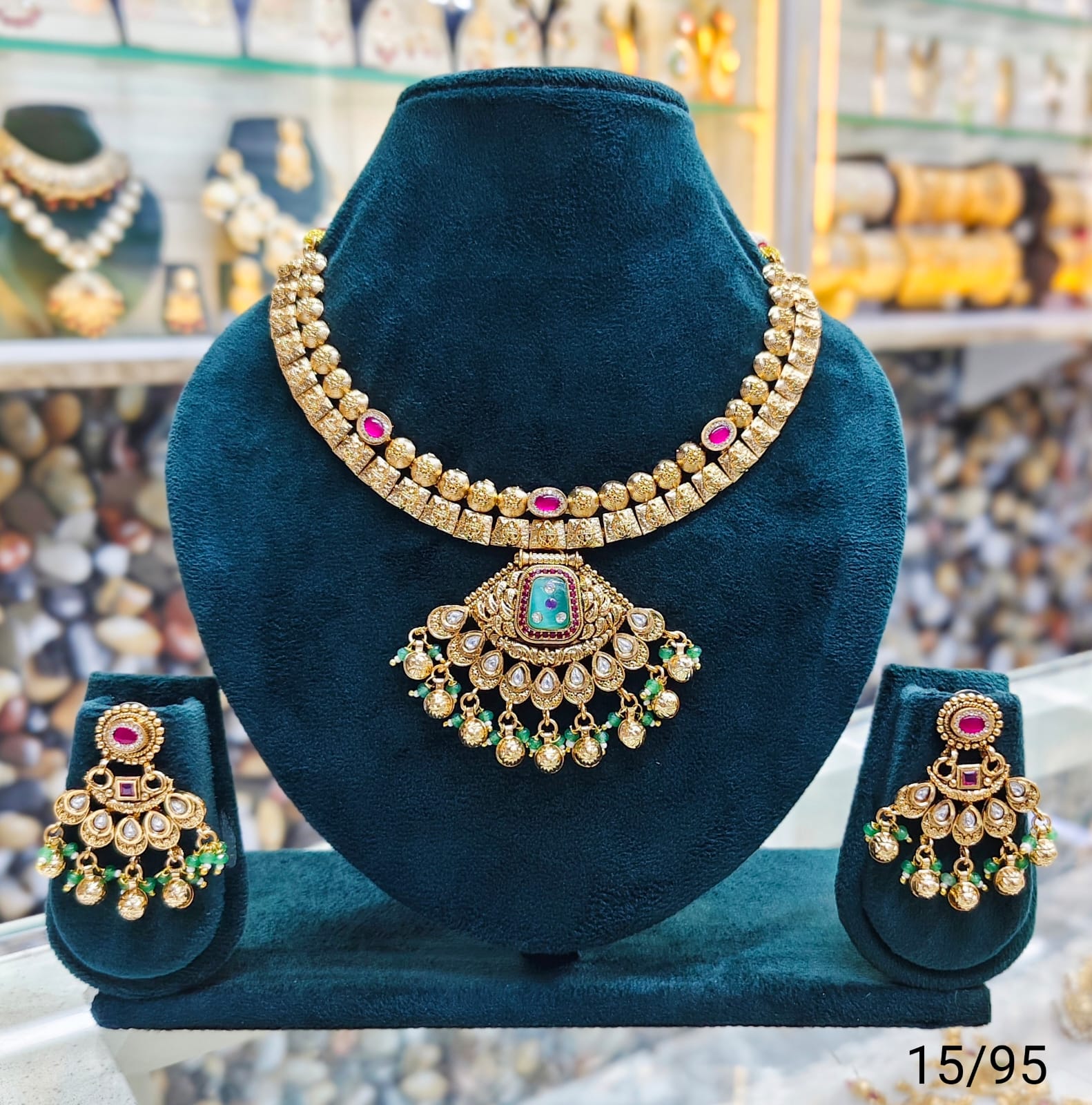 This exquisite traditional necklace set features intricate craftsmanship with a stunning pendant centerpiece, adorned with detailed embellishments and sparkling stones. Perfect for special occasions and festive events, this set beautifully combines elegance and cultural charm. The matching earrings complement the necklace, adding a cohesive and graceful touch to your overall look.