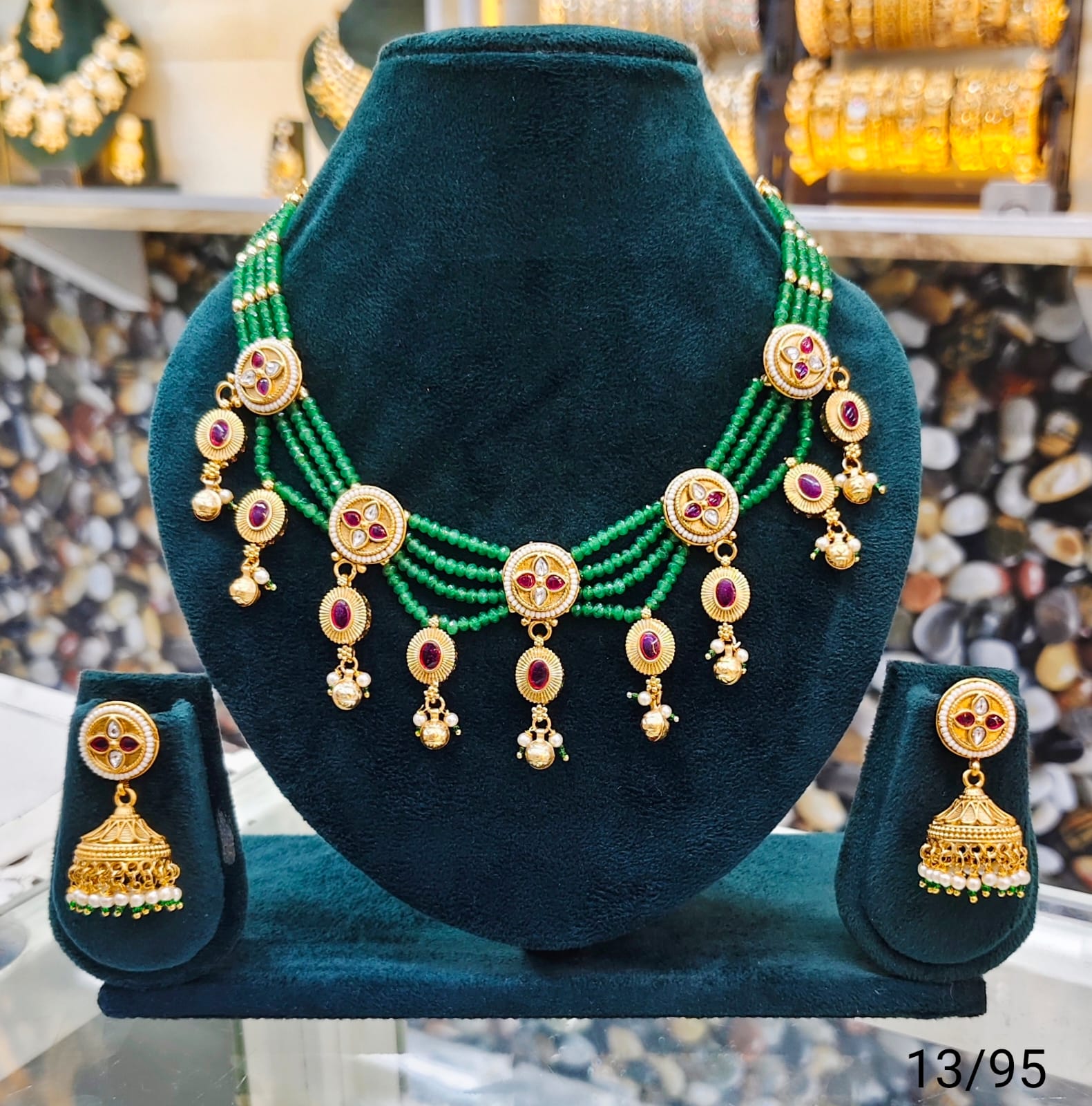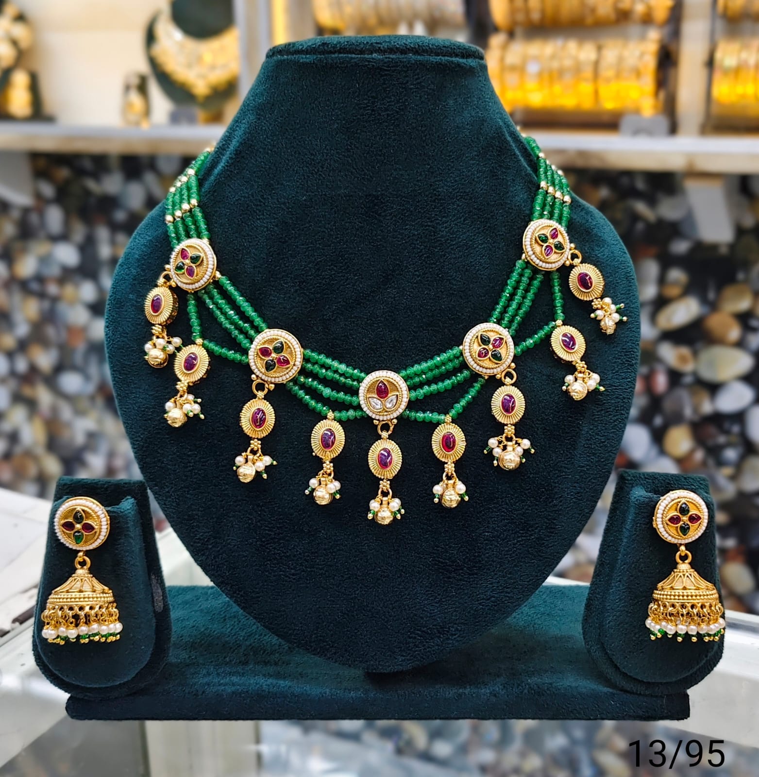 Elevate your traditional look with this exquisite Green Beaded Necklace and Jhumka Earring Set. Crafted with precision, the necklace features multiple strands of vibrant green beads beautifully complemented by intricate gold-tone pendants adorned with colorful gemstones and delicate pearl accents. The matching jhumka earrings enhance the ensemble with their classic design and detailed craftsmanship. Perfect for weddings, festivals, or special occasions, this set adds a touch of elegance and timeless charm to any outfit.
