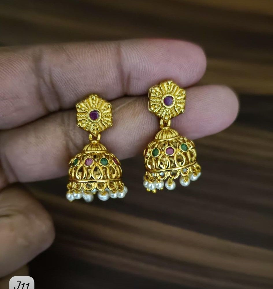 Elevate your traditional look with these exquisite Gold Jhumka Earrings, beautifully crafted to blend elegance and heritage. Featuring intricate designs adorned with vibrant ruby and emerald-colored stones, these earrings are completed with delicate pearl drops that add a graceful charm to every movement. Perfect for weddings, festivals, or any special occasion, these lightweight jhumkas will complement both ethnic and fusion outfits effortlessly.