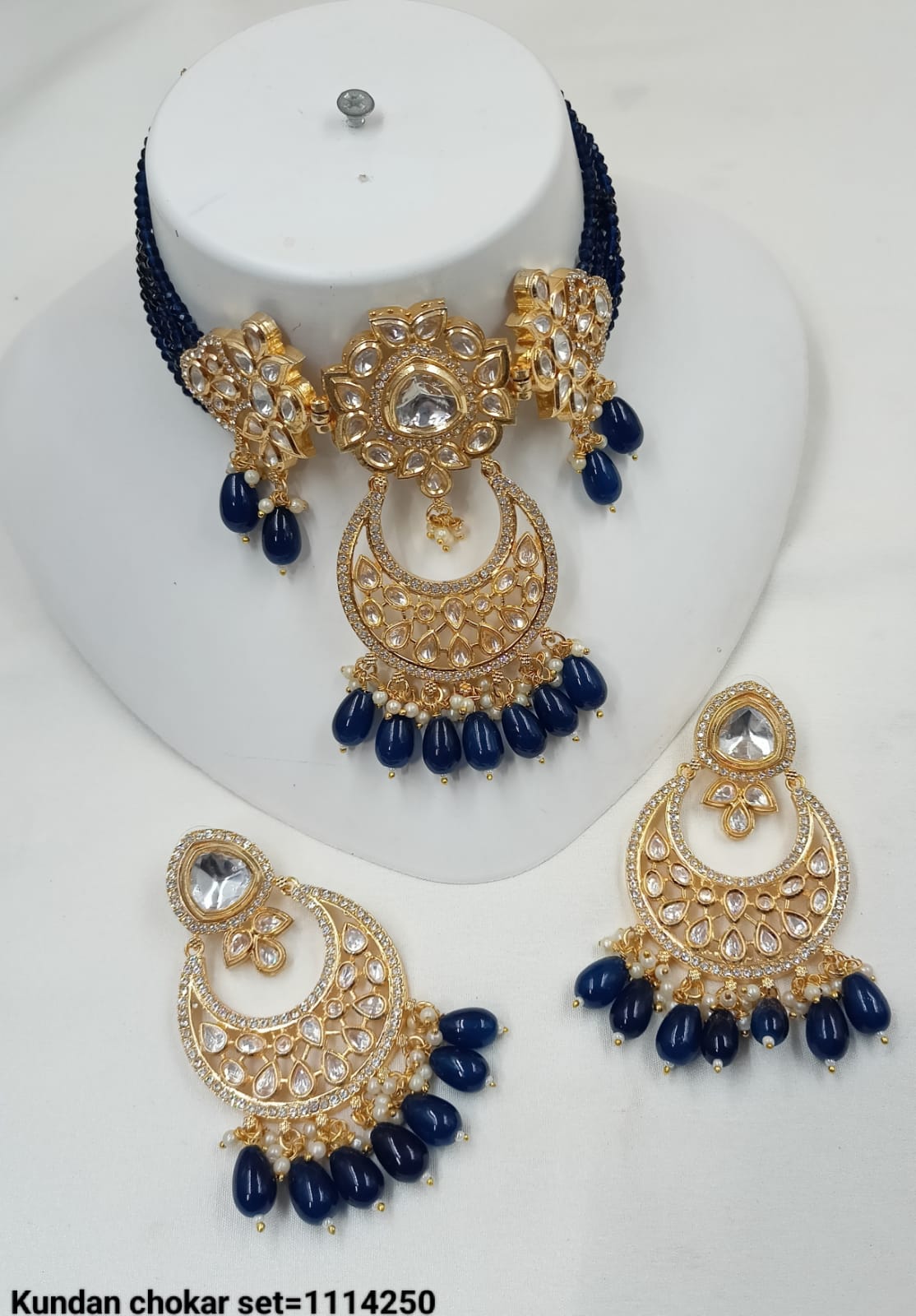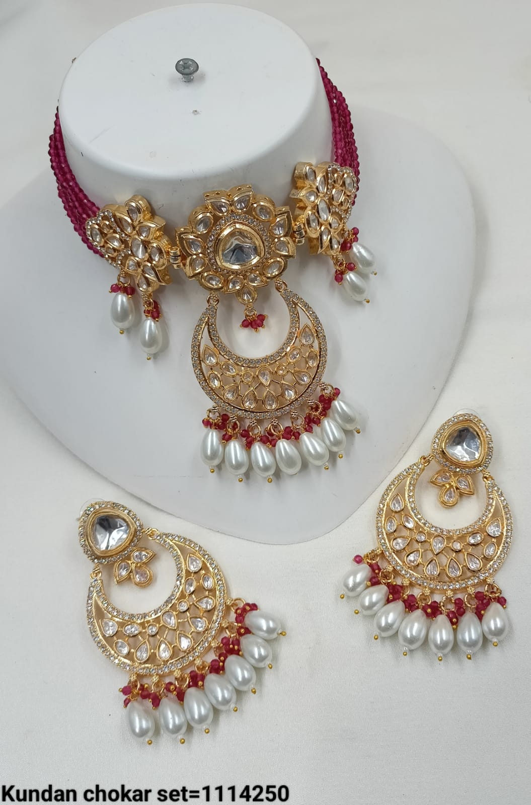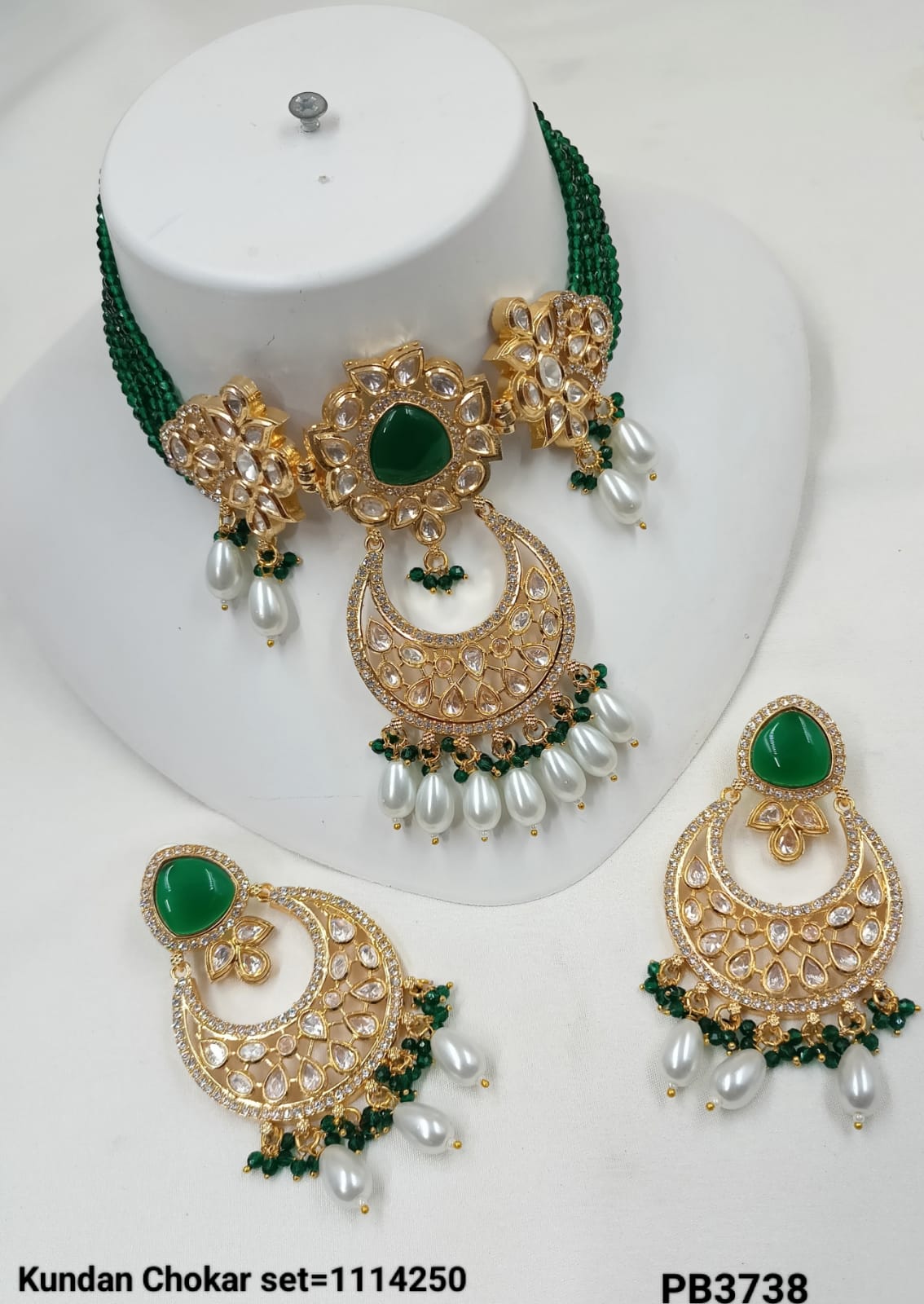 This exquisite choker necklace set features intricate Kundan work, elegantly finished with a gold-plated coating for a luxurious and timeless appeal.