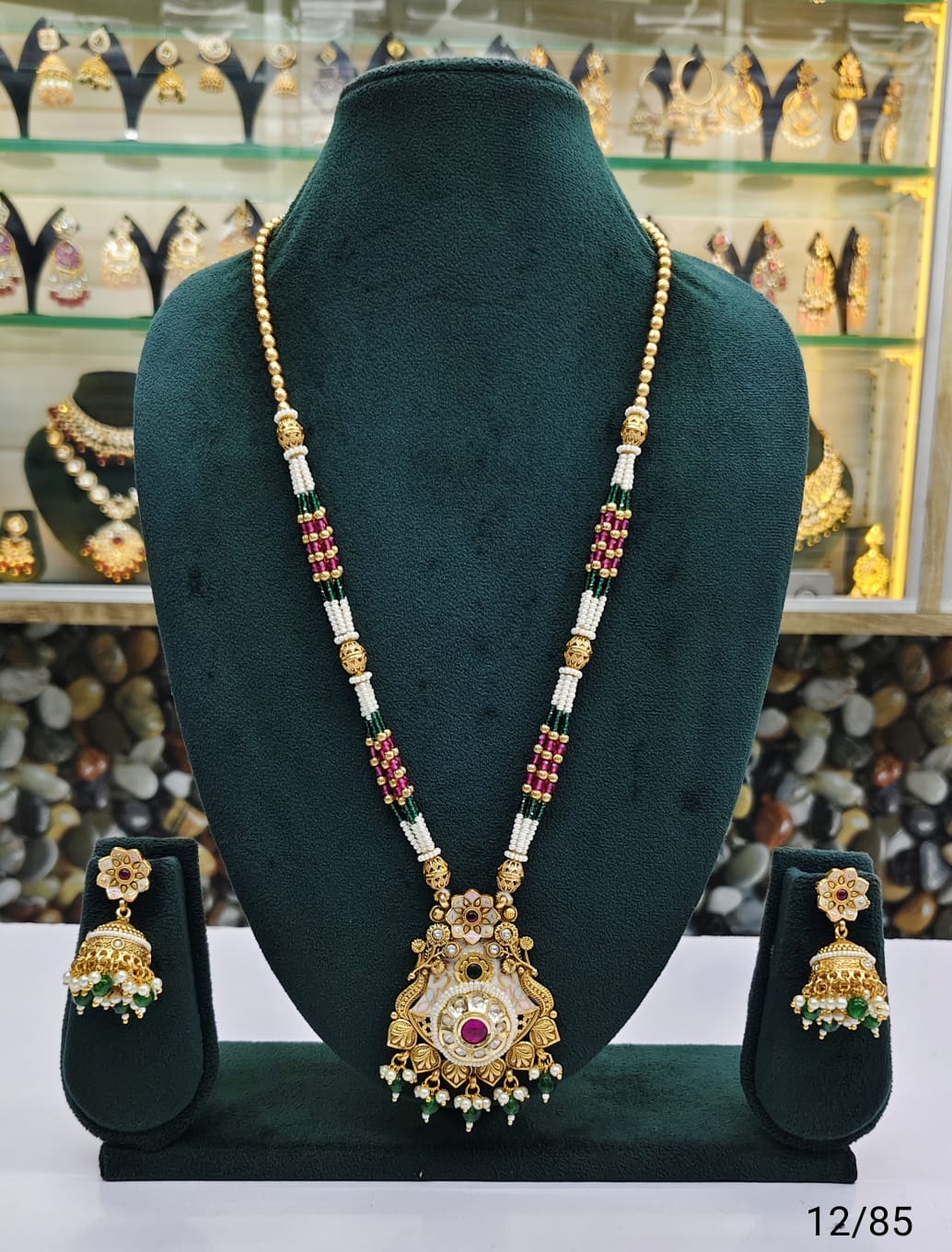 This exquisite traditional necklace set showcases intricate craftsmanship with delicate pearl beadwork and a beautifully designed pendant. Perfectly paired with matching jhumka earrings, this set adds a timeless charm to any ethnic or festive outfit. Made with premium copper and detailed embellishments, it offers both elegance and durability, making it an ideal choice for special occasions and celebrations.