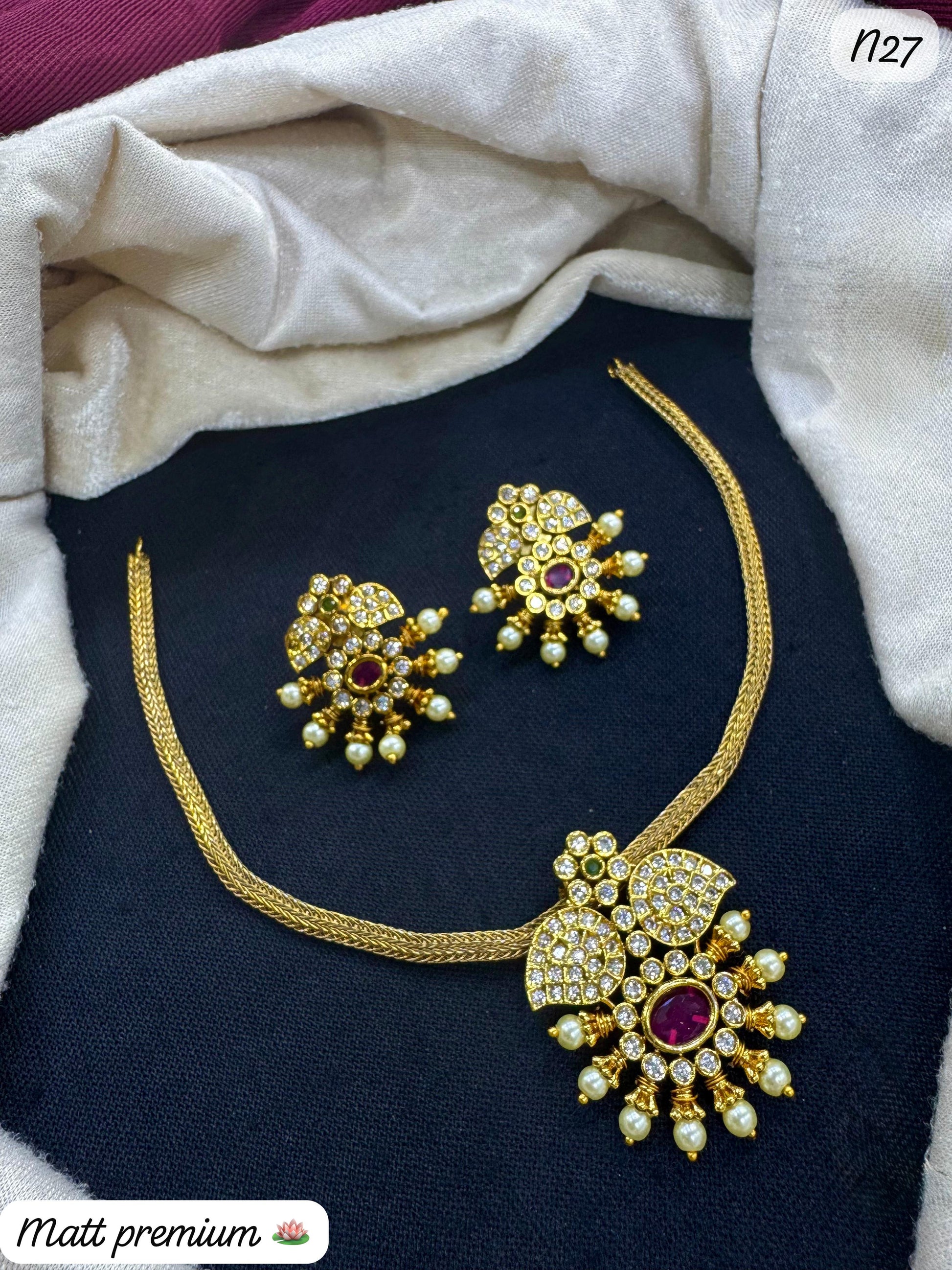 Add a touch of elegance and sparkle to your look with this beautifully crafted Gold-Plated Necklace Set, adorned with premium American Diamond (AD) stones, delicate pearl hangings, and a striking central ruby-colored stone. The unique floral-inspired design is both timeless and graceful, making it perfect for festive occasions, weddings, and traditional gatherings. The matching stud earrings complement the necklace beautifully, creating a complete and sophisticated ensemble.