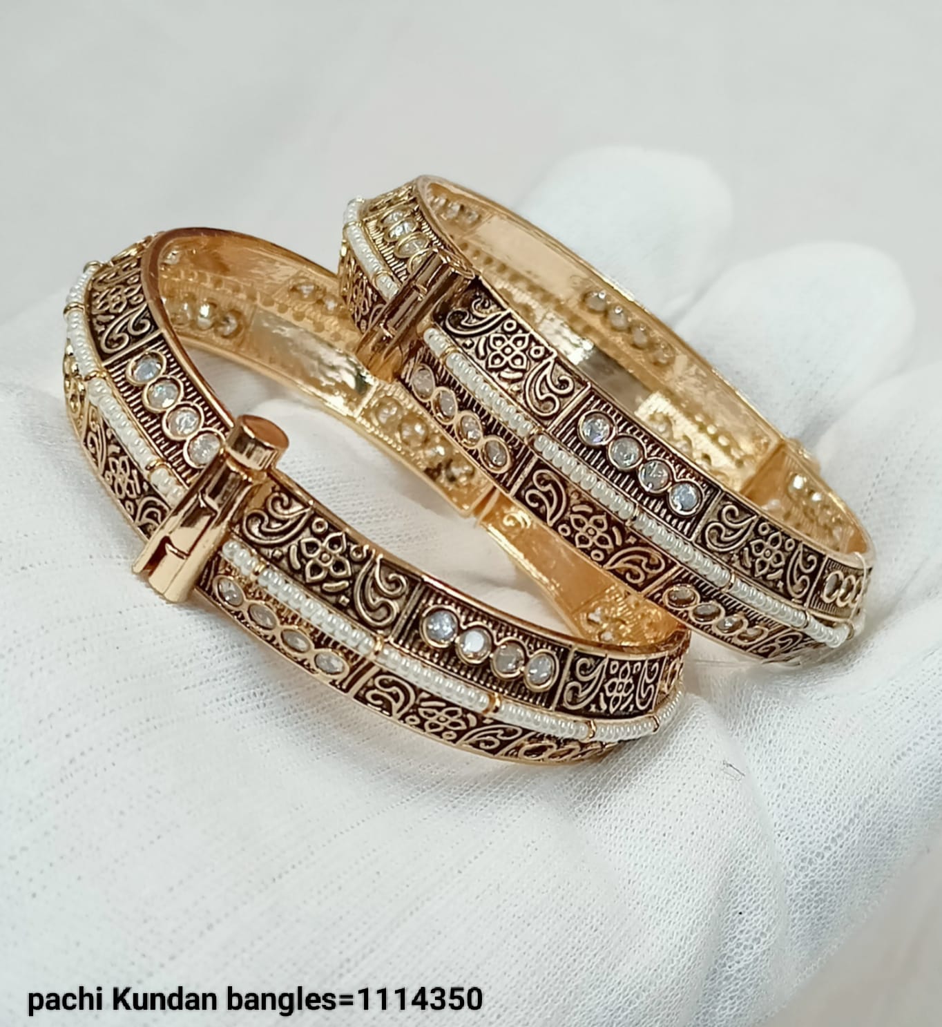 Elevate your ethnic charm with these exquisite Pachi Kundan Bangles, meticulously crafted with traditional detailing and antique gold plating. Featuring stunning Kundan stones and intricate filigree work, these bangles reflect timeless Indian craftsmanship. Perfect for weddings, festive occasions, or cultural celebrations, they add a regal touch to any ensemble. Whether you're the bride or a guest, these statement bangles are a must-have in your jewelry collection.