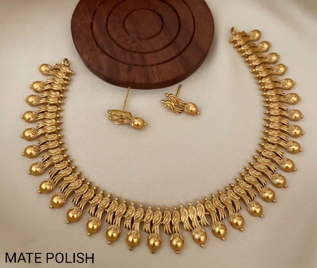This gold-plated temple jewellery set combines timeless elegance with modern flair. Featuring intricate designs and exquisite craftsmanship, this set is perfect for adding a touch of sophistication to any outfit. Made with high-quality materials, this set is both durable and luxurious. Elevate your style with this stunning set.